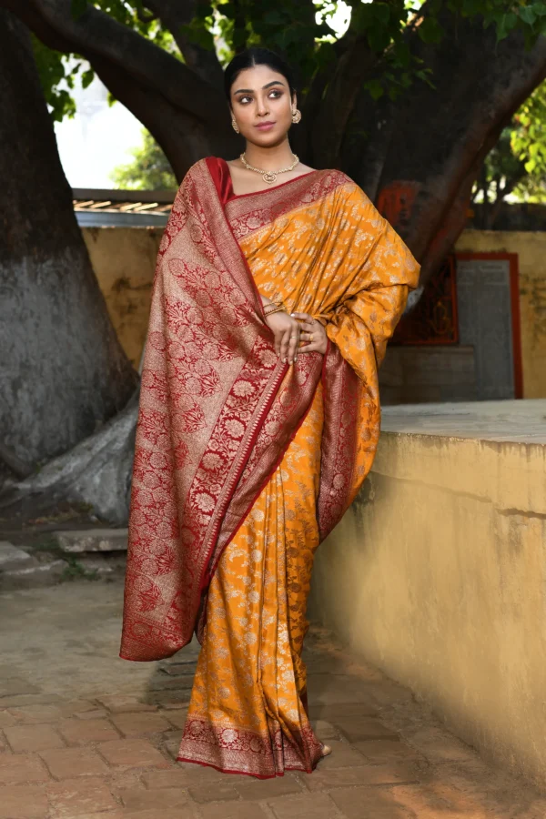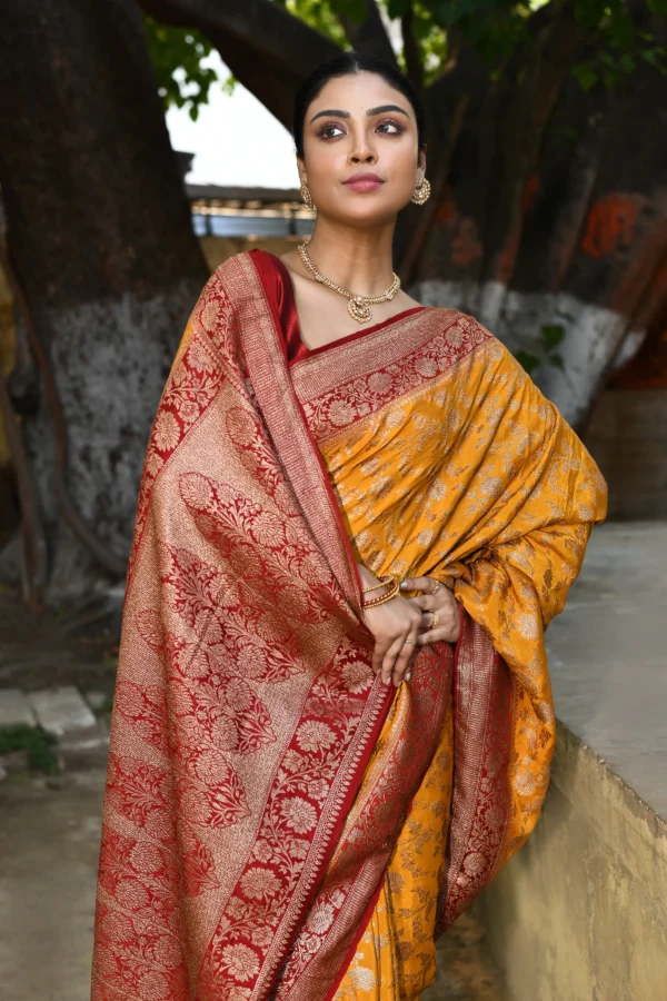 Introducing a radiant marigold yellow saree adorned with intricate gold zari floral and traditional motifs woven across the body. Highlighted by a classic red contrast border and pallu with richer gold zari detailing, this elegant drape comes with a matching running blouse pieceperfect for festive and celebratory occasions.