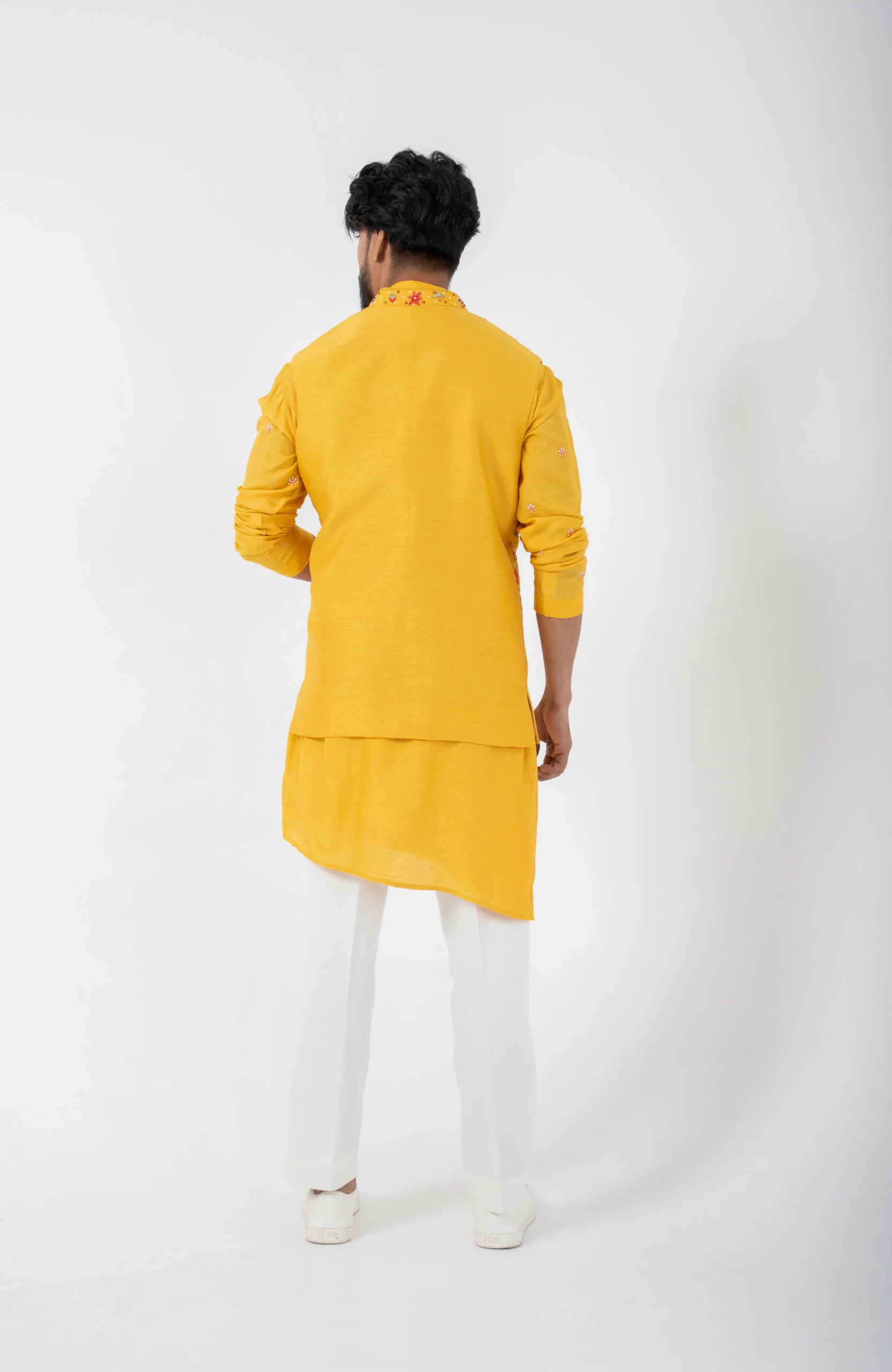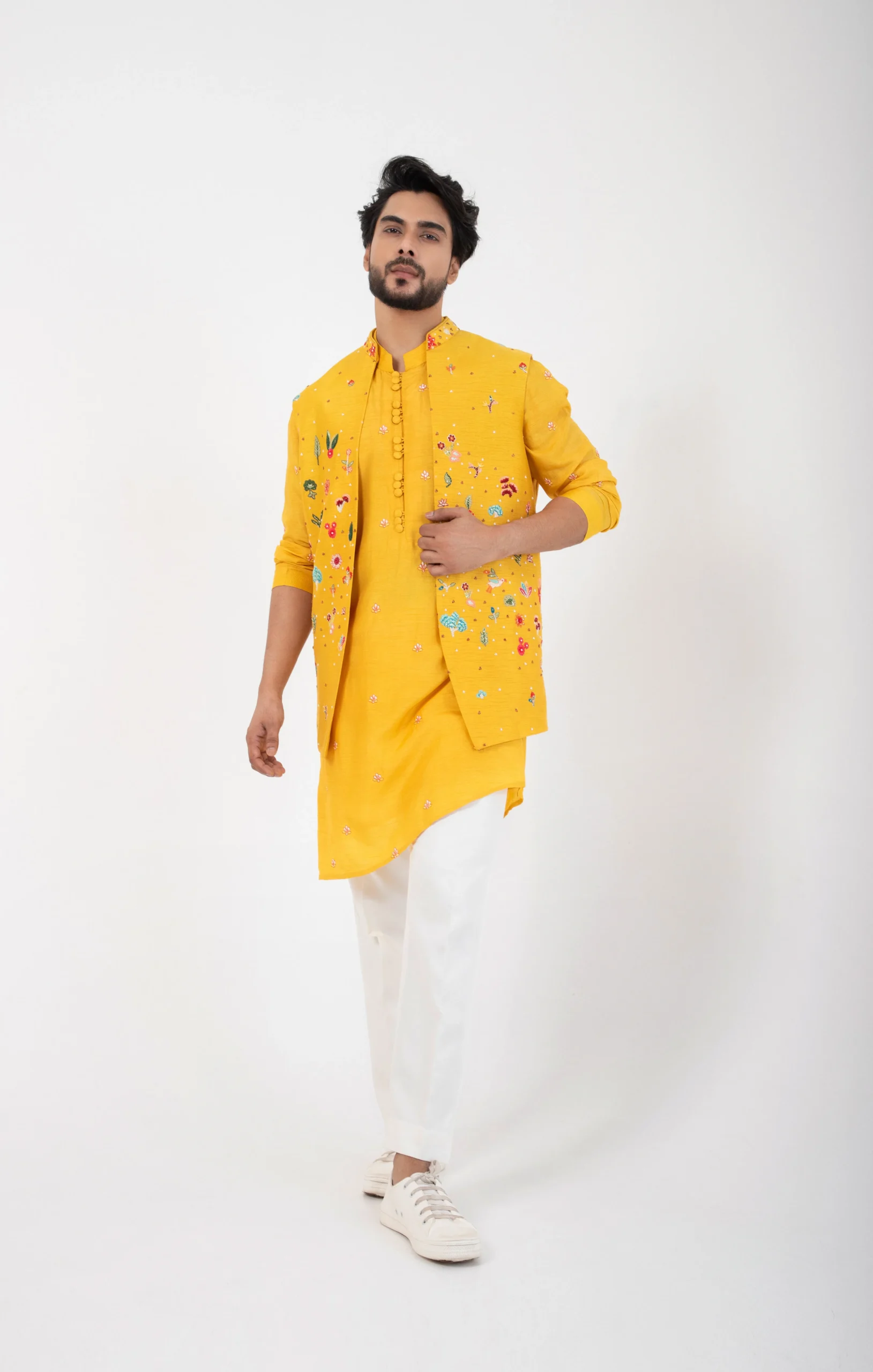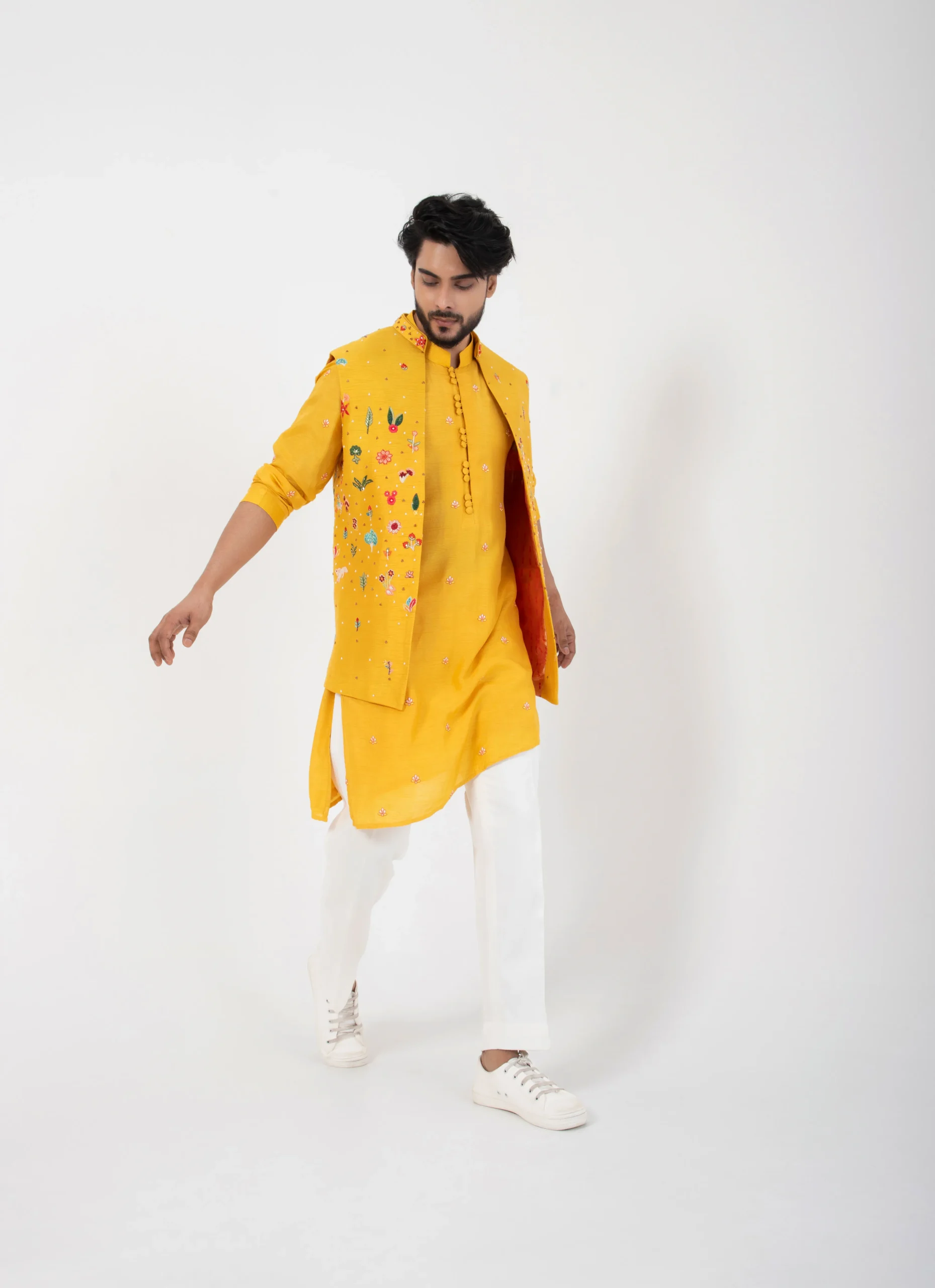 Introducing our Marigold Yellow Embroidered Nehru Jacket, a masterclass in festive elegance. Crafted from premium textured fabric, it features vibrant, intricate hand-embroidery that adds a playful yet sophisticated touch. The classic mandarin collar and tailored fit make it a versatile statement piece for weddings or celebrations. Elevate your traditional look with this bold, artistic silhouette.
