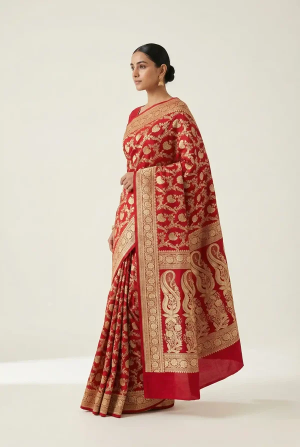 Pair with antique gold, temple or kundan jewellery and style with a silk potli or embroidered clutch to complete its classic Banarasi look.