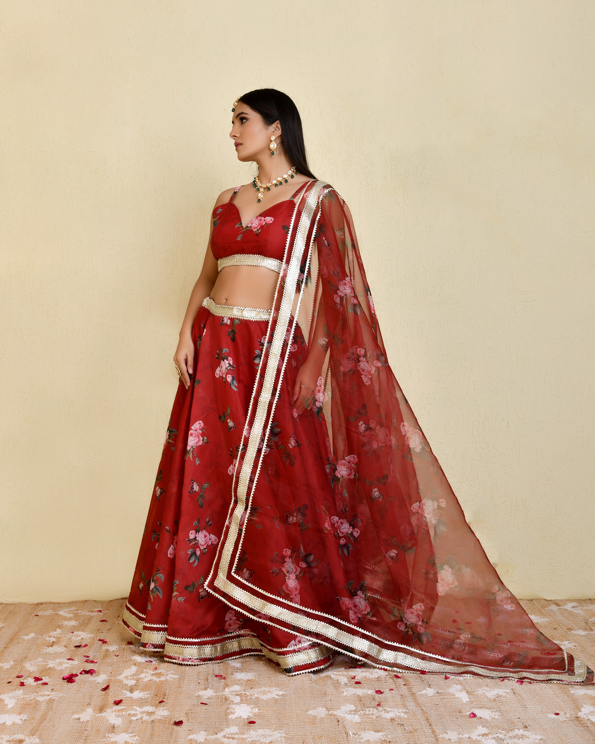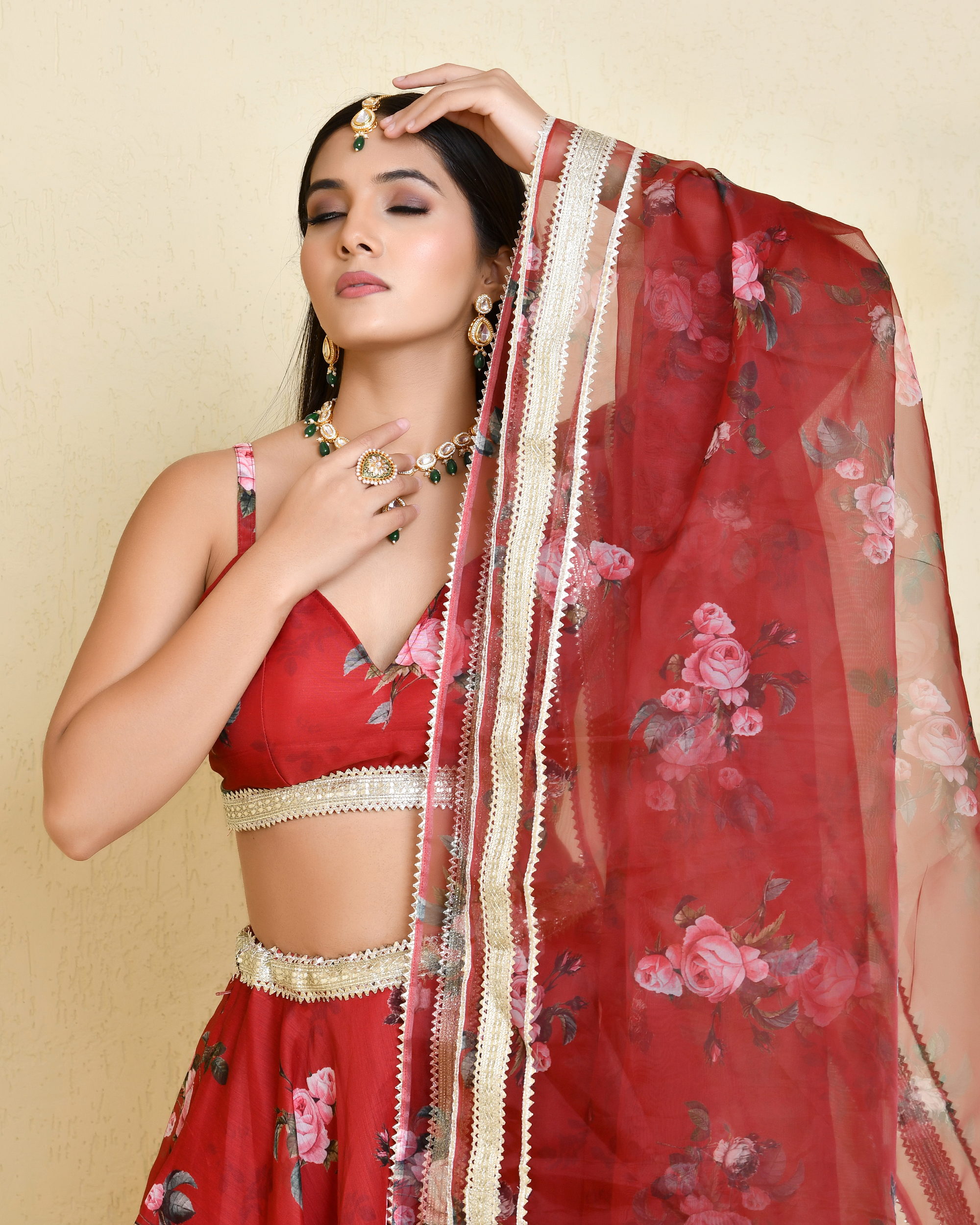 Introducing a maroon chanderi printed lehenga set. Crafted in premium printed chanderi fabric, the lehenga offers a rich yet lightweight feel. It is paired with a matching padded blouse, beautifully finished with delicate lace detailing. The look is completed with a coordinated organza dupatta, enhanced with lace borders.