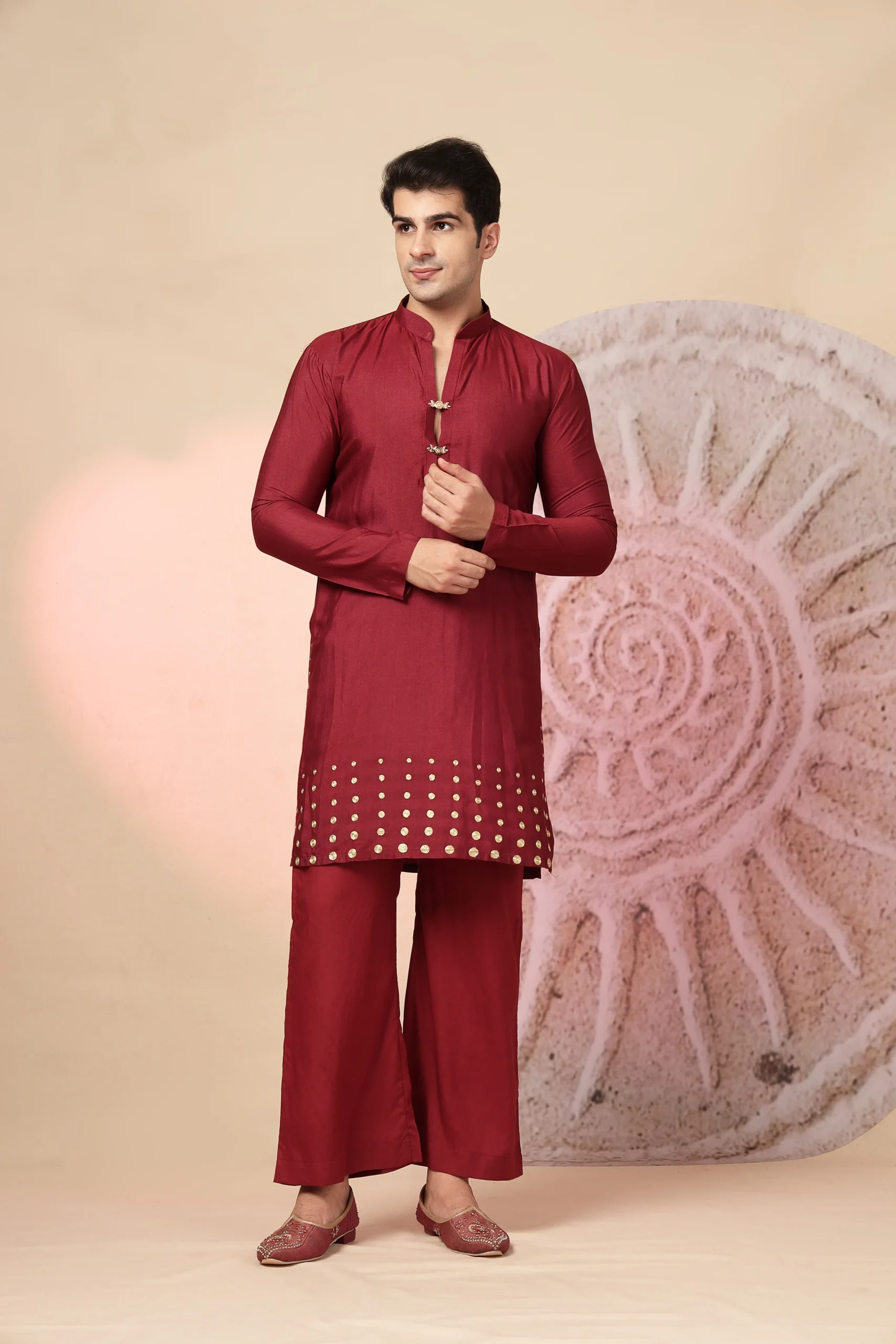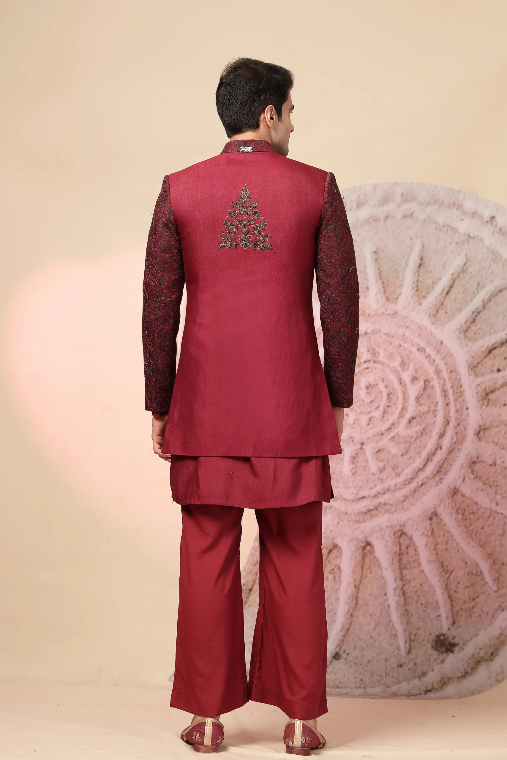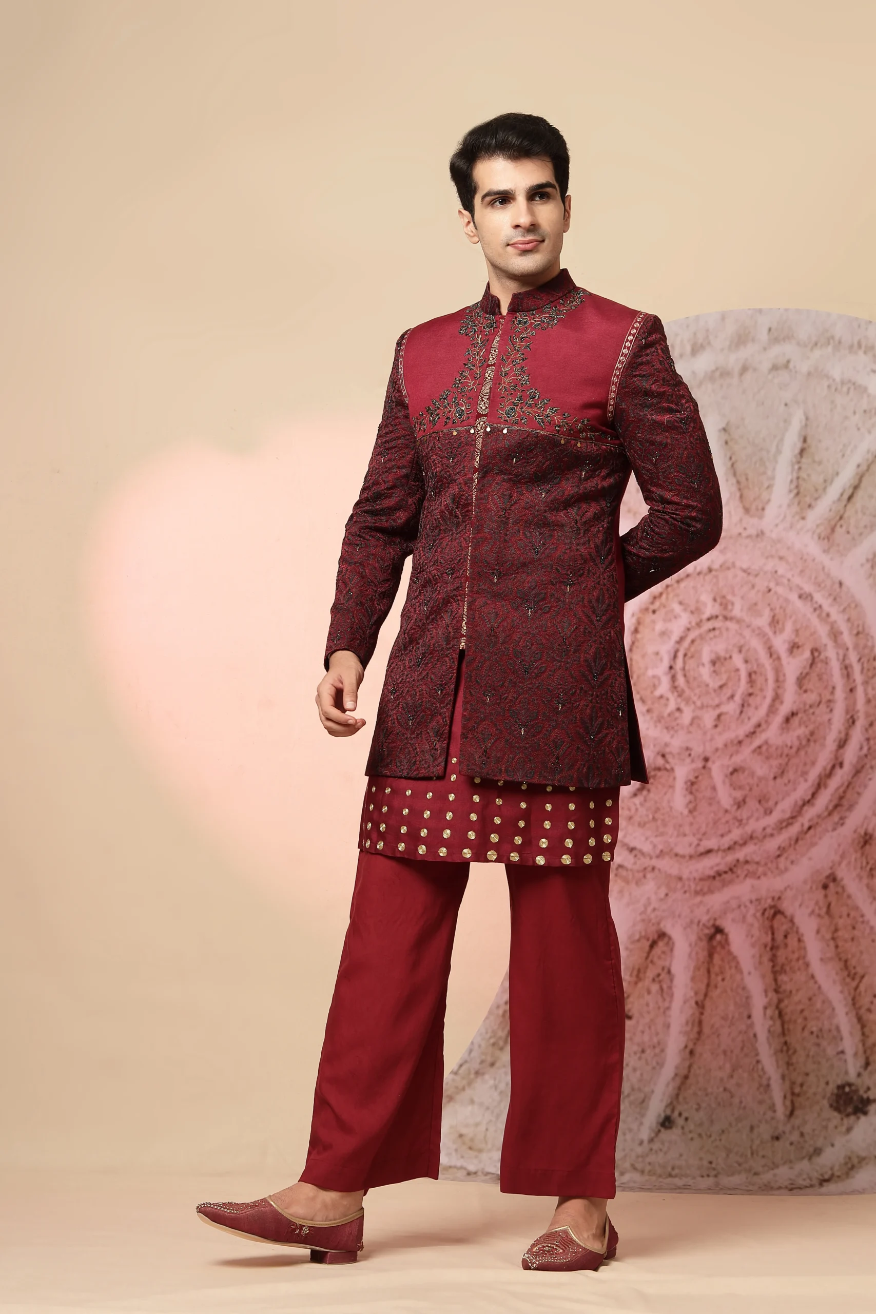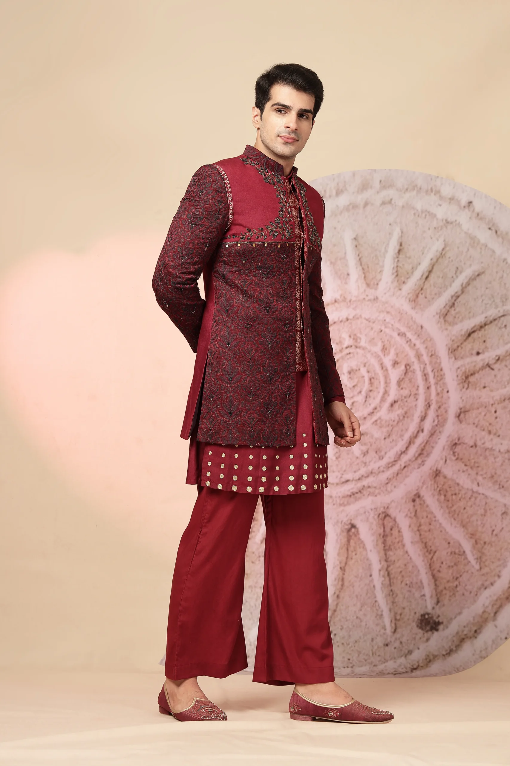 Introducing a Maroon regal Indo-Western ensemble designed for refined celebrations. This sophisticated set features a richly embroidered jacket with a structured high collar and elegant button detailing, layered over a coordinated kurta and flowing palazzo pants. Crafted to balance traditional artistry with contemporary tailoring, the ensemble exudes timeless elegance and royal charm—making it an impeccable choice for weddings, receptions, and formal festive occasions.