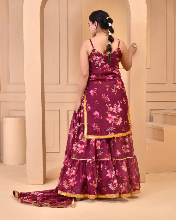 Introducing a mauve chiffon floral printed sharara set, The ensemble features a short kurta with delicate noodle straps, highlighted with gota detailing, paired with a matching sharara and a coordinated dupatta finished with gota accents.