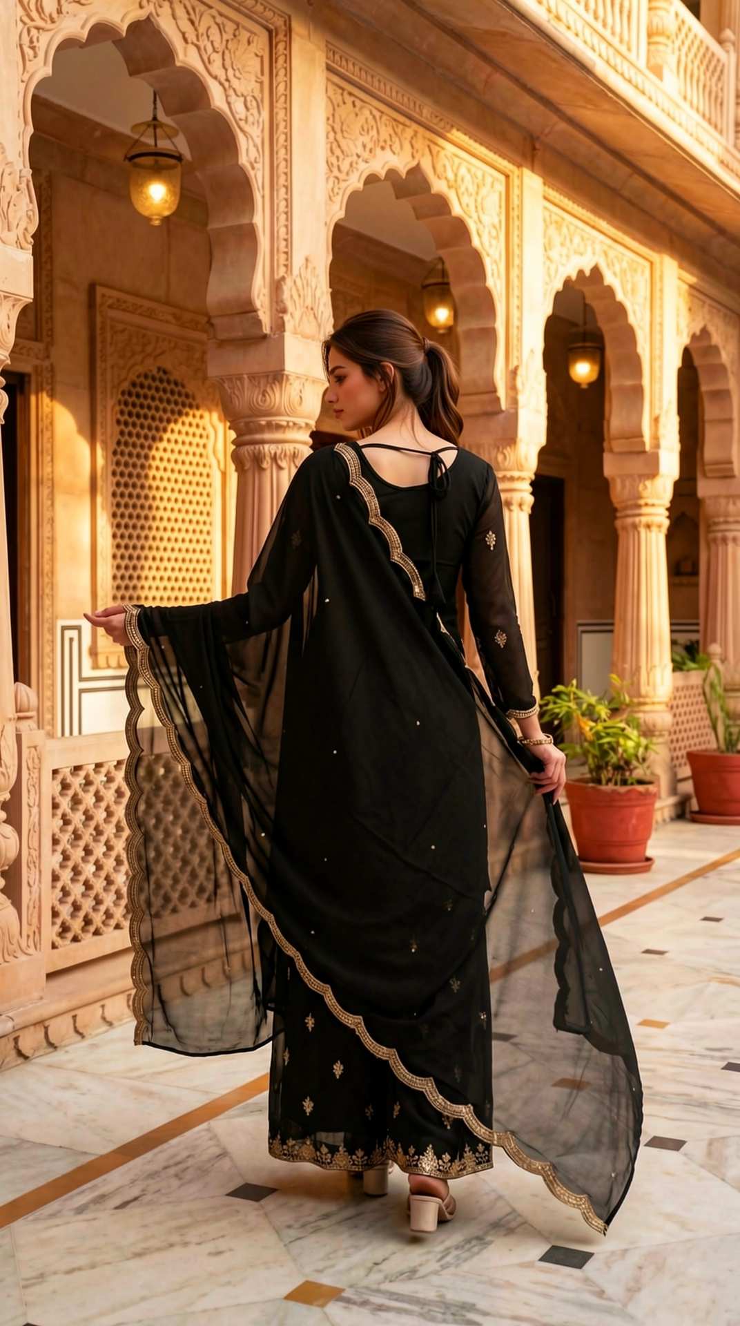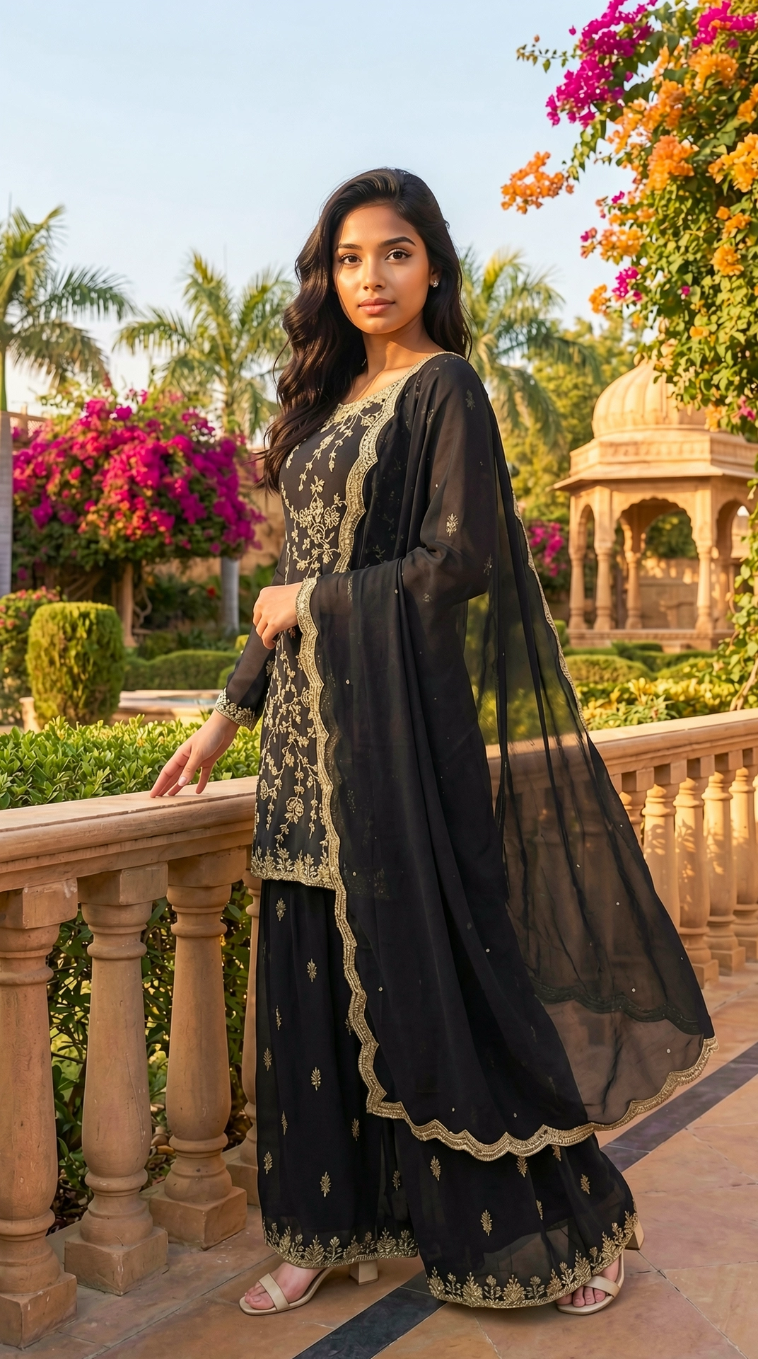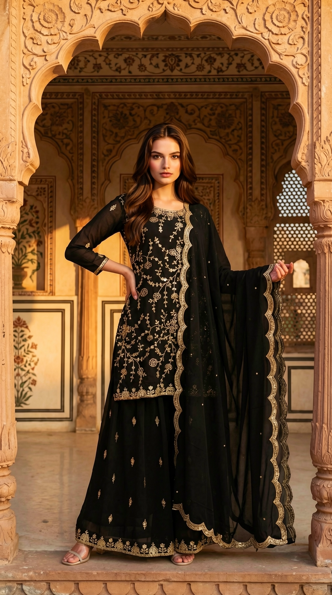 Style with statement gold or kundan jewelry and metallic heels for an elevated festive look. Opt for soft waves and bold eye makeup to enhance the richness of the black and gold combination.