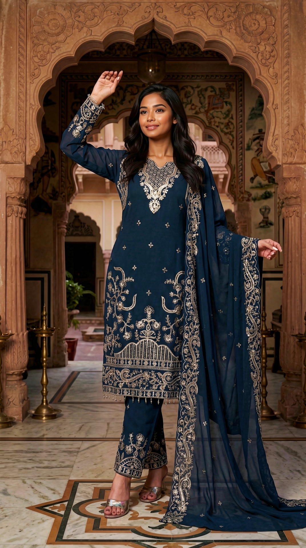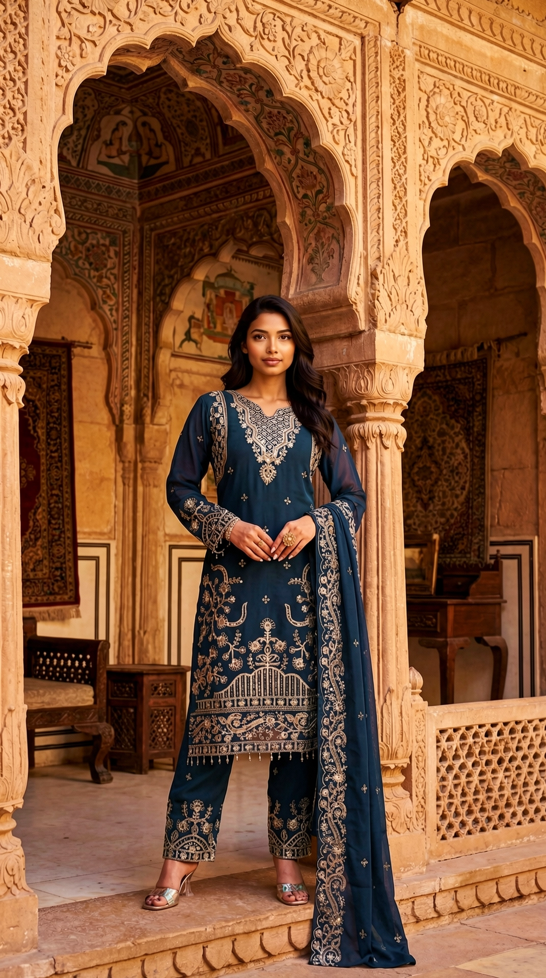 Introducing a sophisticated midnight blue kurta pant set designed for refined festive and evening occasions. The straight-cut kurta is adorned with intricate gold embroidery across the neckline, bodice, sleeves, and hem, creating a regal contrast against the deep blue base. Paired with tailored straight pants featuring coordinated embroidered borders and complemented by a sheer matching dupatta finished with an ornate trim, this ensemble embodies timeless elegance and contemporary grace. Perfect for festive celebrations, wedding functions, and cultural gatherings, it offers effortless sophistication and statement appeal.