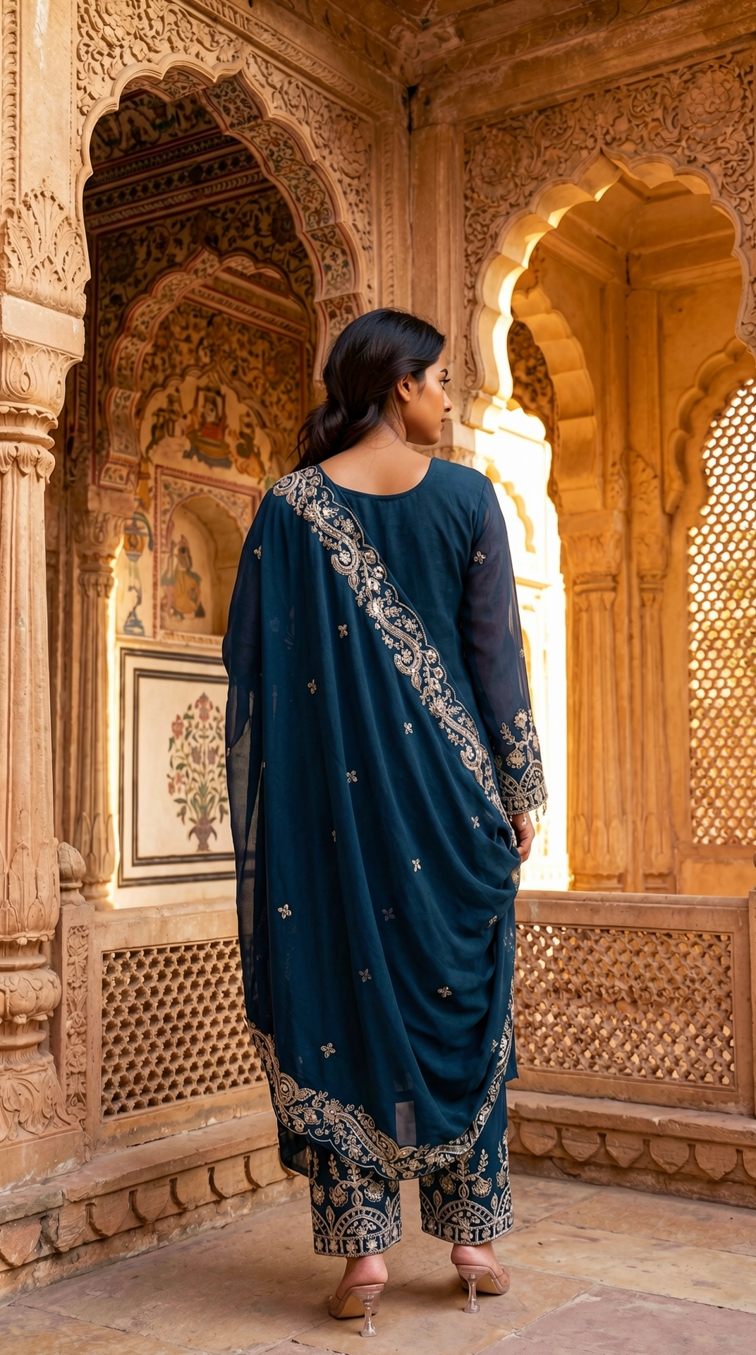 Style with statement gold jewelry and metallic heels for a polished festive look. Opt for soft waves and classic makeup to enhance the richness of the midnight blue hue.