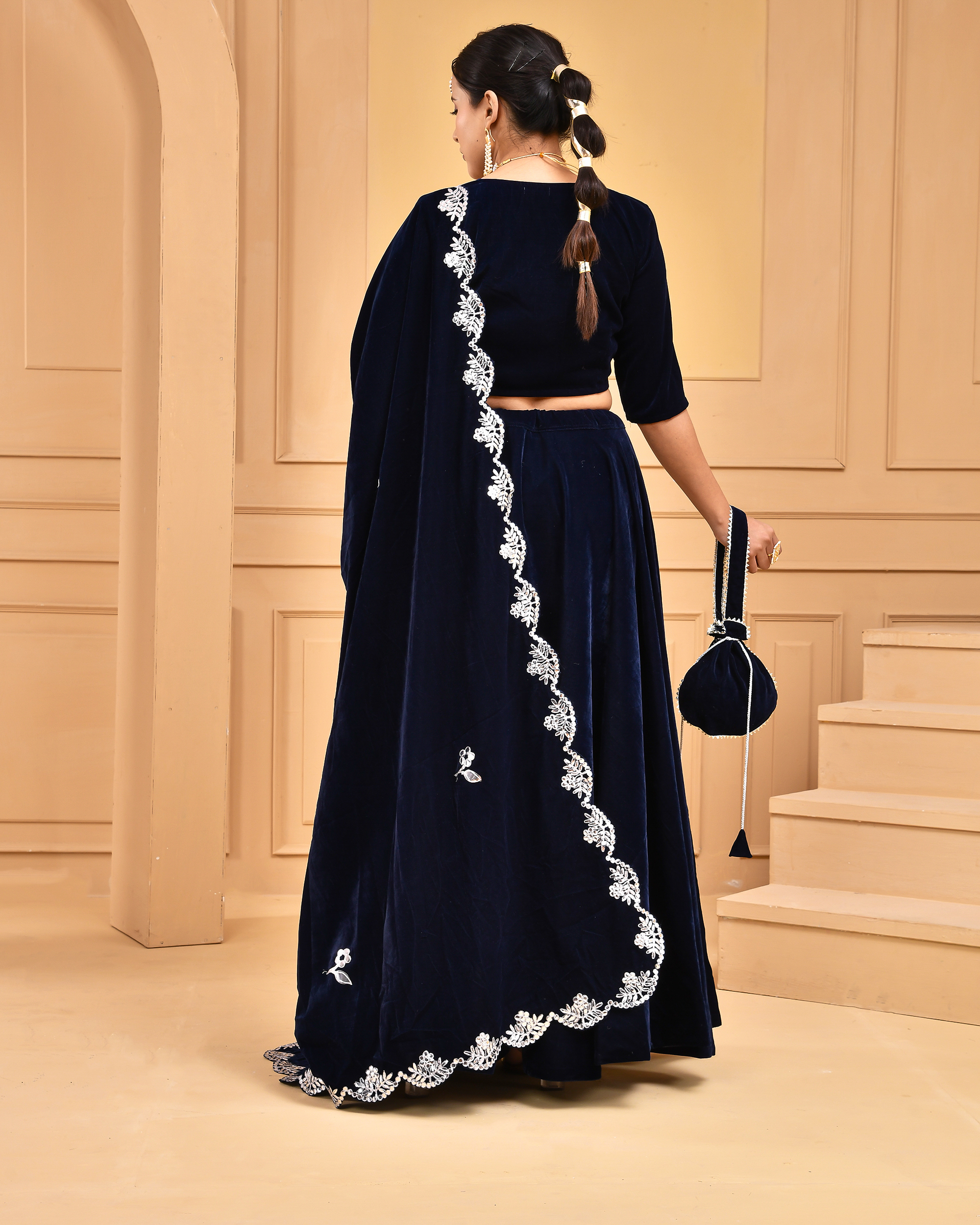 Introducing a midnight blue velvet embroidered lehenga set. Crafted from plush velvet, the lehenga drapes fluidly with a soft, luxurious finish and is paired with a matching blouse. The ensemble is completed with a velvet embroidered dupatta featuring elegant scalloped detailing.