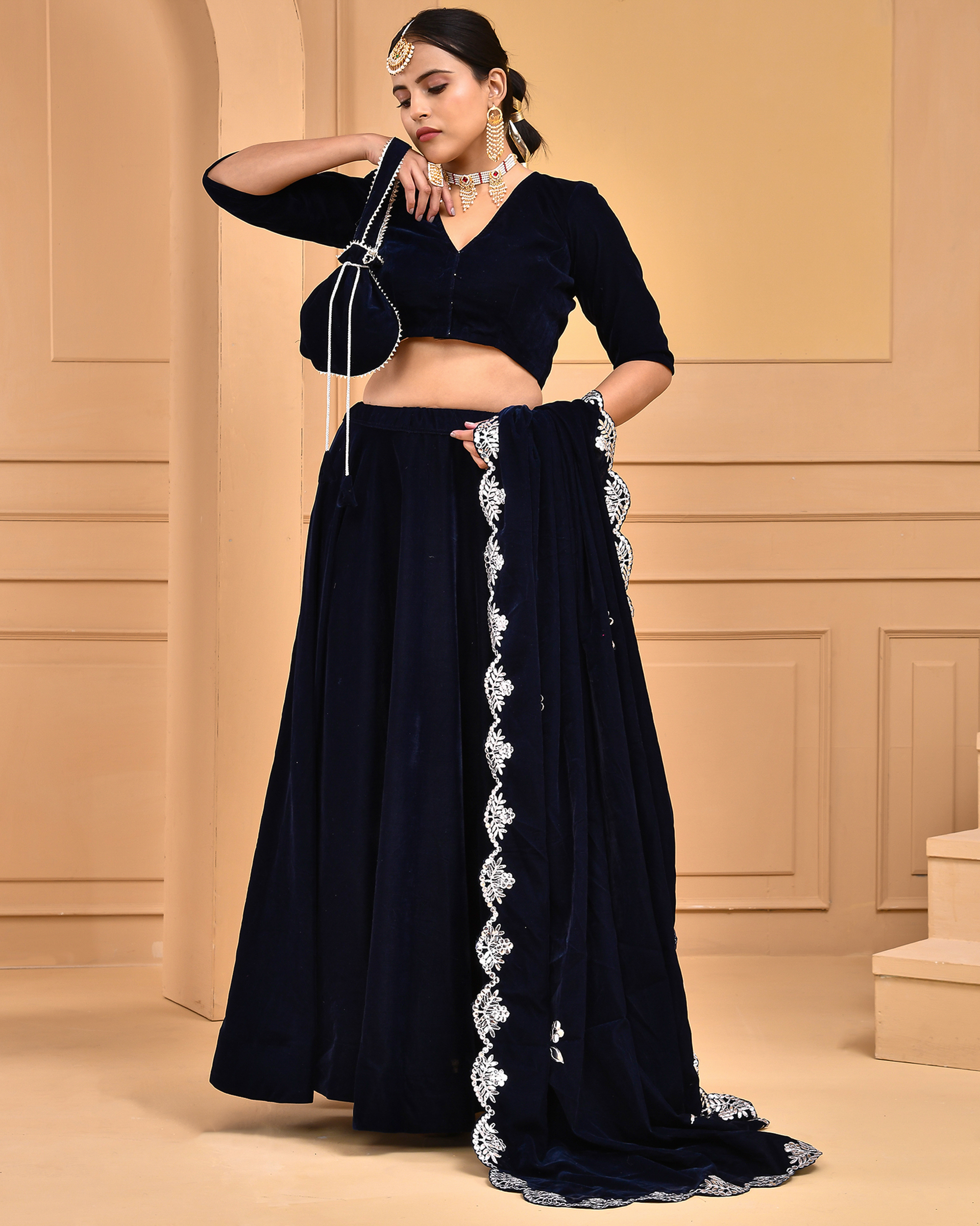Midnight Blue Velvet Lehenga Set With Embroidered Dupatta