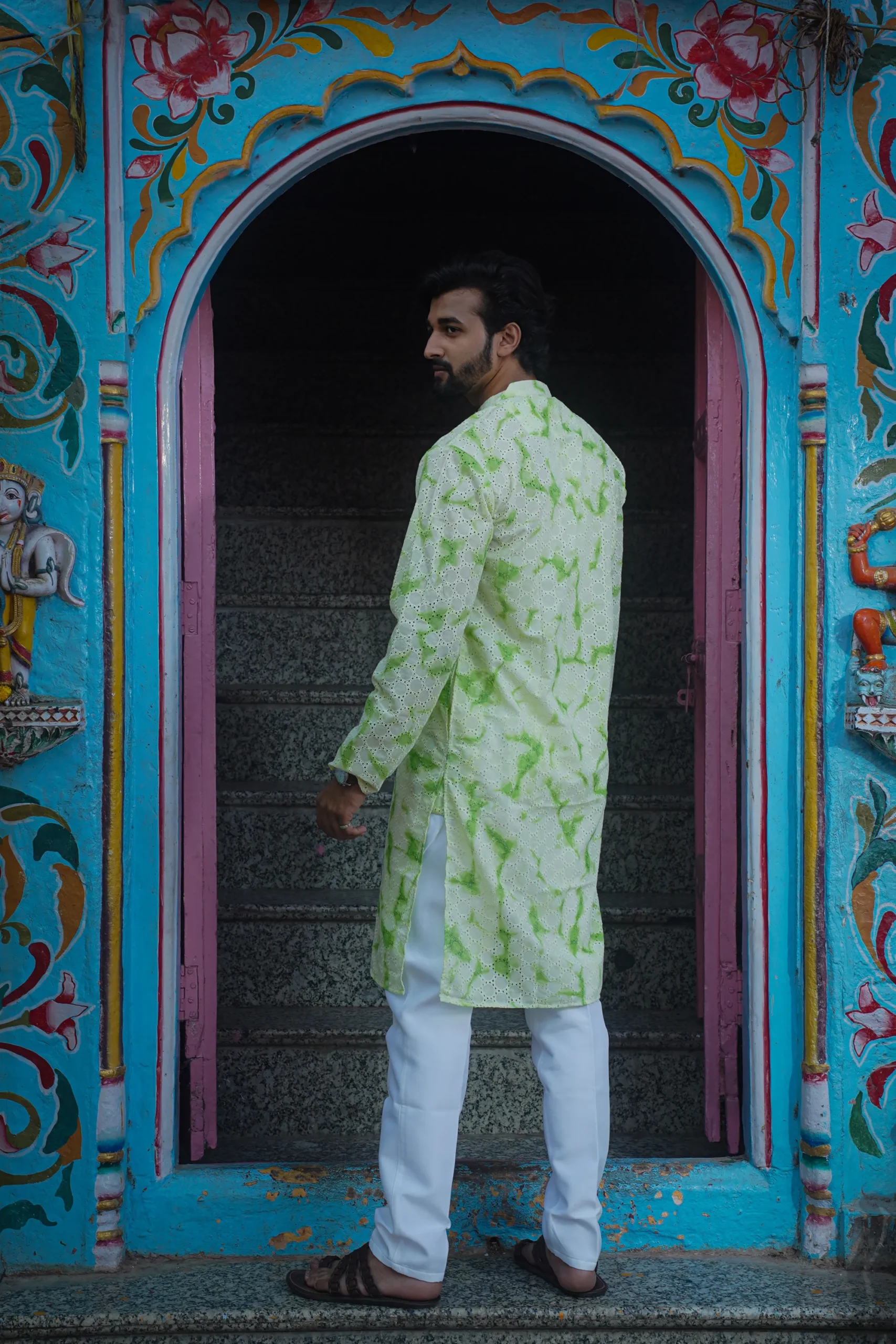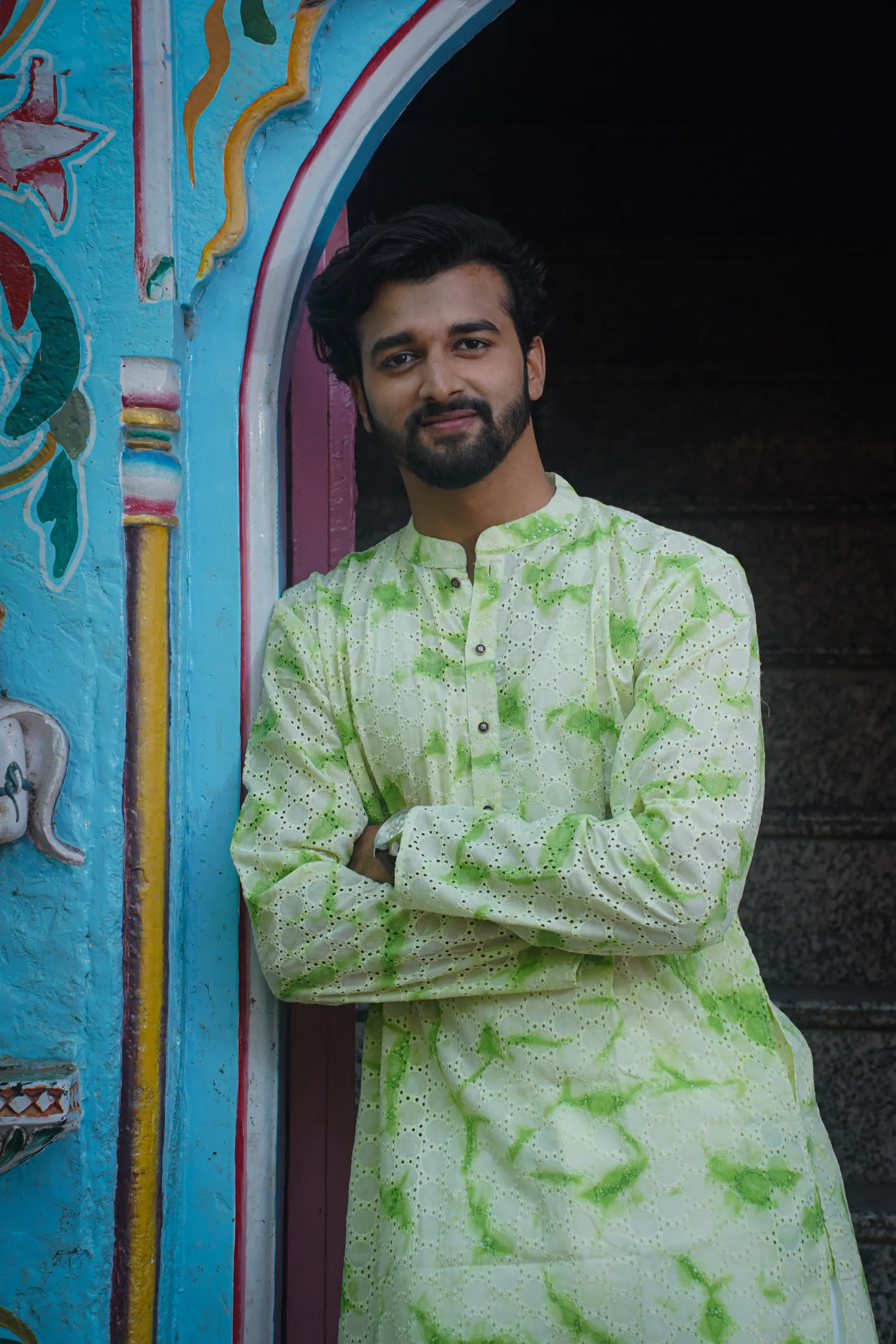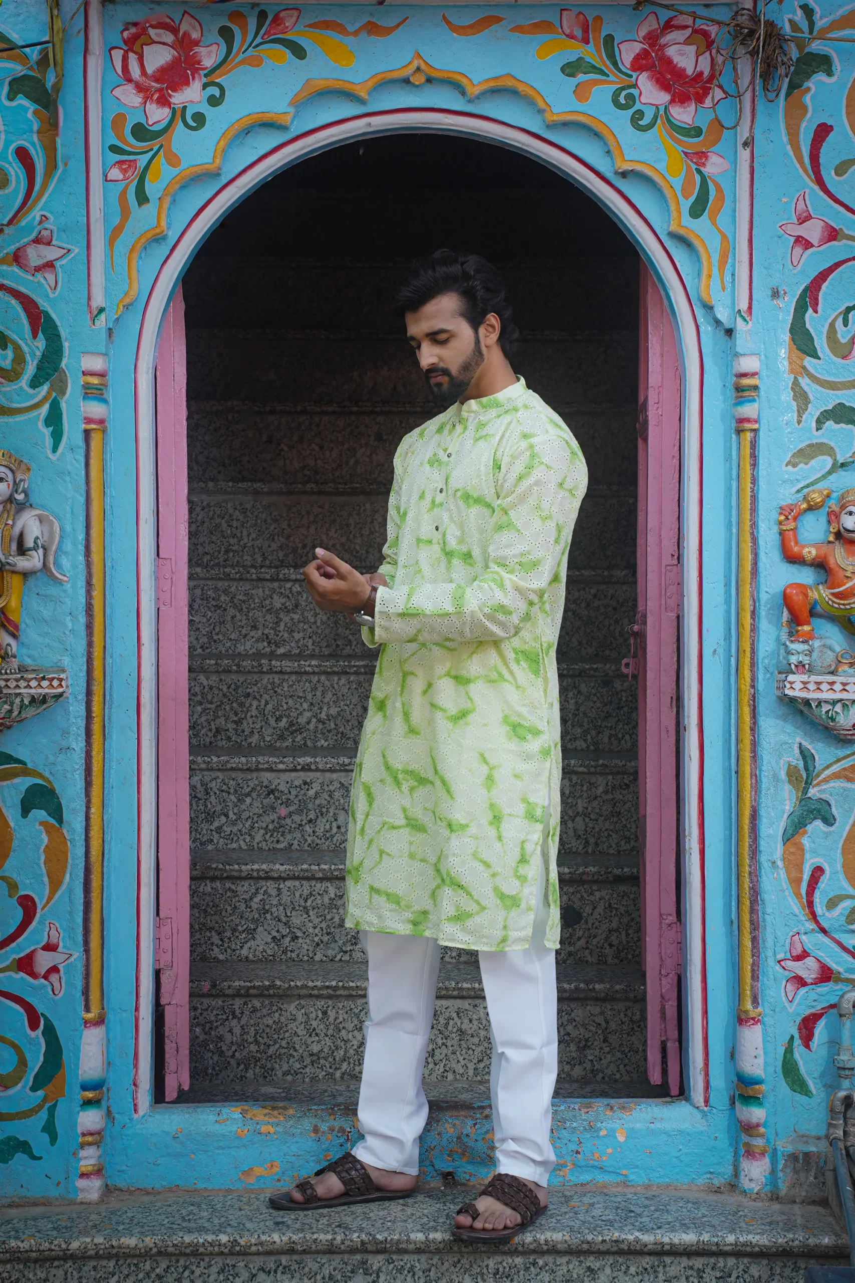 Introducing the Mint Blossom Tie & Dye Hakoba Cotton Kurta Set, a refreshing blend of elegance and comfort. Crafted from pure breathable cotton, the kurta features soothing mint tie & dye hakoba fabric that adds texture and artisanal charm. Designed with a refined mandarin collar and practical side pockets, it is paired with a comfortable cotton pajama, making it perfect for festive gatherings, celebrations, and effortlessly stylish everyday wear.