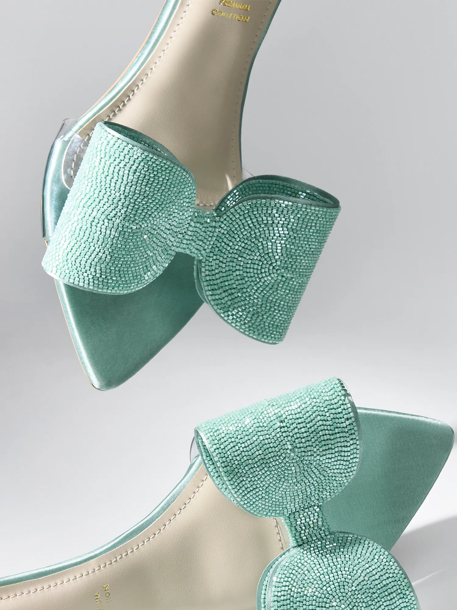 Featuring oversized 3D bow fully encrusted with micro-rhinestones with clear transparent body and satin pointed toe in fabric on faux leather, this Mint Crystal Bow Transparent Kitten Heel is a showstopper.