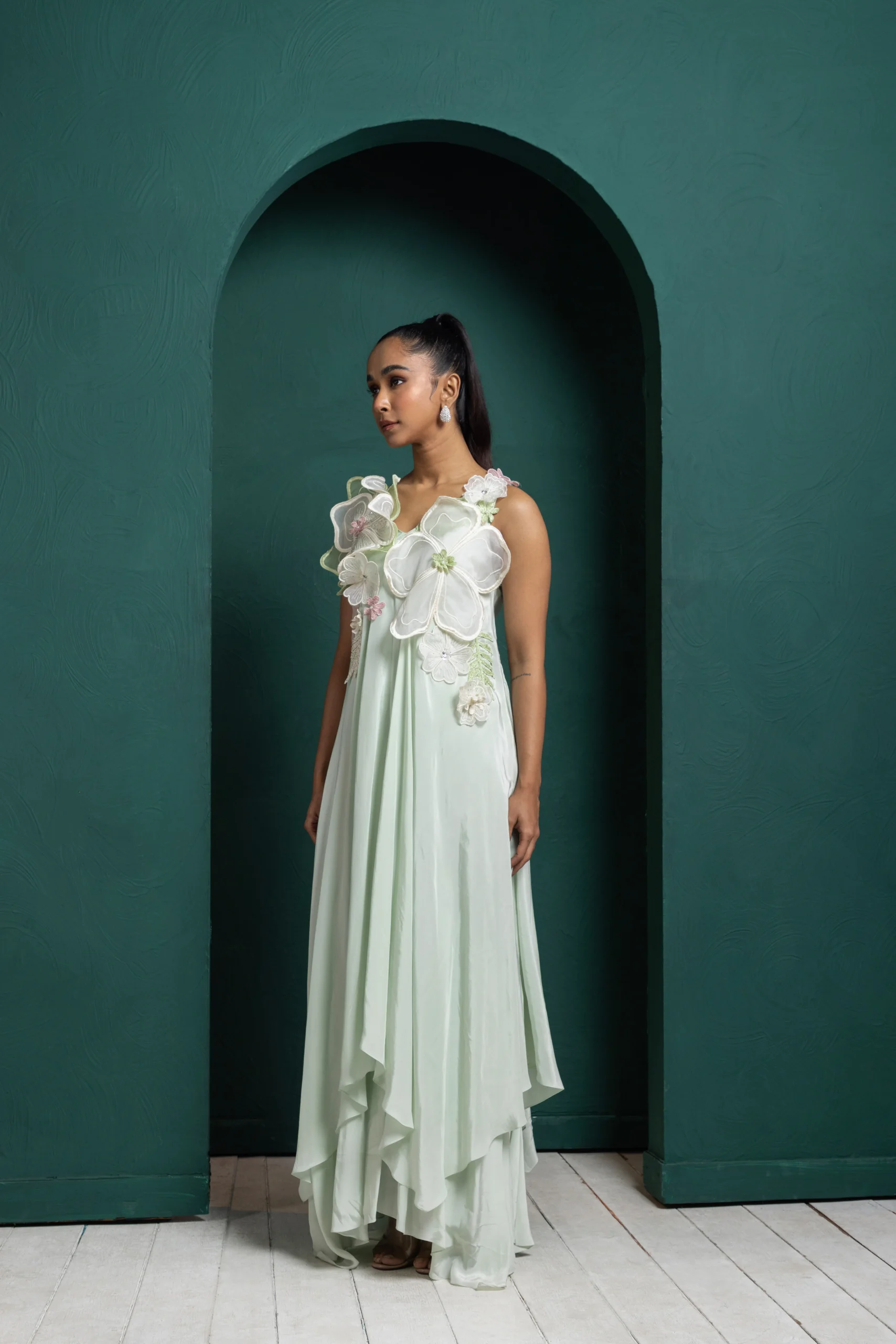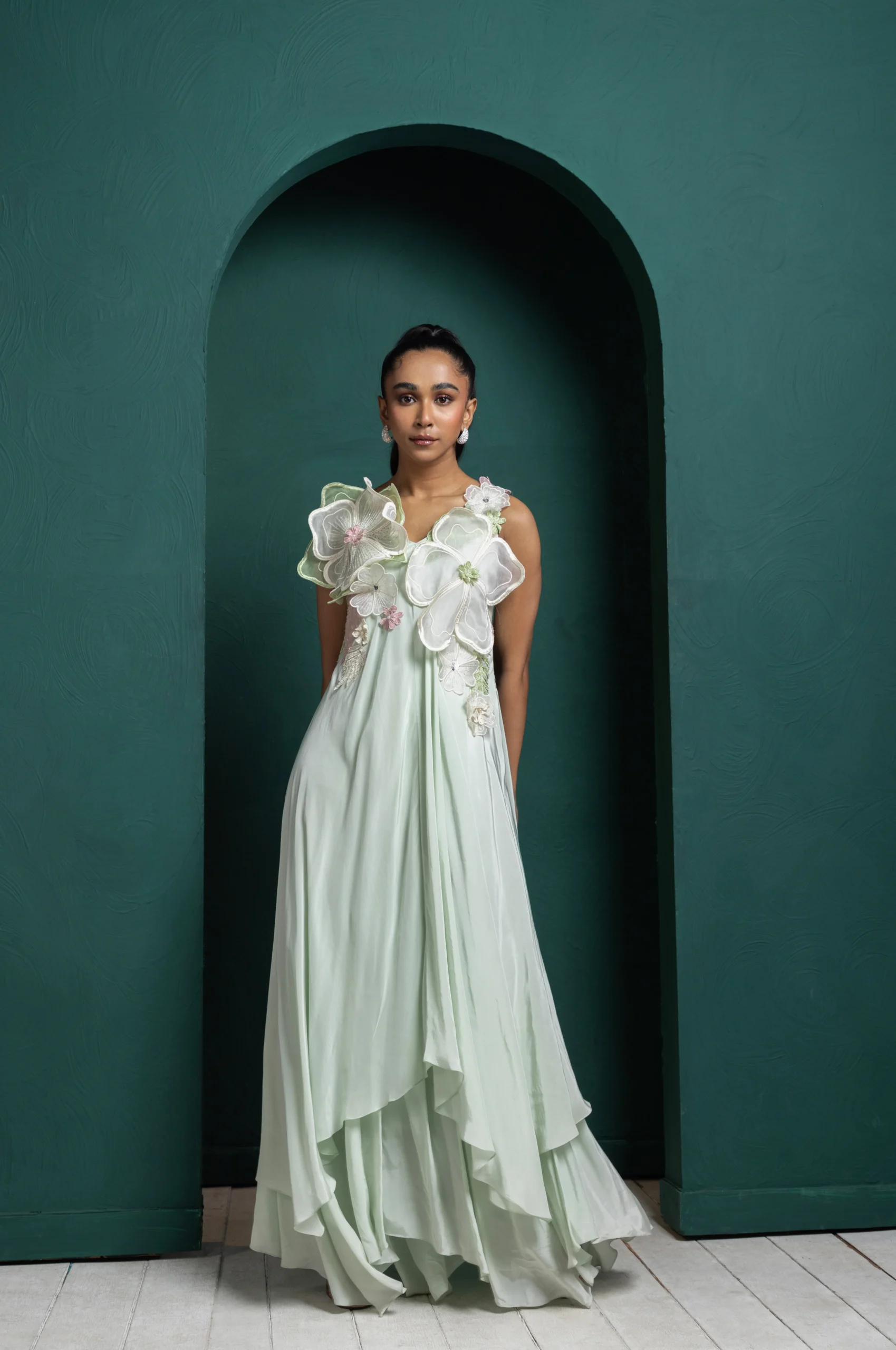 Introducing an enchanting mint-green layered gown that captures whimsical elegance. Adorned with oversized pastel floral appliques, it features cascading asymmetrical layers that create a dreamy, flowing silhouette. Perfect for weddings, receptions, and garden celebrations, this ethereal ensemble is designed for modern fairytales, blending artistry, charm, and graceful movement.