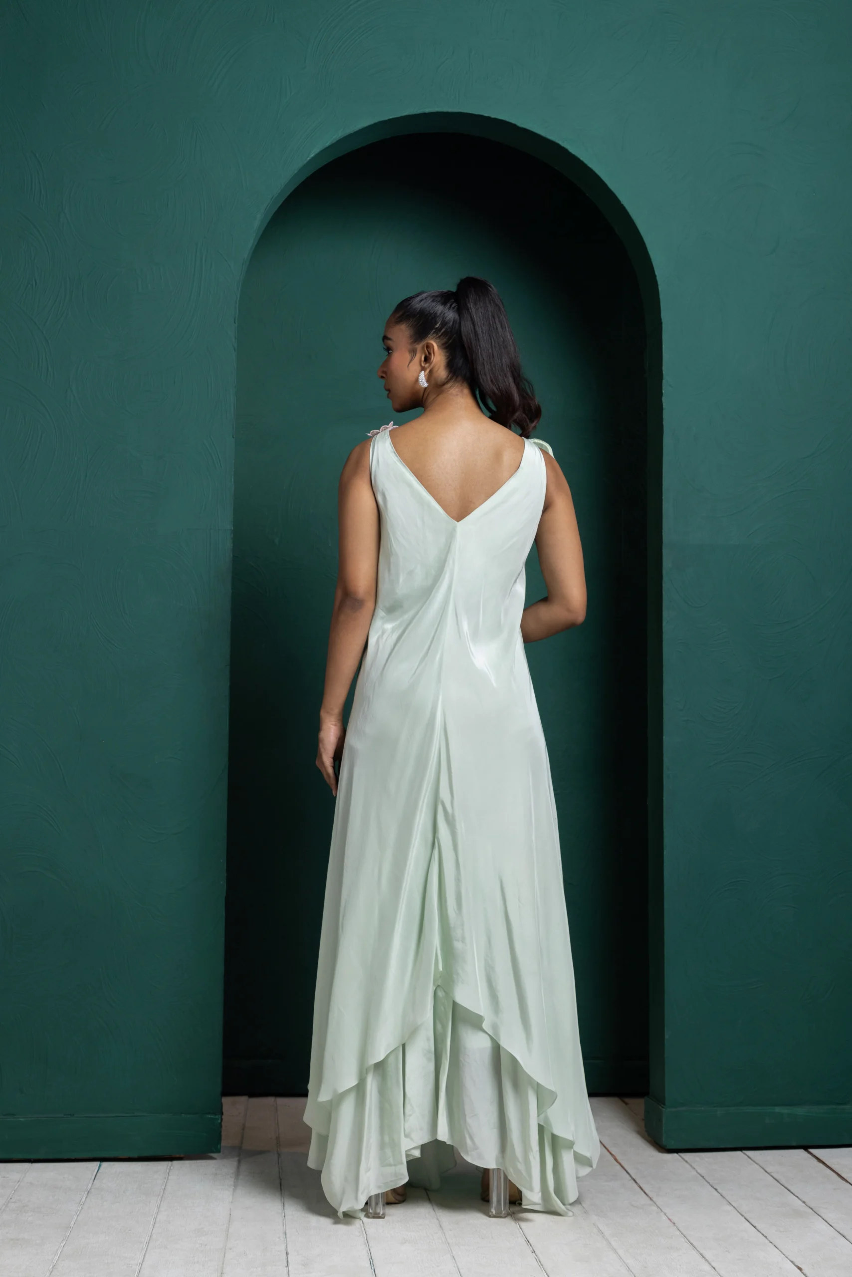 Style this enchanting mint-green layered gown with delicate pearl or pastel-toned jewellery to echo its soft floral appliqués without overwhelming the look. Opt for fresh, romantic makeup with dewy skin, softly defined eyes, and a blush or nude lip. Complete the ensemble with nude or metallic heels, and keep the hair in loose waves or a softly pinned half-up style to enhance the gown’s dreamy, flowing silhouette with effortless elegance.