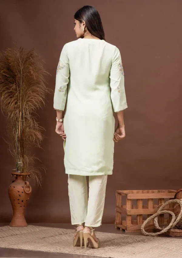 Introducing a classic mint green georgette kurta, designed to offer elegance and comfort. This kurta features a stylish notch neck and 3/4th sleeves, adorned with beautiful floral sequin embroidery that adds a touch of glamour to its refined design. Paired perfectly with comfortable ivory crepe straight pants, this ensemble blends traditional charm with modern sensibility, making it an ideal choice for casual outings, festive occasions, or evening gatherings.