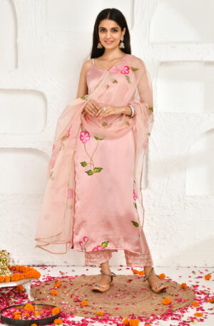 Statement kurta, crafted from fine Moonga silk, is an ode to craftsmanship. The front is adorned with intricate all-over Zardozi embroidery featuring chintz-inspired motifs. Paired with elegant bottle-green sharara pants, crafted in Moonga silk, includes a flattering waist belt, pockets, and a slit to enhance the silhouette. Zardozi embroidery along the sides adds a refined touch. The look is completed with a bottle-green organza dupatta that features intricate golden thread work along the border. Embroidered tassels at the edges bring elegance.