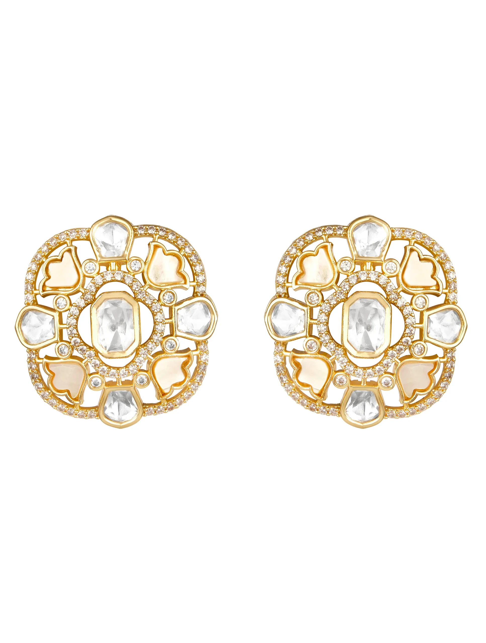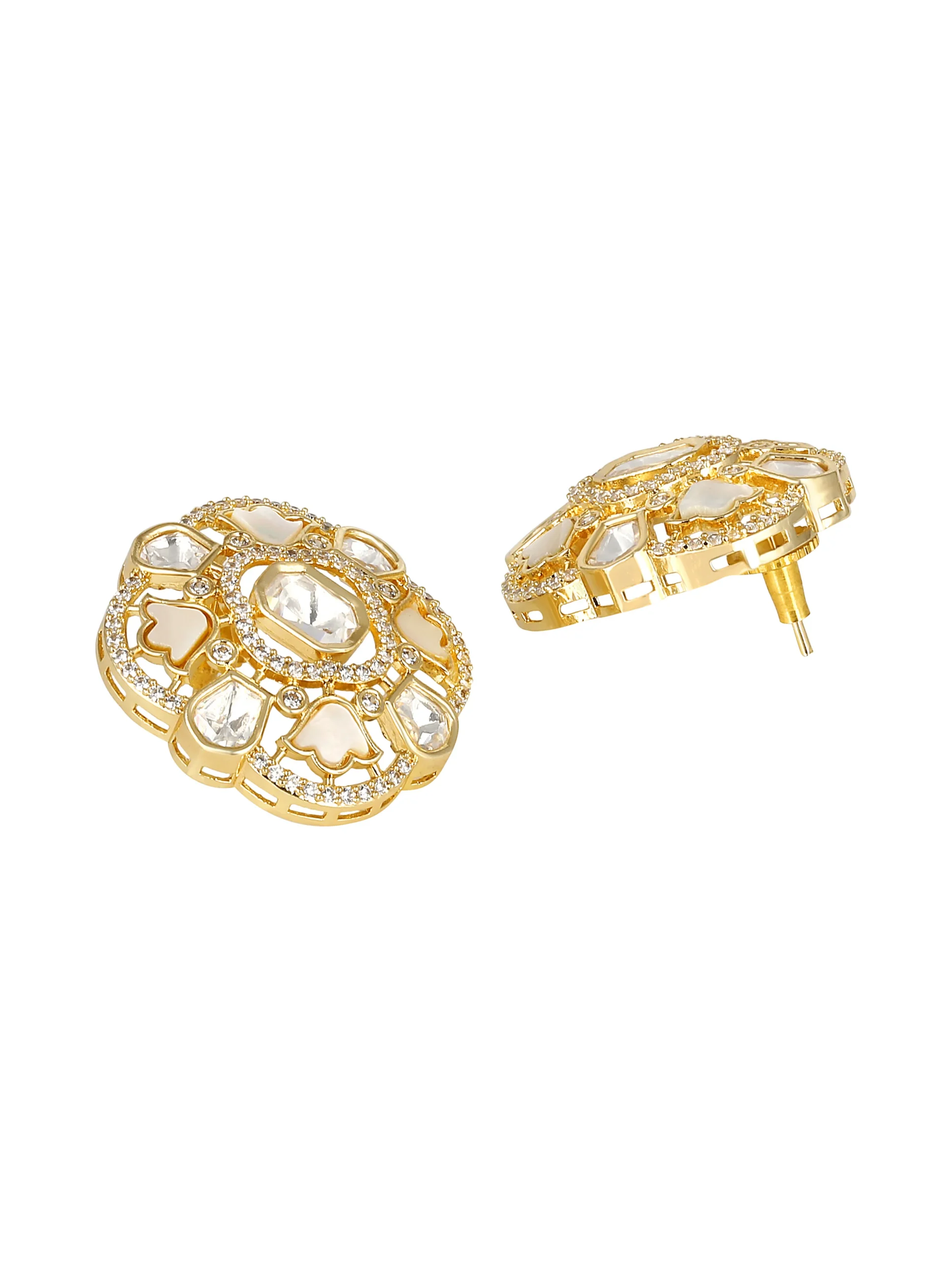 Mother of Pearl Kundan Polki Stud Earrings with Zirconia in Micron Gold Finish
