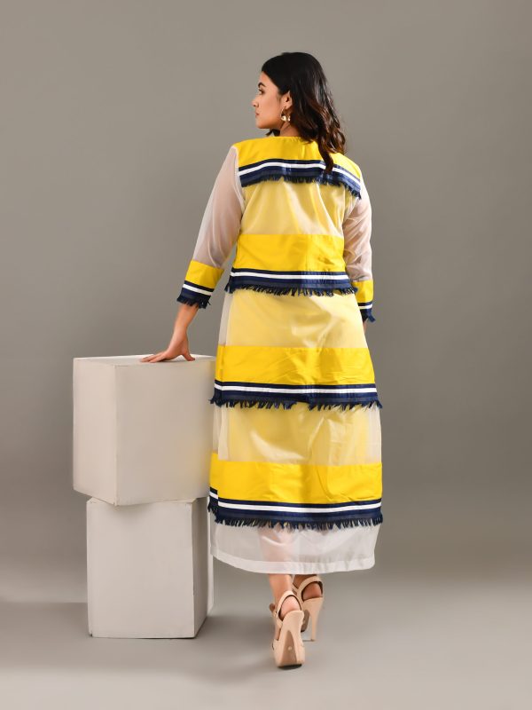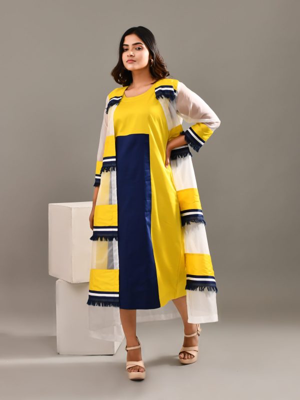 Introducing our two-piece multicolored dress, crafted in a blend of cotton and organza to celebrate the charm of the modern woman. This ensemble exudes effortless sophistication, featuring a chic overlay jacket adorned with intricate stripe detailing created through layered fabrics. The fusion of textures and tones brings a refreshing vibrance, while the lightweight organza adds a touch of grace and movement. Perfect for contemporary occasions, this look embodies modern allure with a hint of artistic finesse — a true reflection of confidence and style.