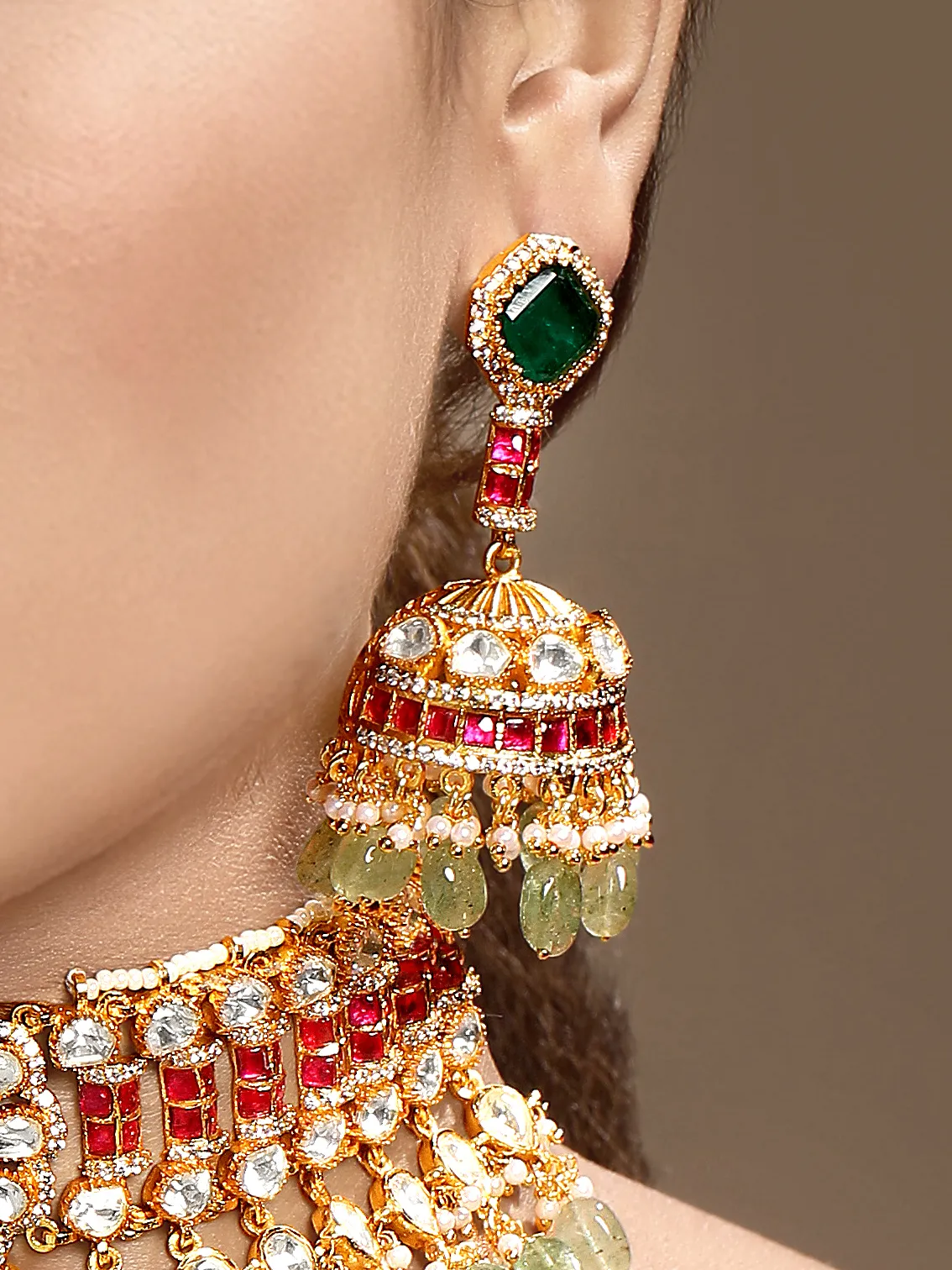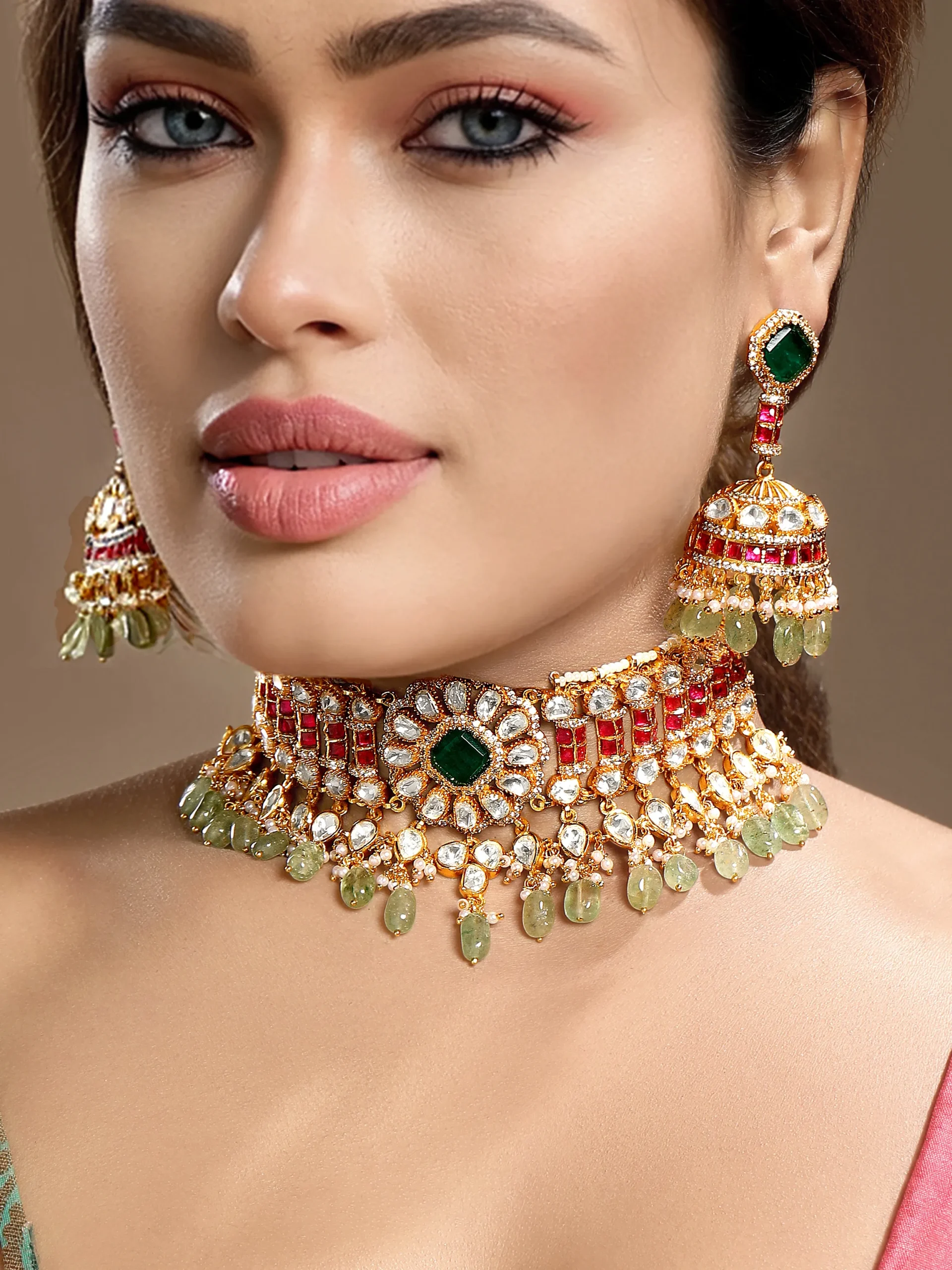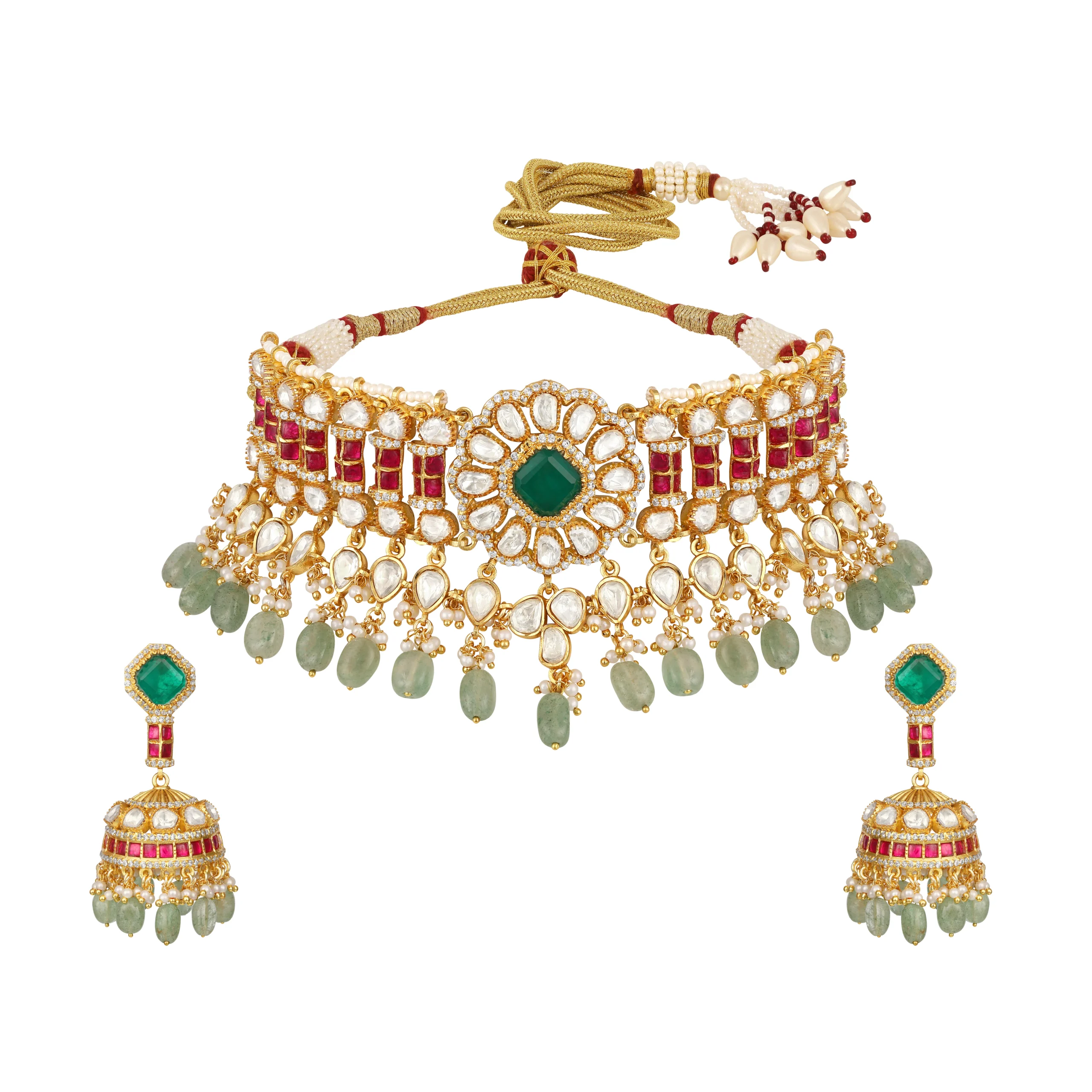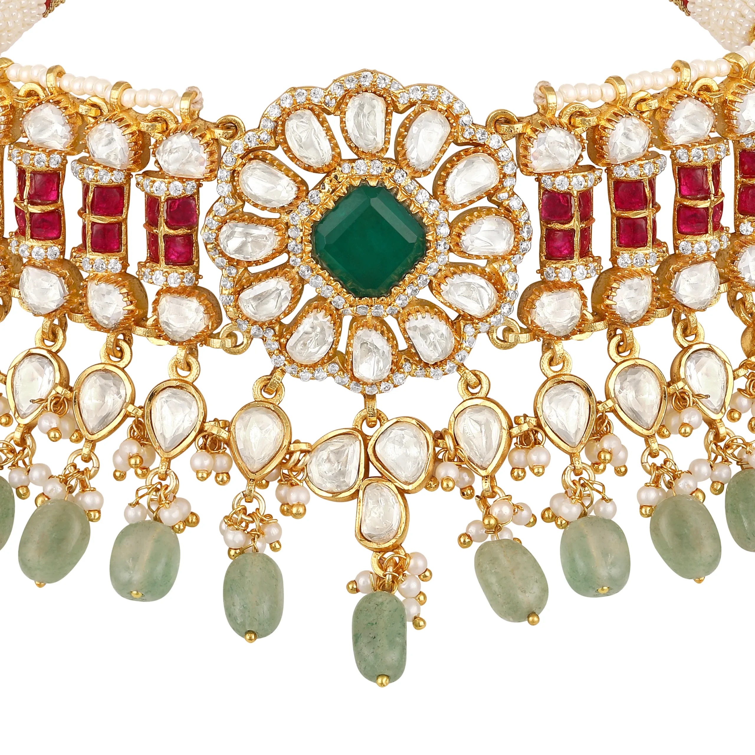 Introducing a striking choker necklace set in refreshing tones of green, gold, mint, cream, and cherry, crafted in brass with micron gold plating and a radiant gold polish finish. Embellished with onyx tumbles, moissanite Kundan Polki, pearls, synthetic ruby, cubic zirconia, and synthetic emerald, it exudes regal elegance. The set includes one adjustable dori necklace and a pair of push-back earrings for a refined, statement look.