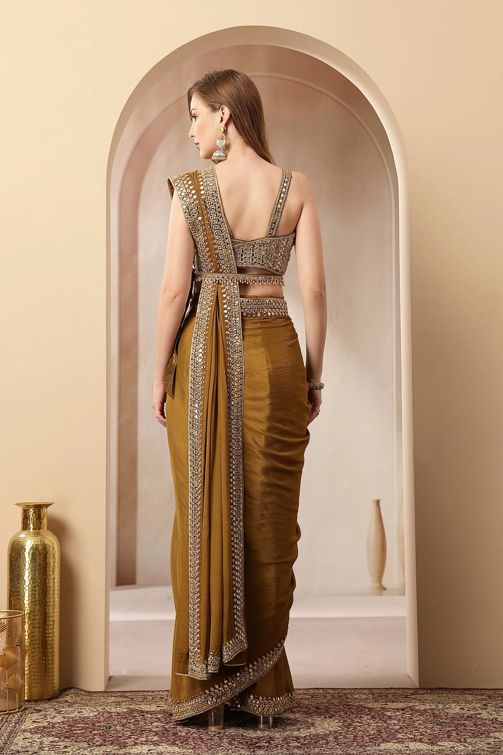 Mustard Gold Pre-Draped Satin Saree with Antique Sequin Blouse