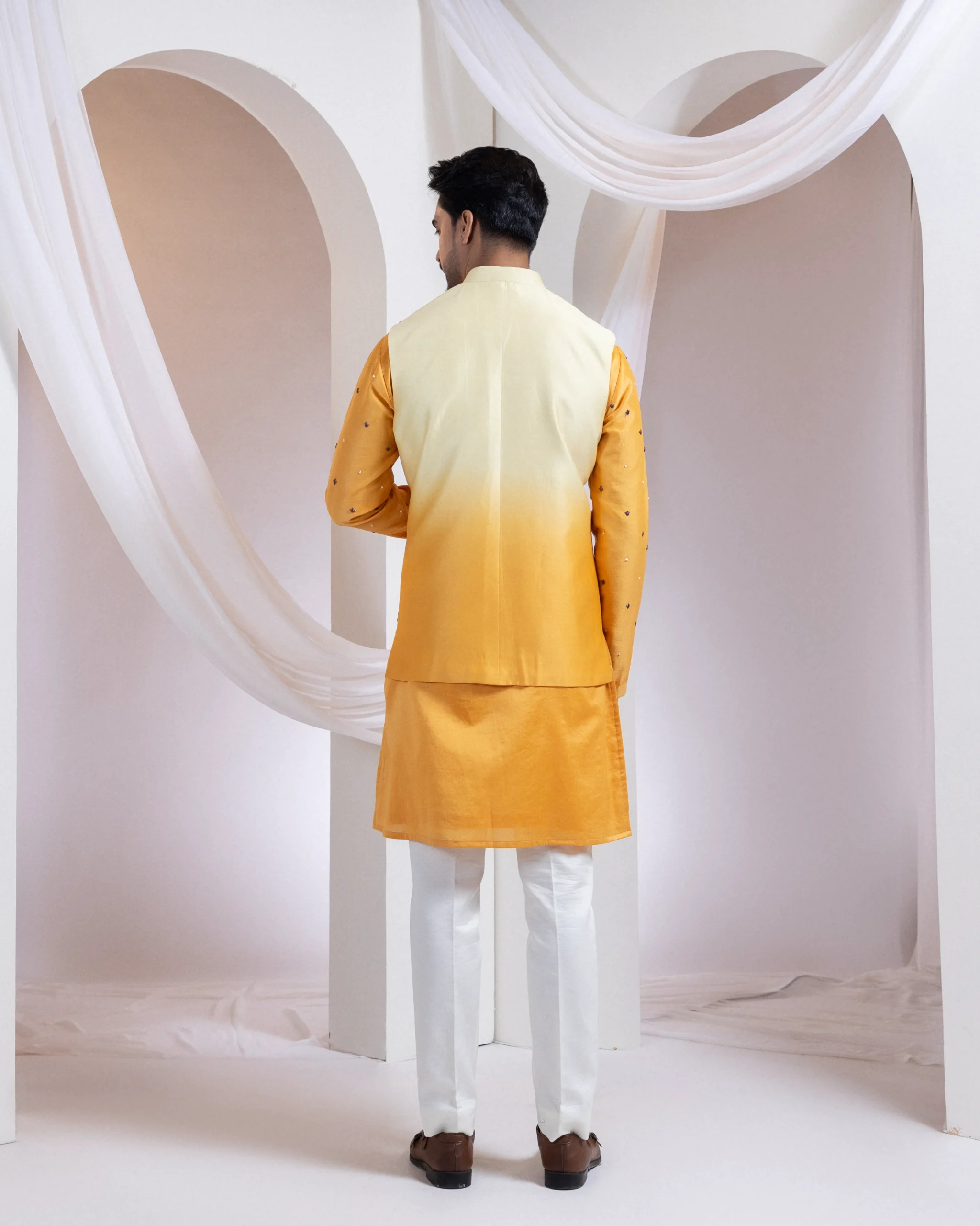 Complete the look with tan or classic brown mojaris and a sleek watch for a sophisticated festive presence. Keep accessories minimal to let the ombré jacket and textured kurta stand out, ensuring a refined statement at celebratory and semi-formal gatherings.