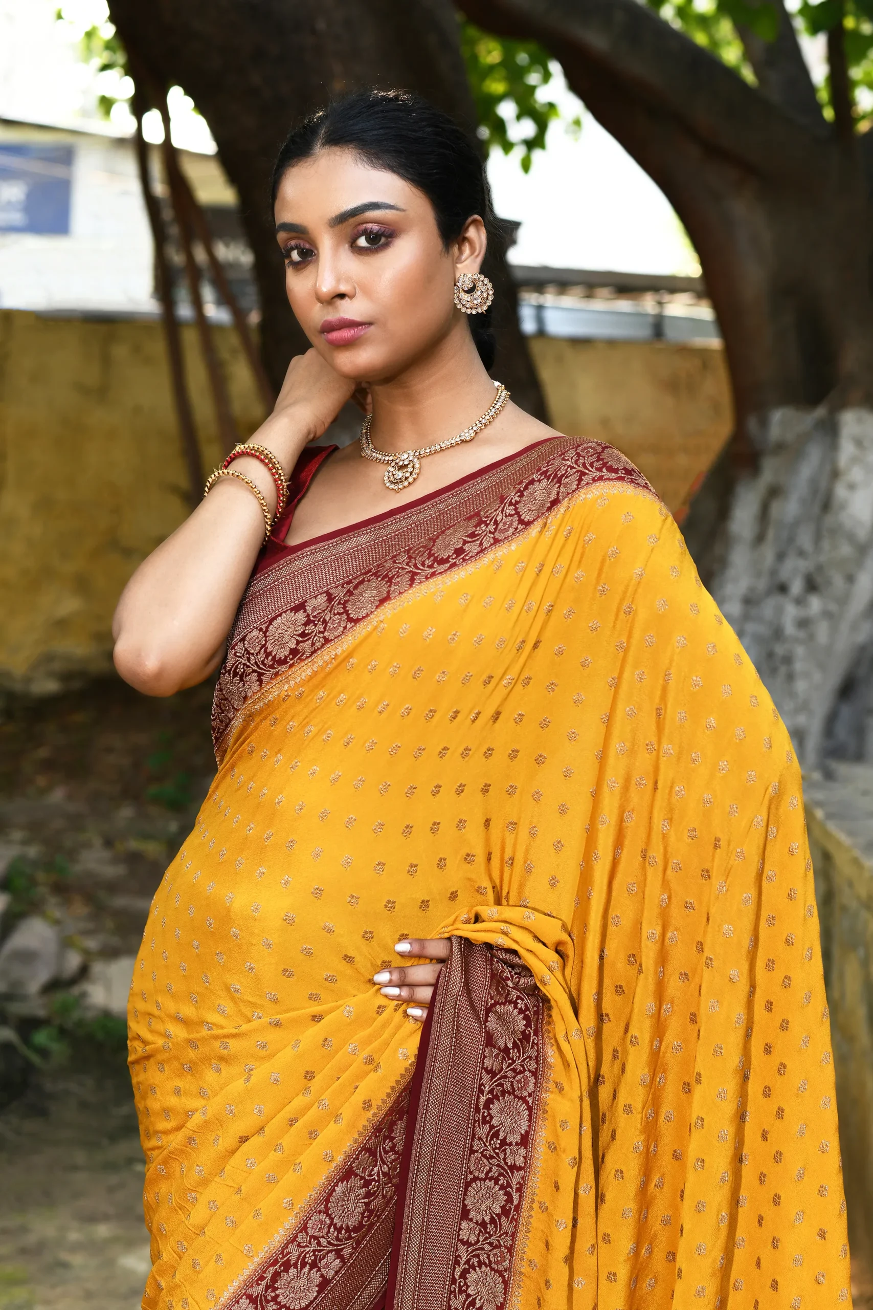 Mustard Yellow Banarasi Crepe Chiffon Silk Saree with Maroon Zari Border