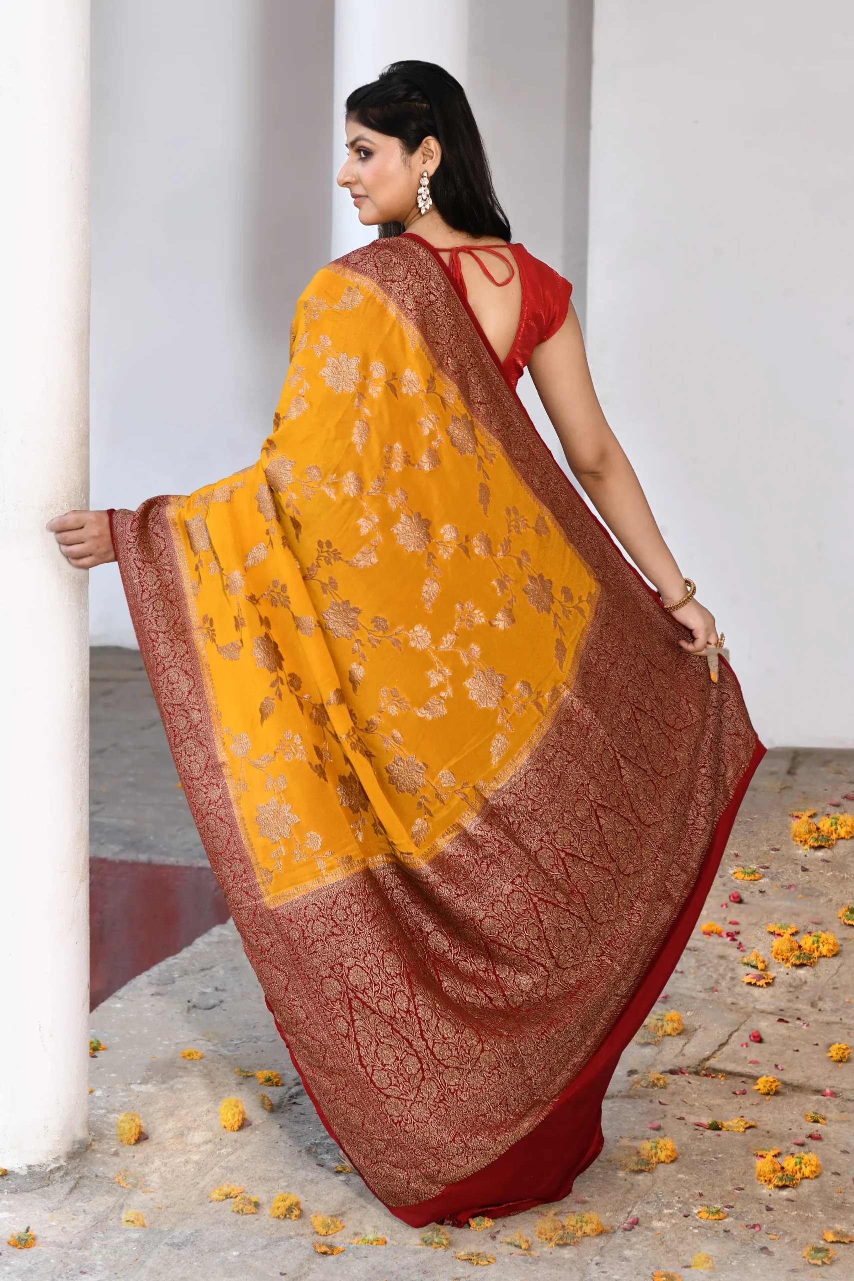 Pair with antique gold temple jewellery or kundan jhumkas, a delicate gold necklace, and complete the look with a maroon or gold brocade potli bag.