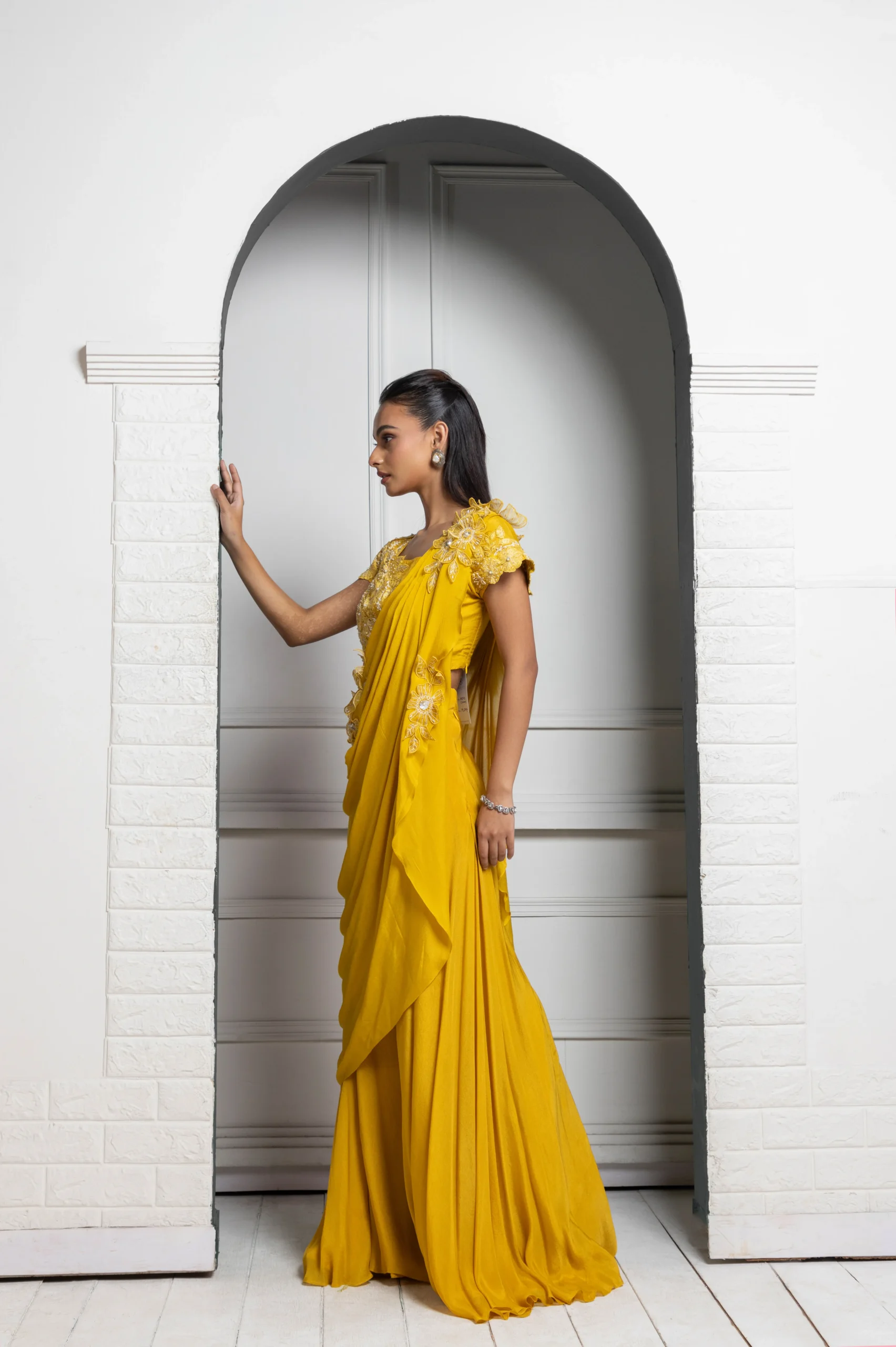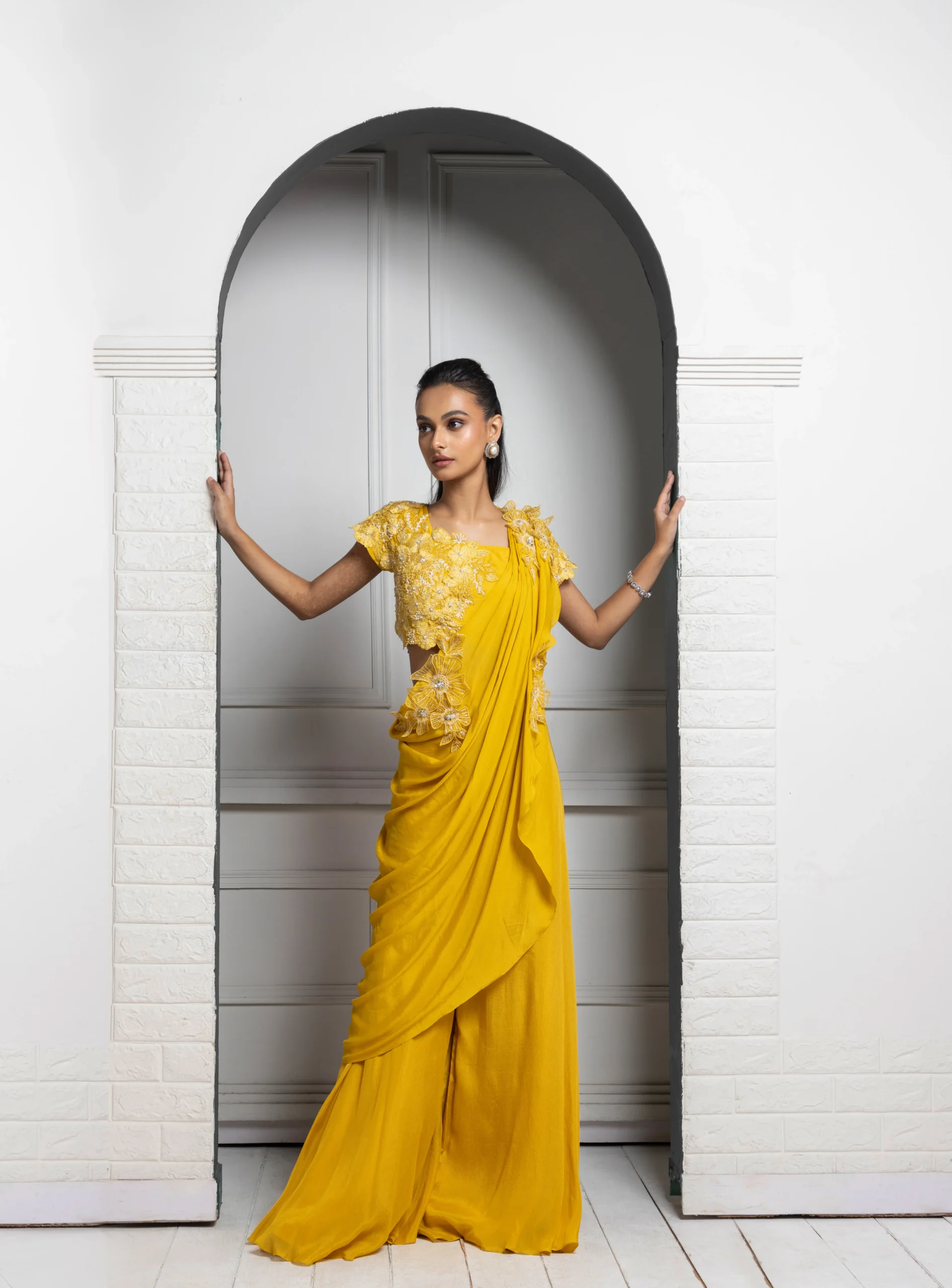 Style this mustard yellow ensemble with sleek hair or soft waves to complement its fluid drape. Pair it with statement earrings or a delicate choker, neutral-toned heels, and a structured clutch. Opt for warm, glowing makeup with soft gold accents to enhance the intricate lace detailing and elegant silhouette.