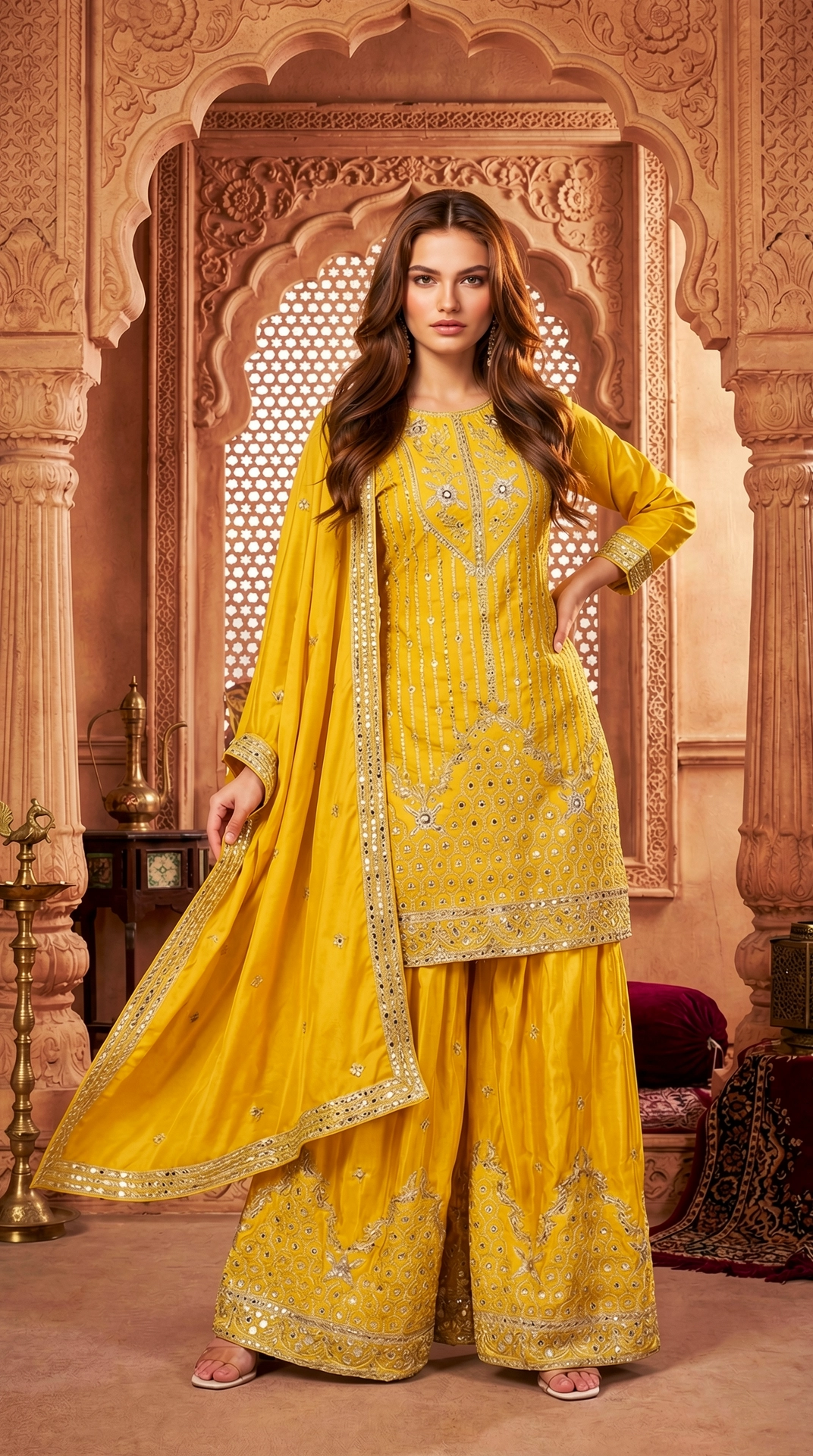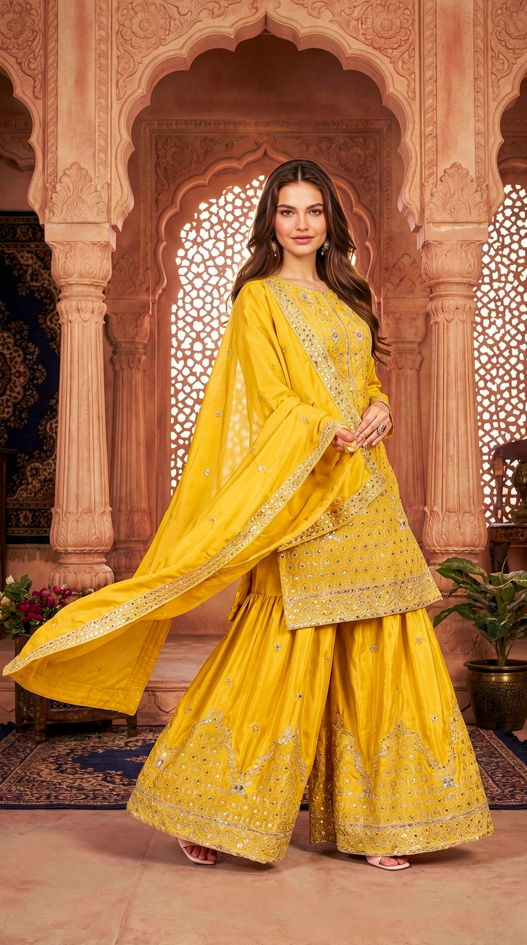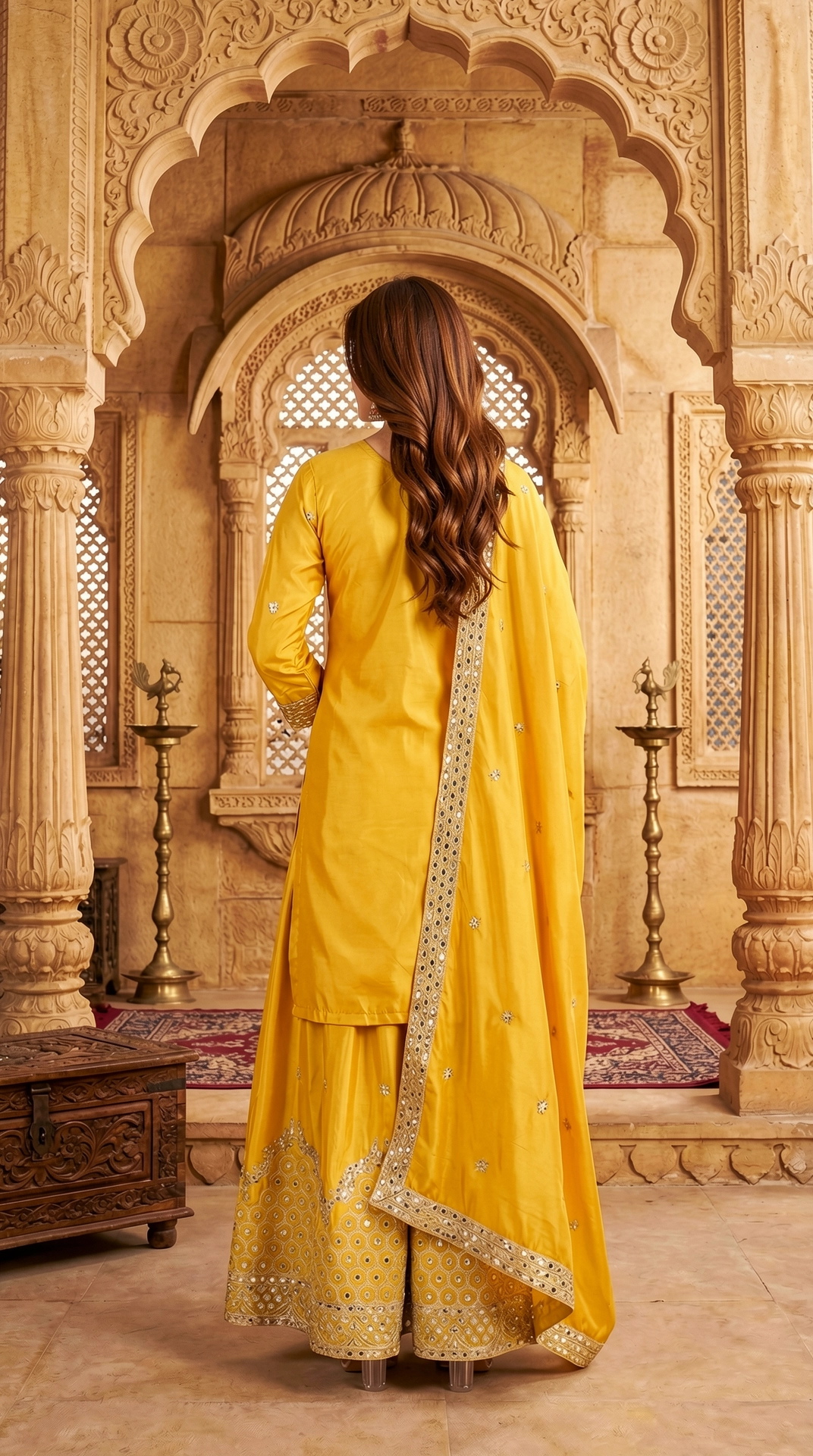Introducing a radiant mustard yellow kurta sharara set crafted for vibrant festive and wedding celebrations. The straight-cut kurta is beautifully adorned with intricate silver and gold embroidery featuring delicate motifs and linear detailing that elongate the silhouette. Paired with a flared sharara showcasing richly embroidered borders and complemented by a matching dupatta finished with an ornate trim, this ensemble exudes traditional grandeur with contemporary finesse. Perfect for mehendi functions, festive gatherings, and celebratory occasions, it offers graceful movement and timeless elegance.
