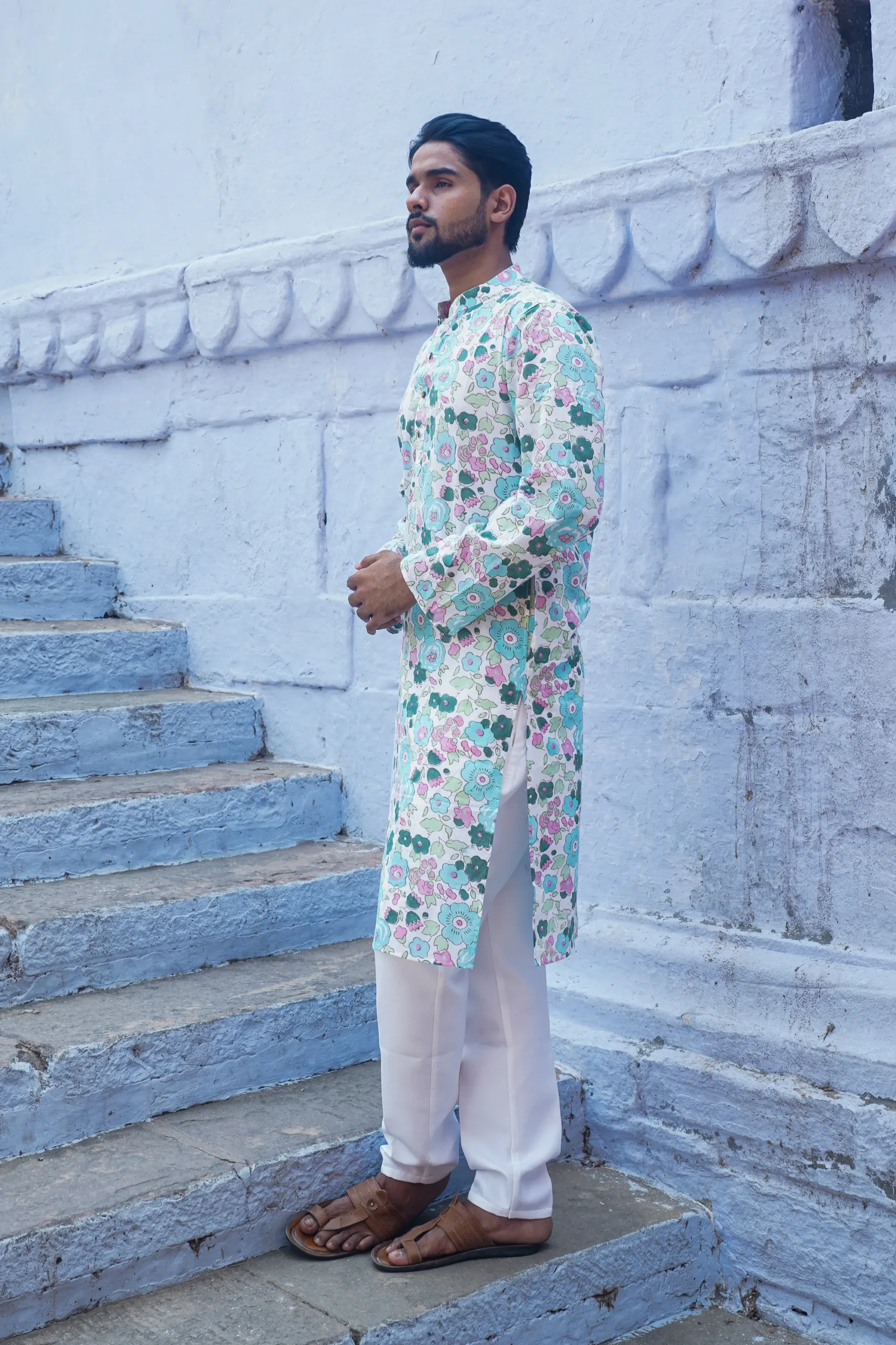 Introducing the Muted Floral Handblock Printed Cotton Kurta Set, a refined expression of understated elegance and comfort. Crafted from pure breathable cotton, the kurta features a minimalistic handblock floral pattern in soothing pastel sky blue and pastel pink hues. Designed with a sophisticated mandarin collar and practical side pockets, it is paired with matching cotton pants, making it perfect for casual gatherings, festive moments, and effortless everyday style.