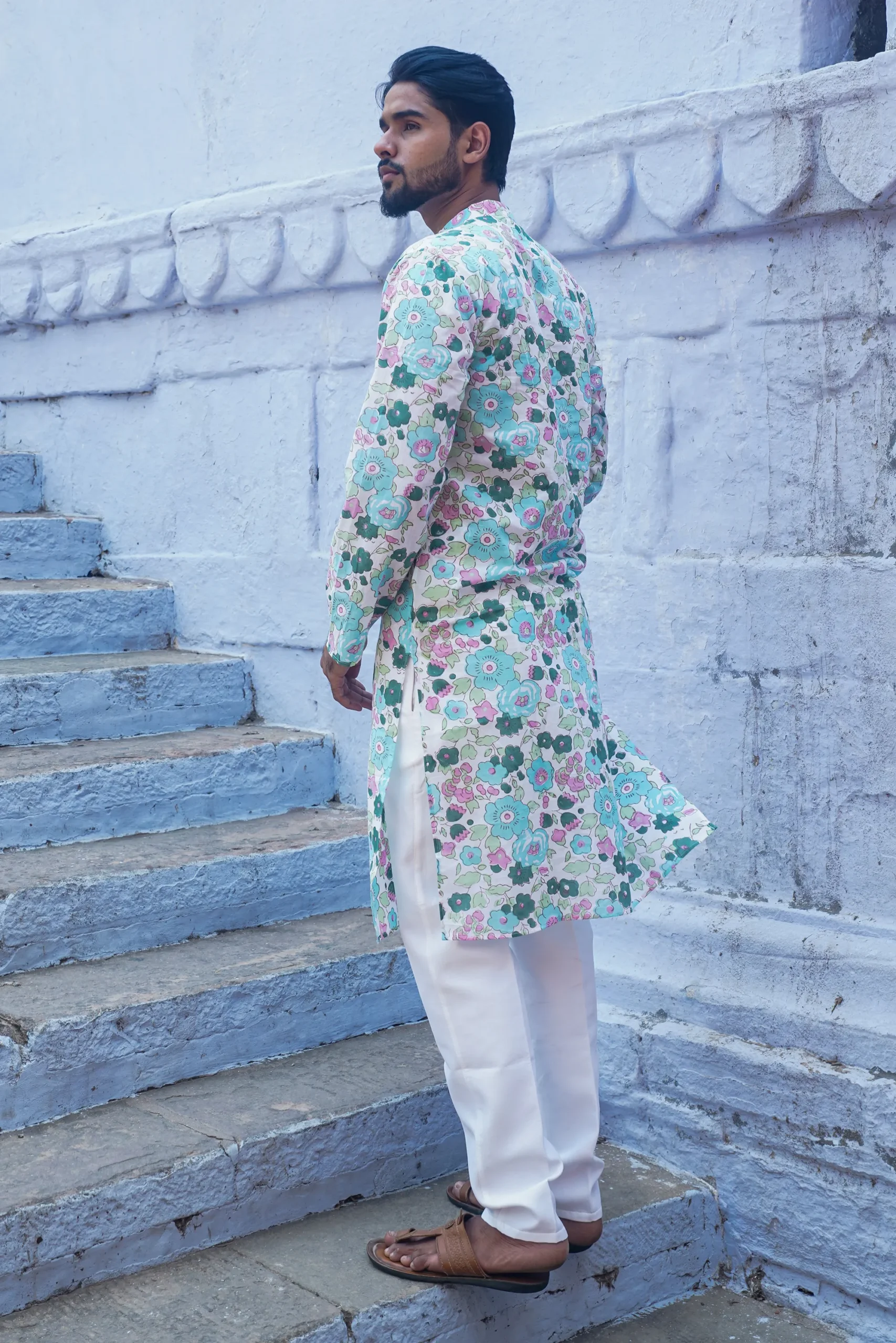 Muted Floral Handblock Printed Cotton Kurta Set with Mandarin Collar & Side Pockets