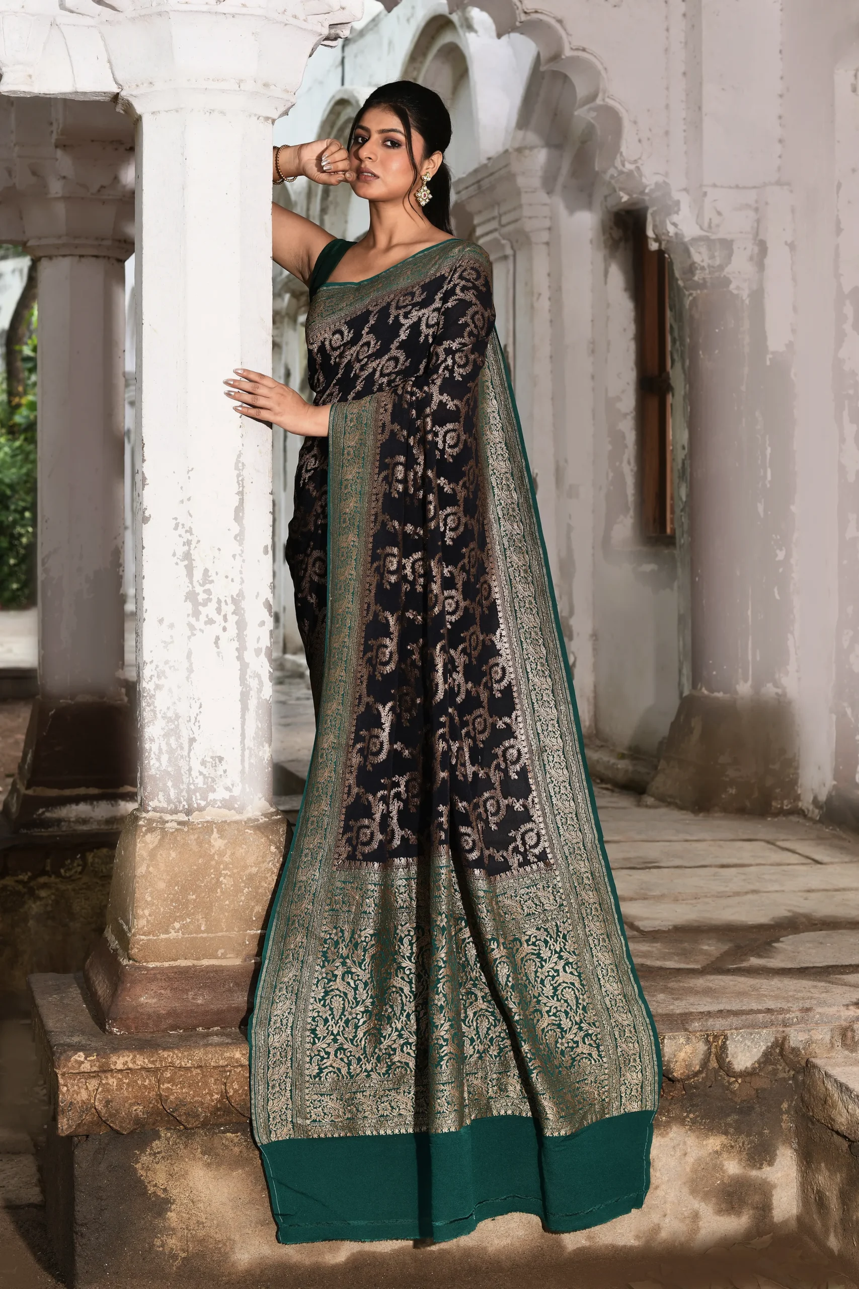 Navy Blue Banarasi Silk Saree with Gold Zari Jaal & Green Border