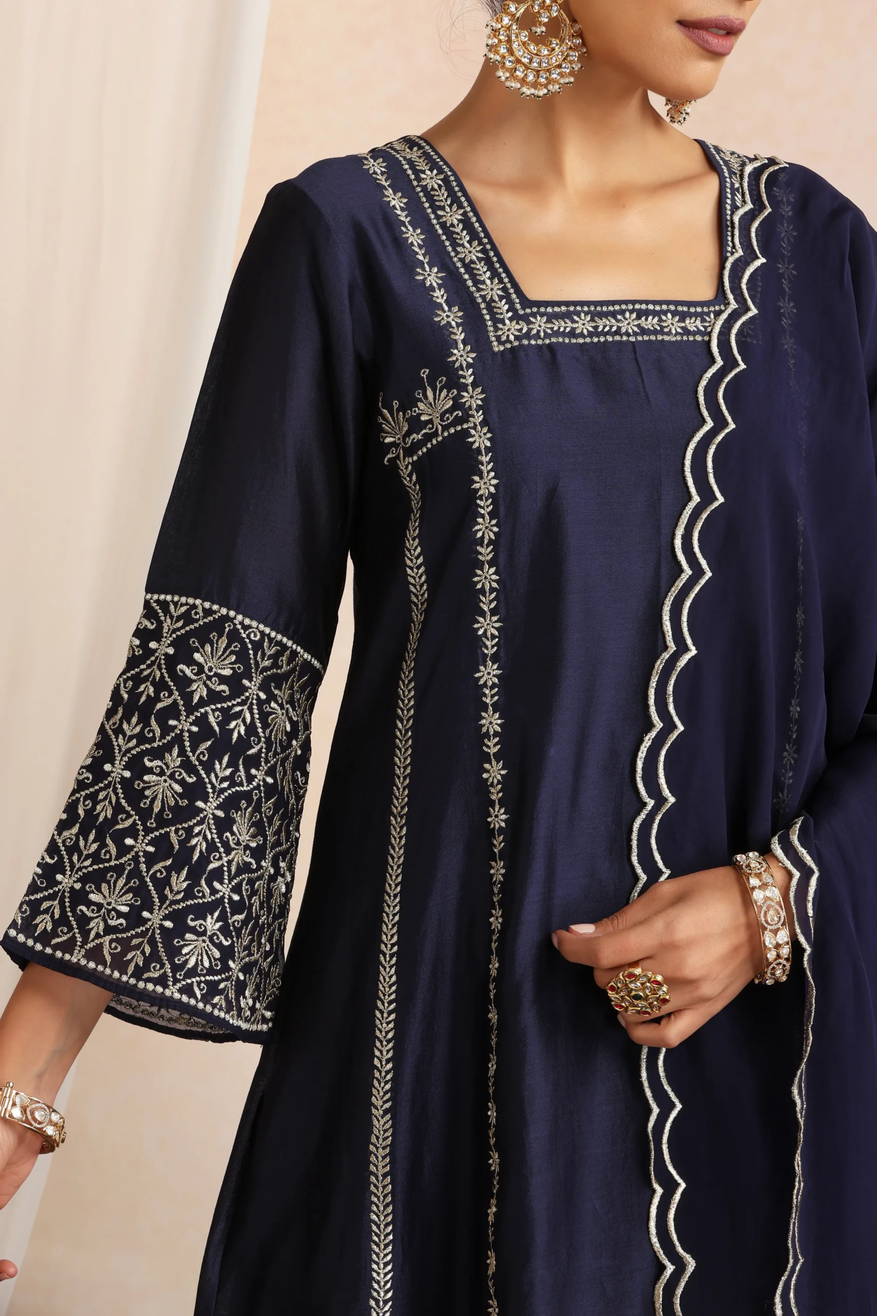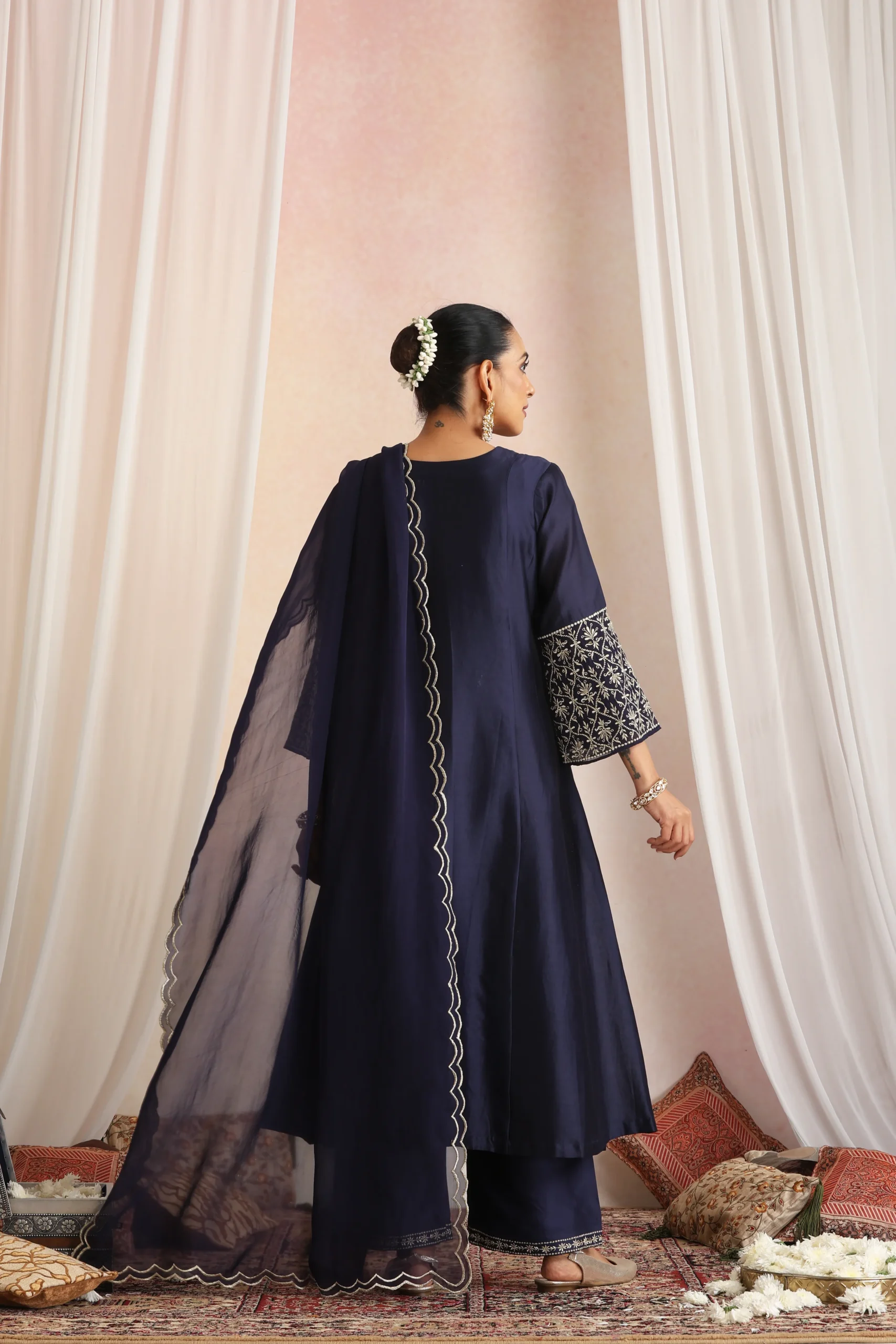 Style this navy blue kurta set with silver oxidised or minimal diamond jewellery to complement its rich, sophisticated tone. Pair it with metallic silver, nude, or navy heels or traditional juttis for a polished ethnic look.