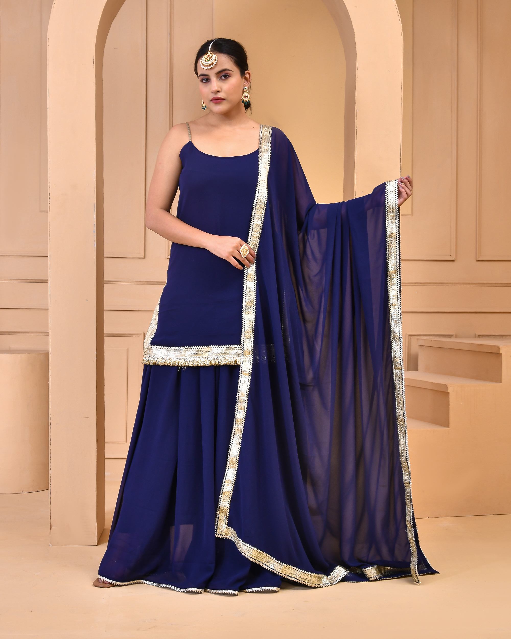Introducing a navy blue georgette sharara set featuring a short-length kurta in solid georgette with gota noodle straps and delicate embellishments, paired with a matching sharara, a coordinated dupatta finished with gota accents, and a complementary potli for a refined look.