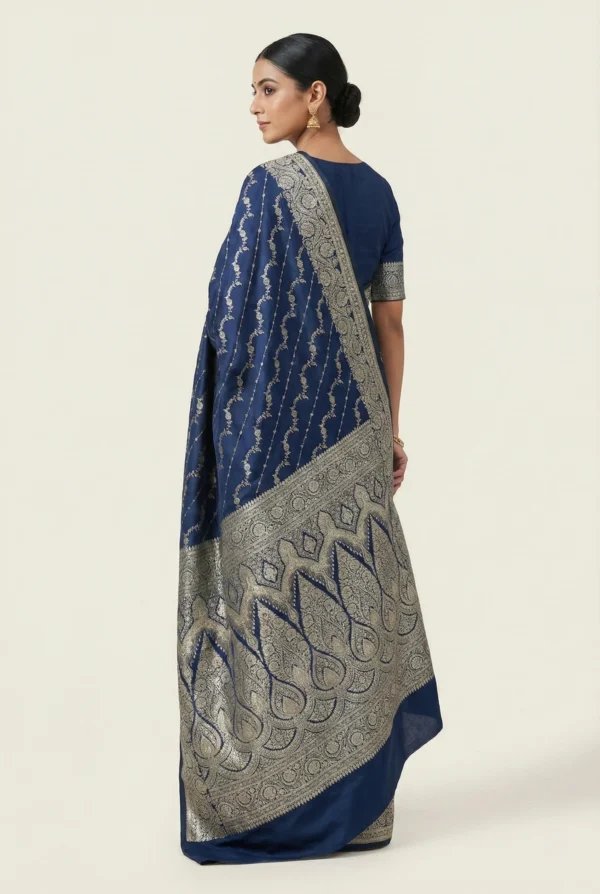 This navy blue Banarasi Mashroo silk saree is handwoven in Varanasi, reflecting timeless craftsmanship and heritage artistry. Designed by Naaritva Banaras, it comes with a running blouse piece. Each saree is crafted with passion, love, and devotion by skilled weavers.
