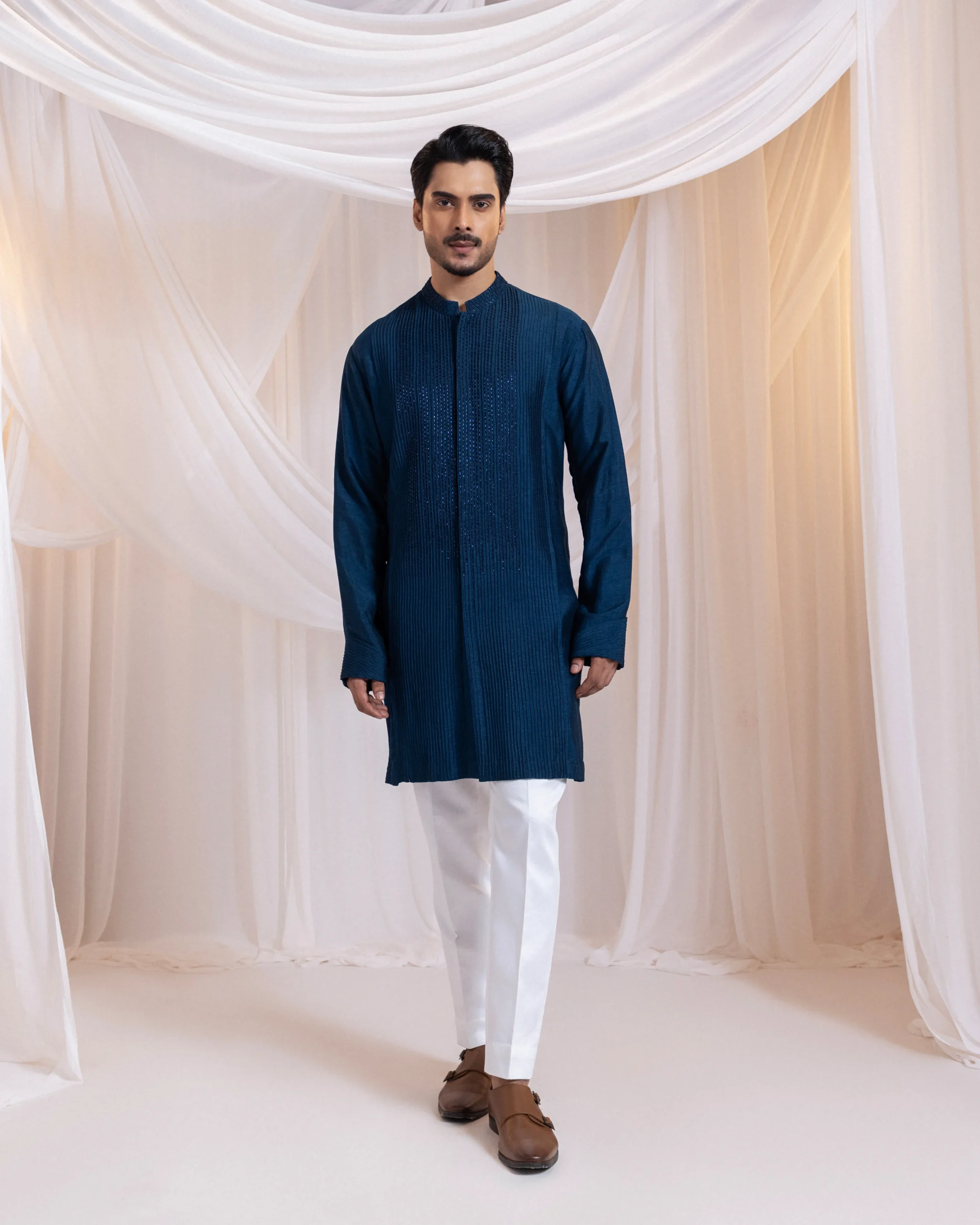 Introducing a Navy blue kurta set defined by sharp vertical pintuck detailing across the front and sleeve hems, accented with subtle cutdana embellishments that catch the light with a refined shimmer. Crafted in a rich, structured fabric, its clean, tailored silhouette offers a bold yet sophisticated presence—perfect for modern festive evenings and elevated celebrations.