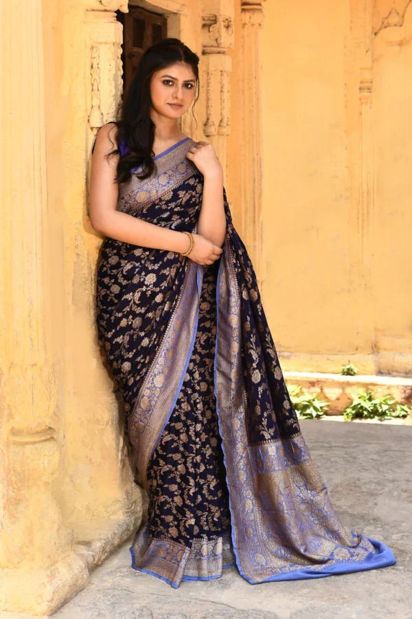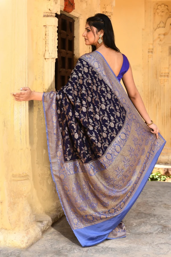 Navy Blue Saree with Silver Zari Jaal Buta & Contrast Border Pallu