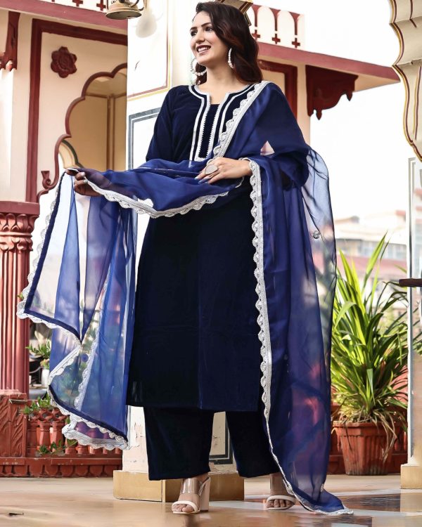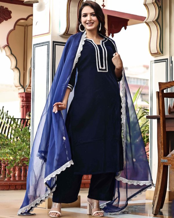 Introducing a navy blue velvet silk kurta set. The kurta is crafted from rich velvet silk, offering a soft texture and graceful drape, paired with matching pants for a clean, monochrome silhouette. The ensemble is elevated with a beautifully handcrafted organza dupatta, finished with delicate detailing that adds lightness and contrast.