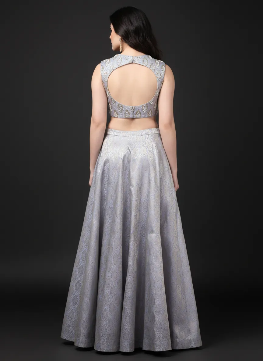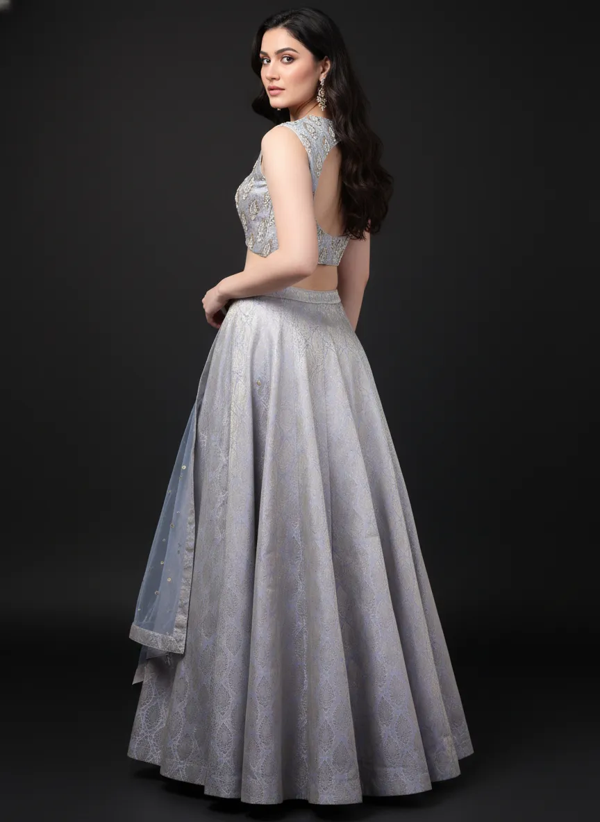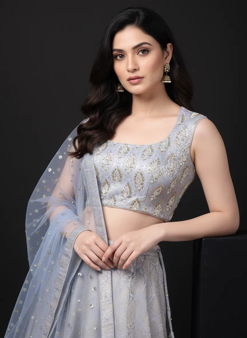 Neutral Lavender Banarasi Lehenga with Pearl One-Shoulder Blouse & Net Dupatta