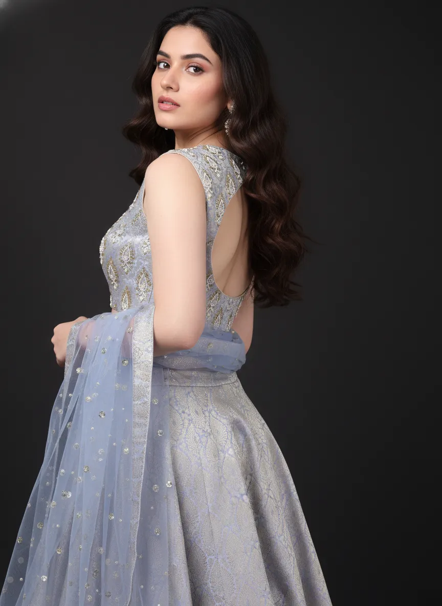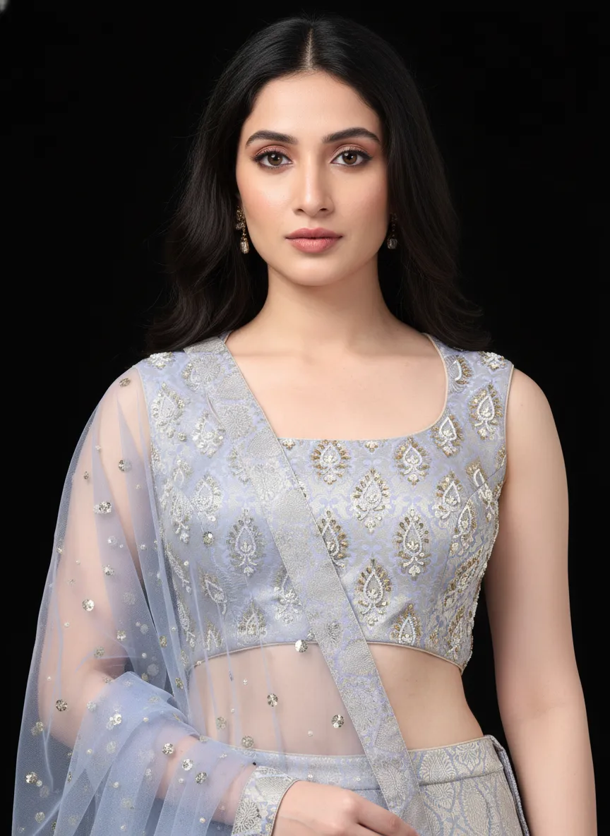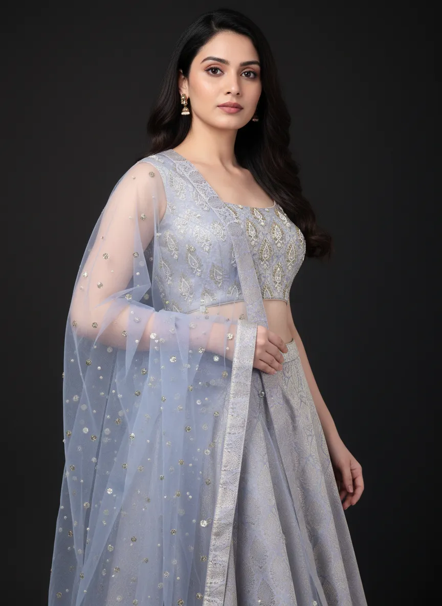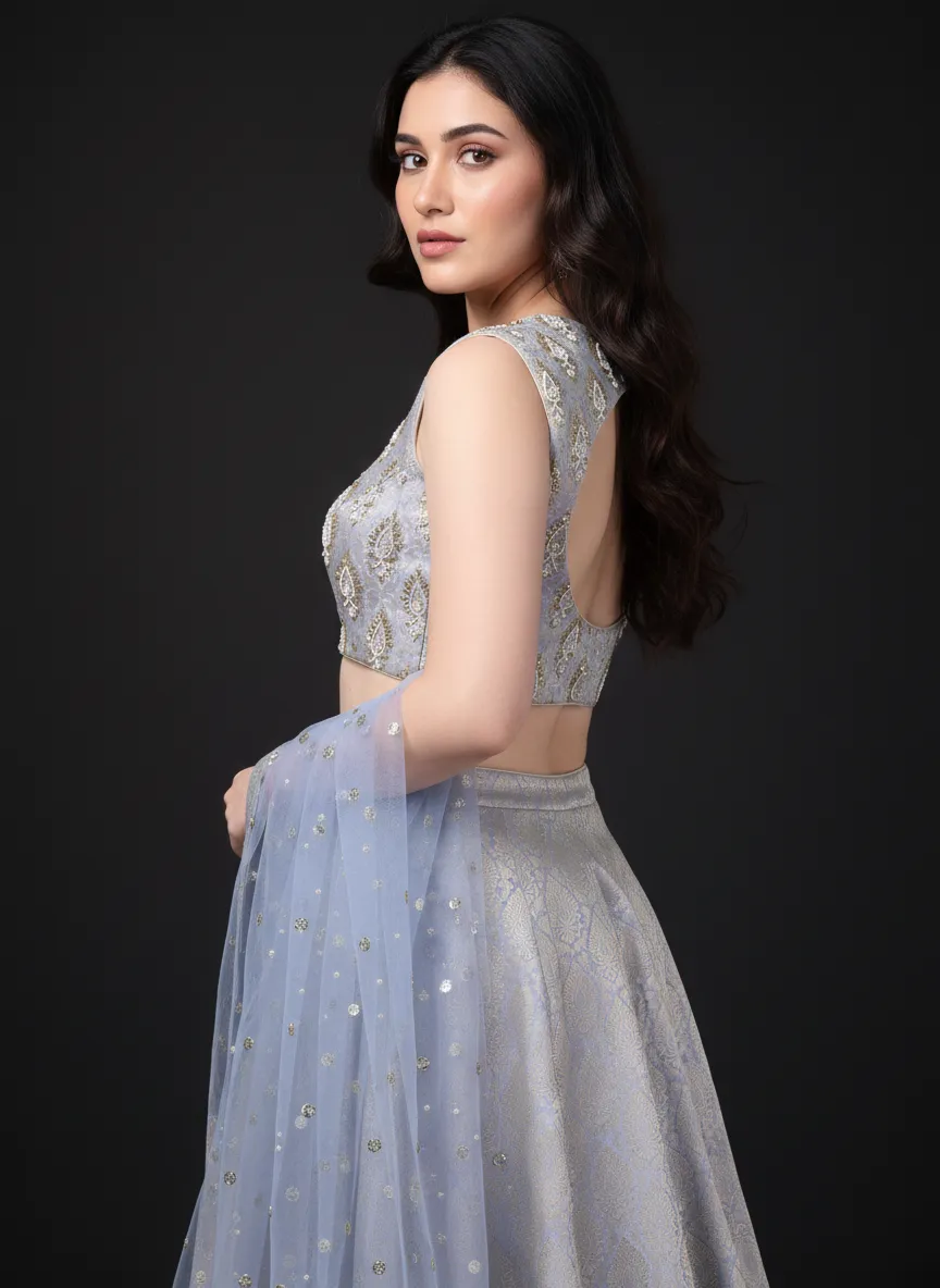 Neutral Lavender Banarasi Lehenga with Pearl One-Shoulder Blouse & Net Dupatta