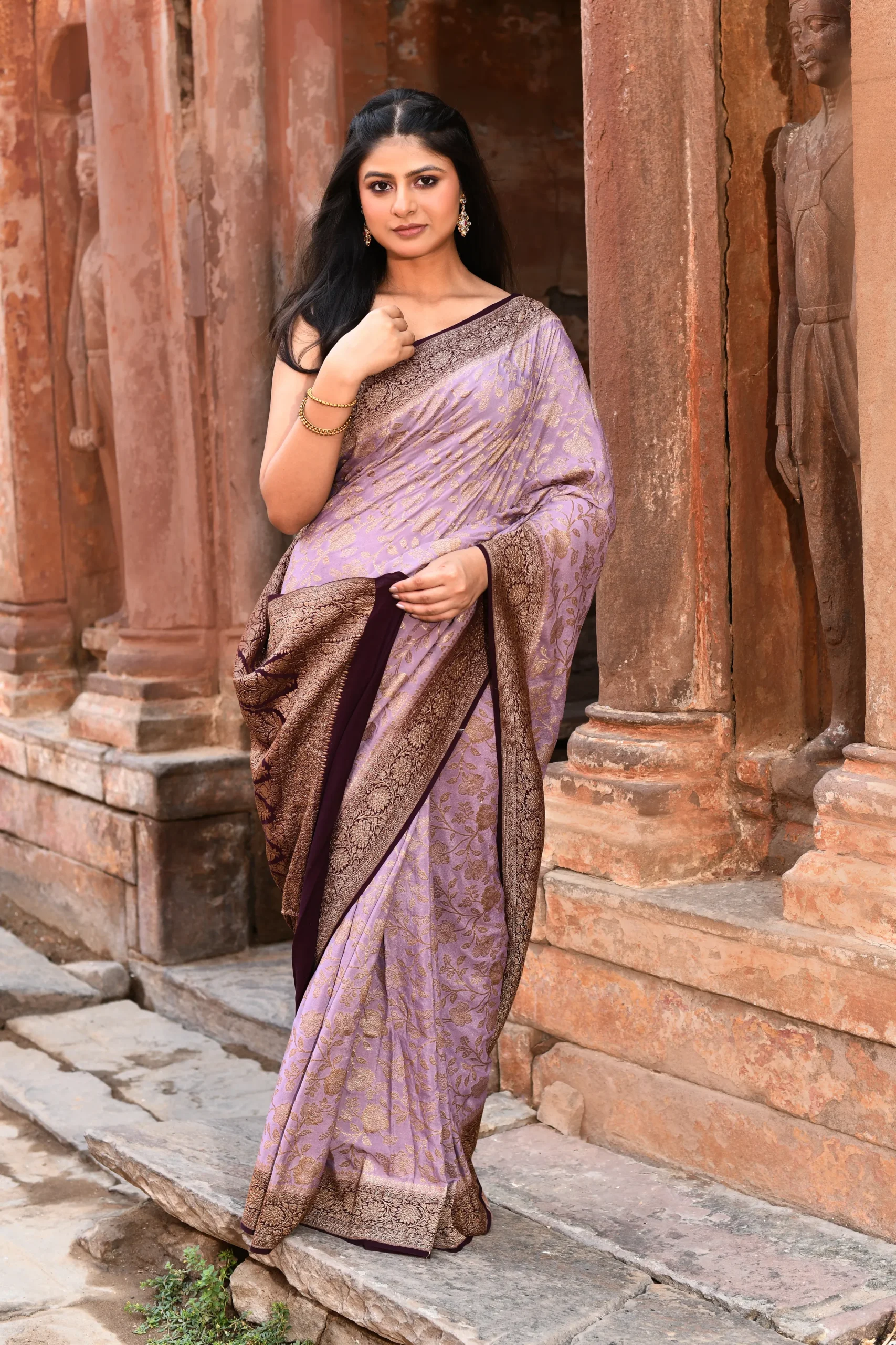 Plum Purple Banarasi Soft Silk Saree with Silver Gold Zari Floral Jaal from Golden Muslin By Naaritva Banaras
