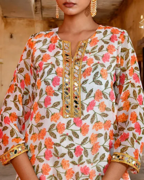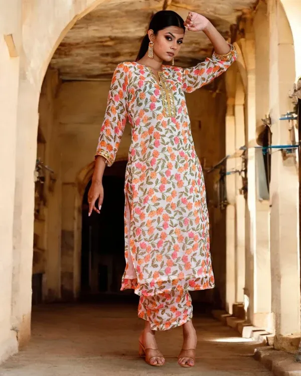 Introducing a soft, graceful, and effortlessly elegant off-white chiffon kurta pant set designed for refined everyday and festive dressing. The kurta features delicate floral prints that lend fresh, feminine charm to its fluid silhouette, while lightweight chiffon ensures an airy, comfortable drape. Versatile and timeless, this ensemble blends ease with understated sophistication for modern ethnic wardrobes.
