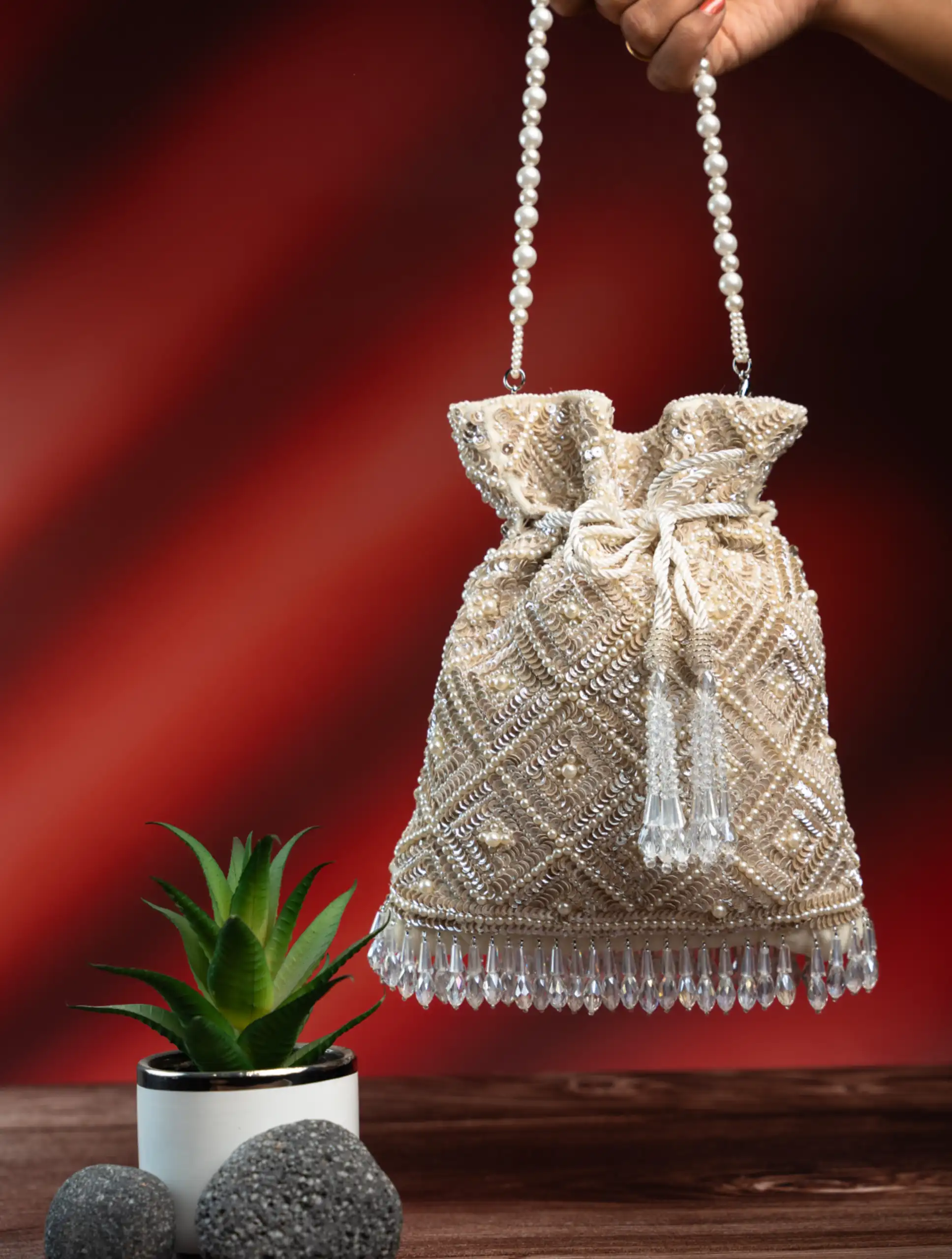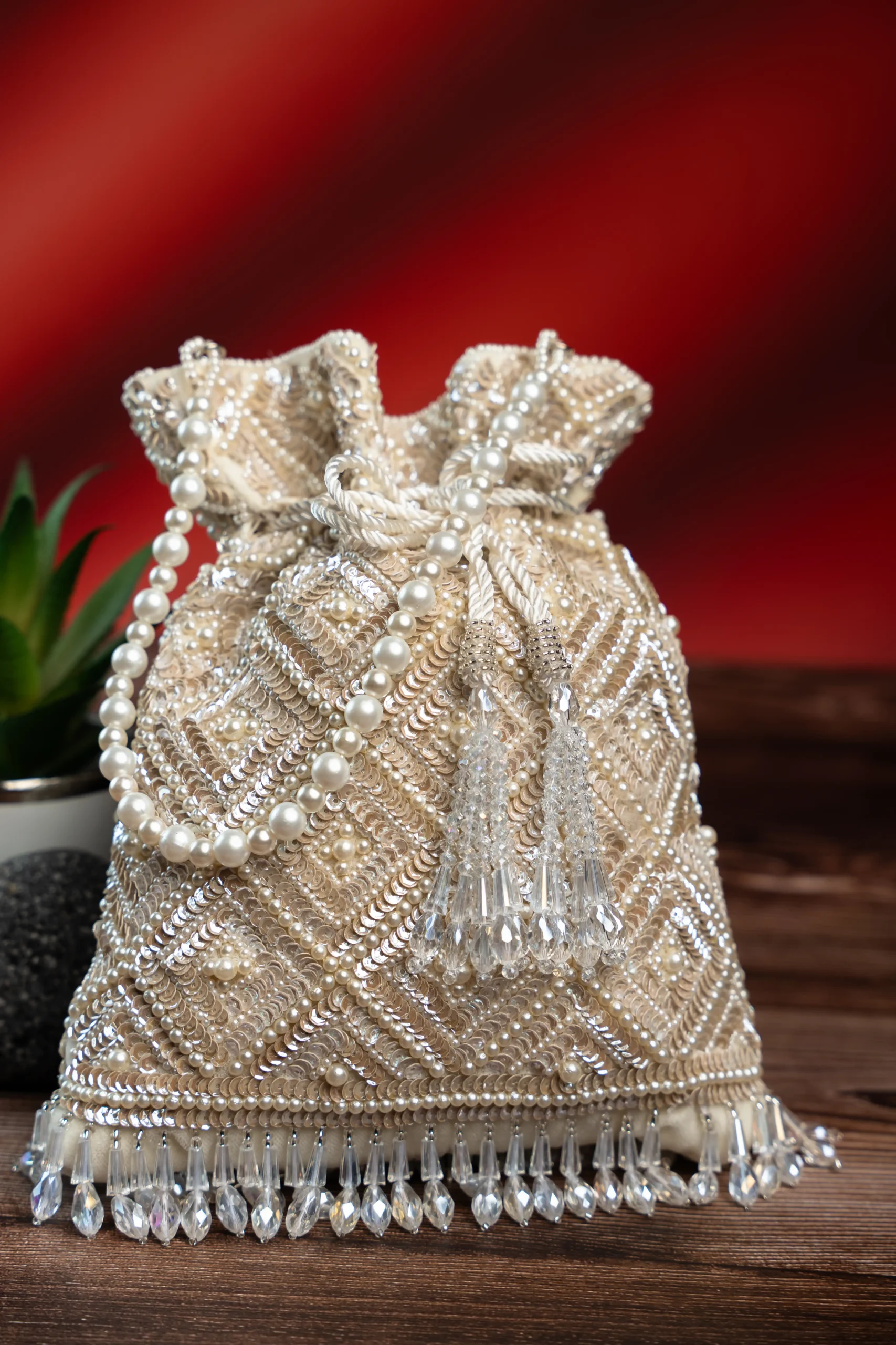 Off White Modish Potli with Criss-Cross Delicate Pearl Embellishment