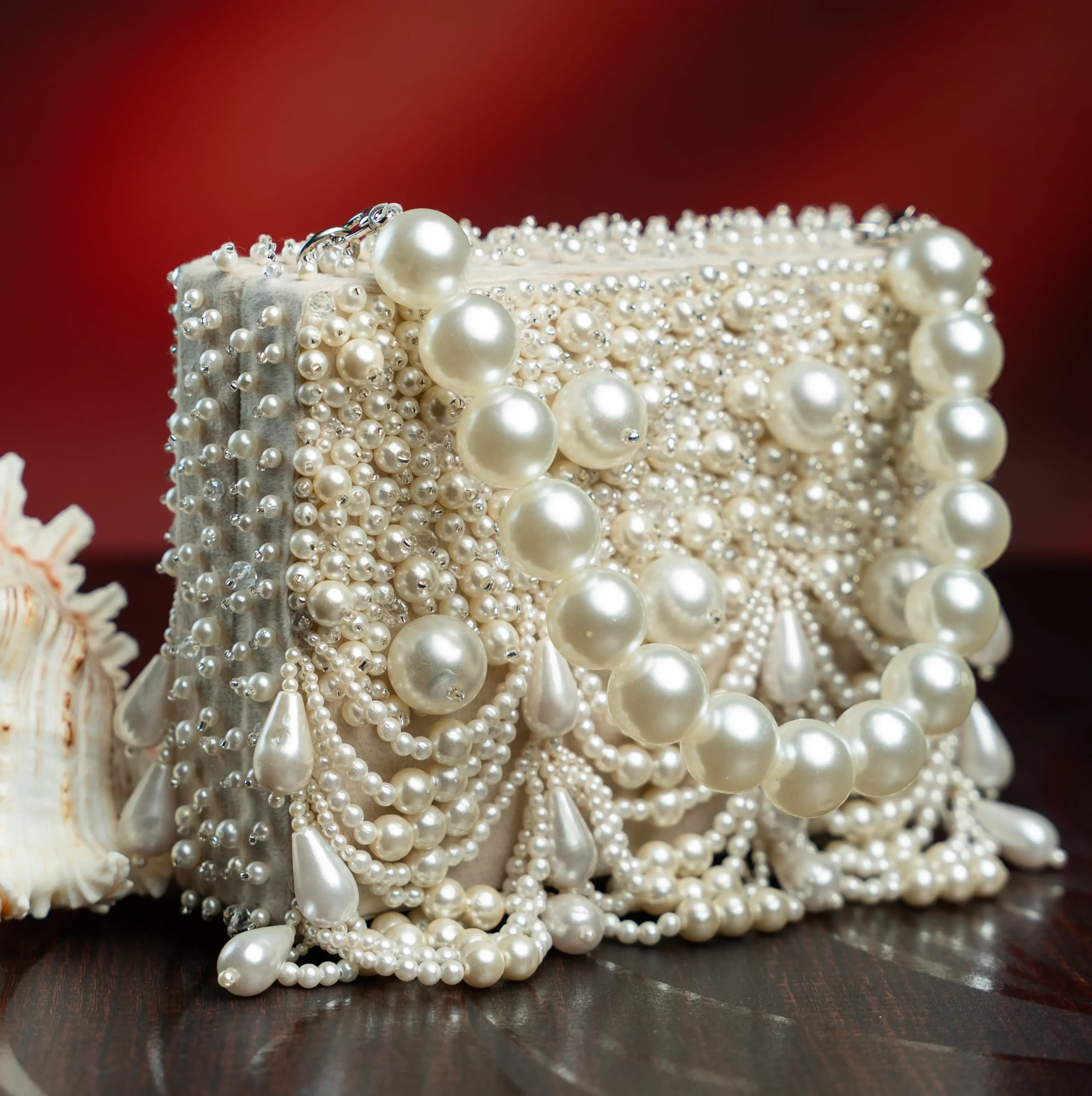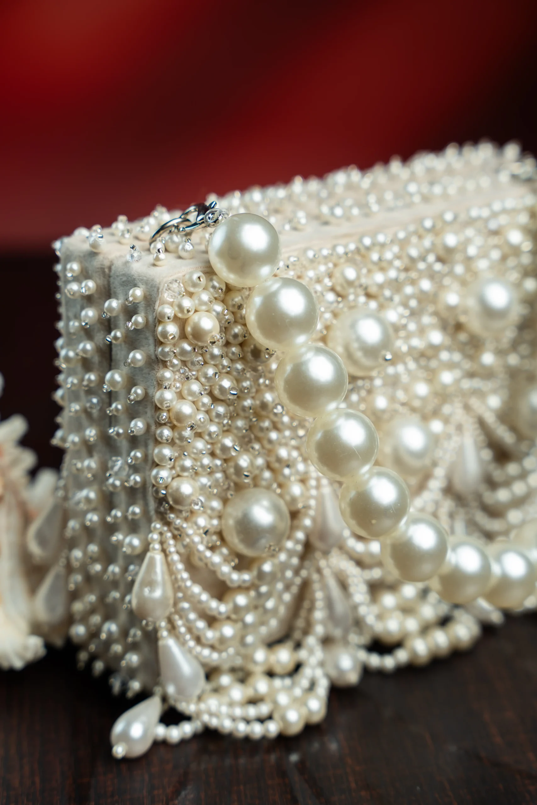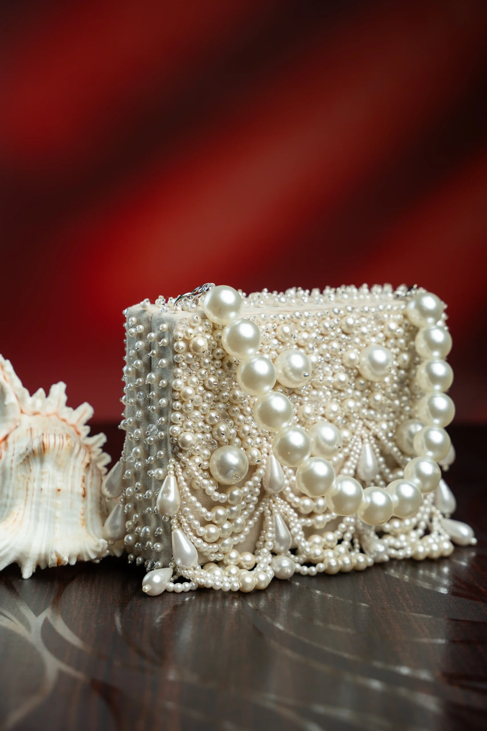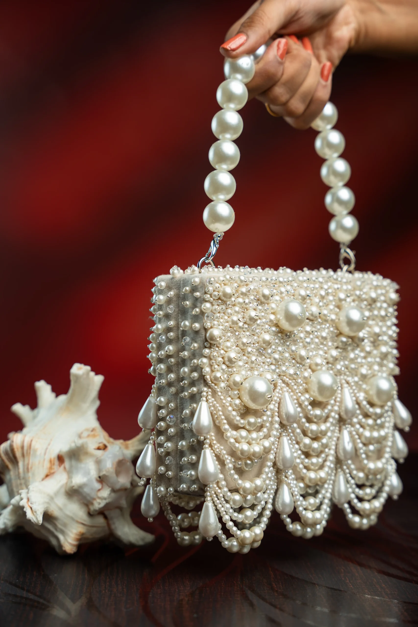 Pair this elegant clutch with pastel lehengas, ivory sarees, or contemporary Indo-western ensembles. The pearl scallop detailing and tassels add graceful movement and subtle sparkle, while the off white tone complements pearl jewellery and metallic heels for a polished festive look.