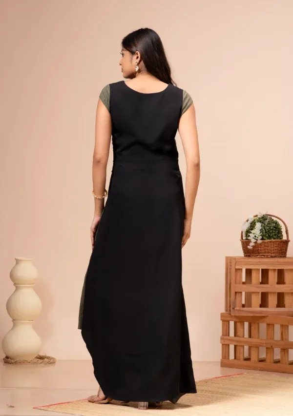 Accentuating an olive green linen cotton pleated cowl gown featuring intricate embroidery at the waist and a sleek solid black back. This gown beautifully blends elegance and contemporary design.