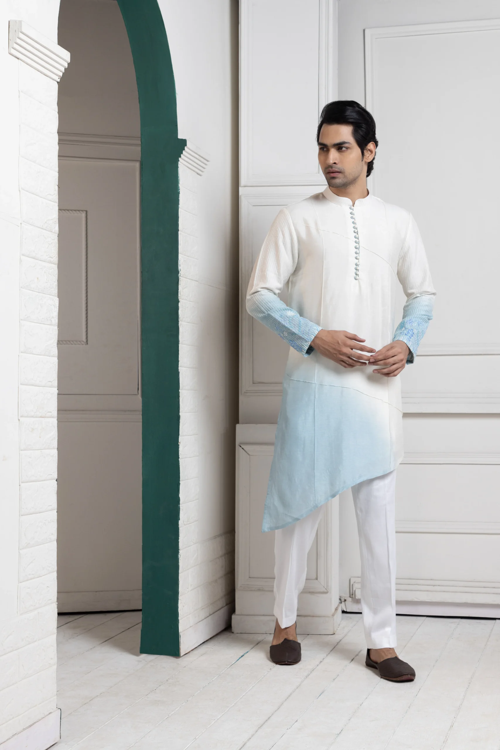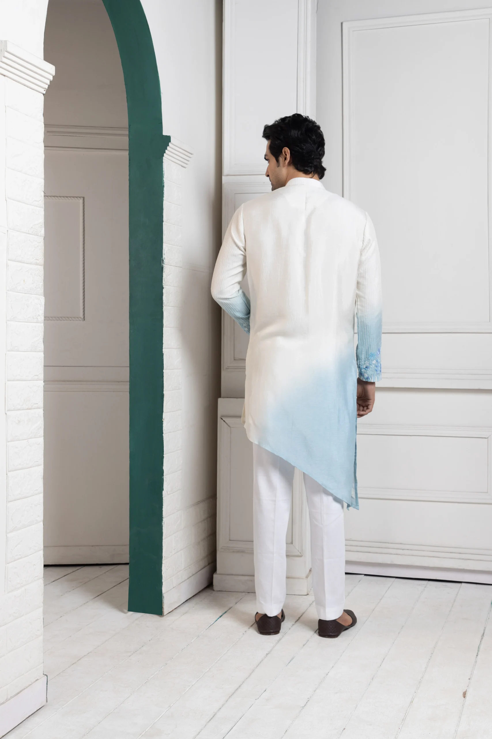 Ivory to Powder Blue Ombre Asymmetric Kurta Set with Tailored Trousers
