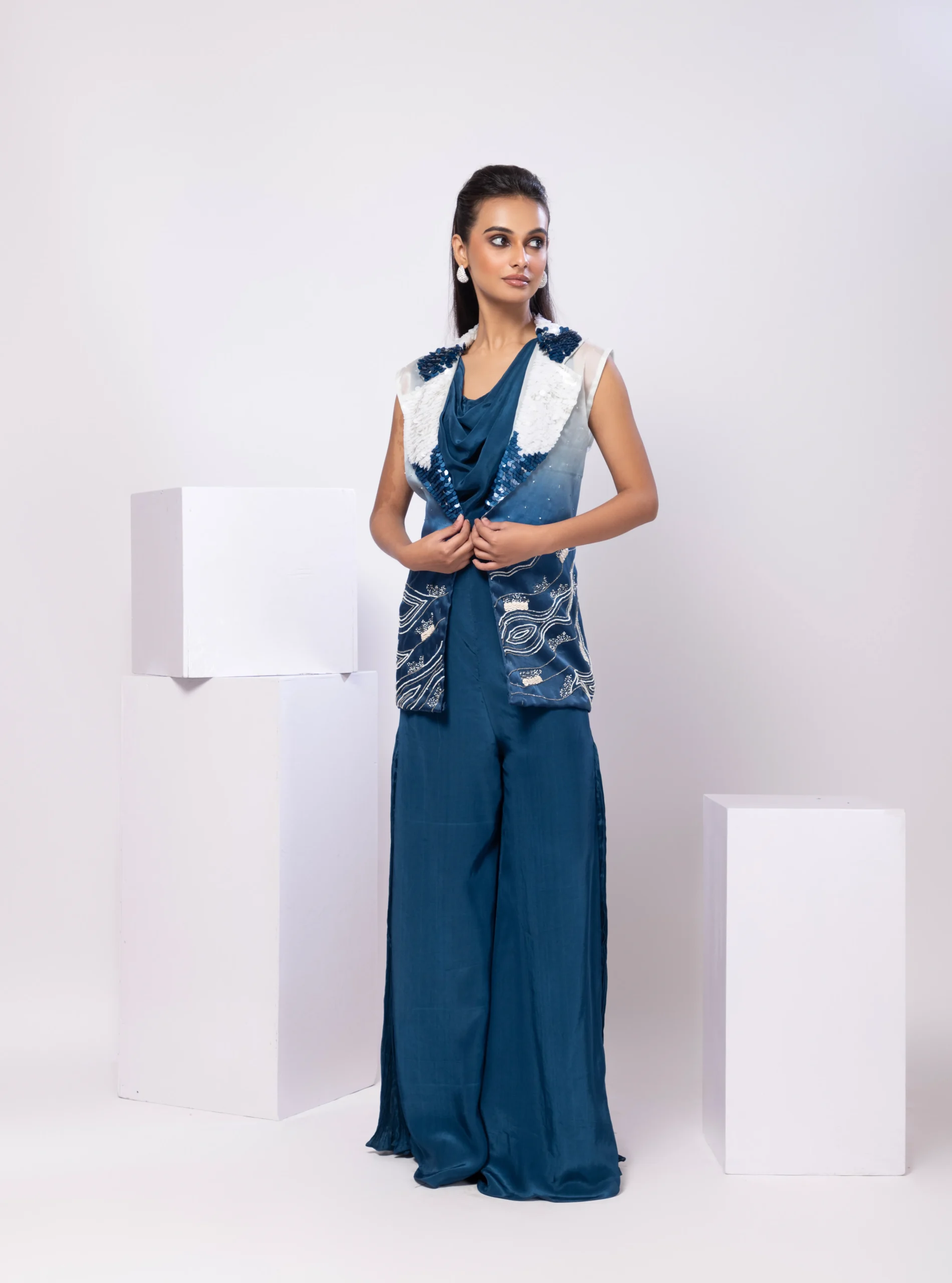 Introducing the Ombre Sequin Collar Co-Ord Set, a striking blend of contemporary flair and refined glamour. The statement ombre jacket is elevated with a shimmering sequinned collar, adding luminous detail. Paired with a matching cowl top and navy blue flared pants featuring subtle side gathers, this ensemble offers fluid movement and modern sophistication’s perfect for festive evenings and stylish soirees.