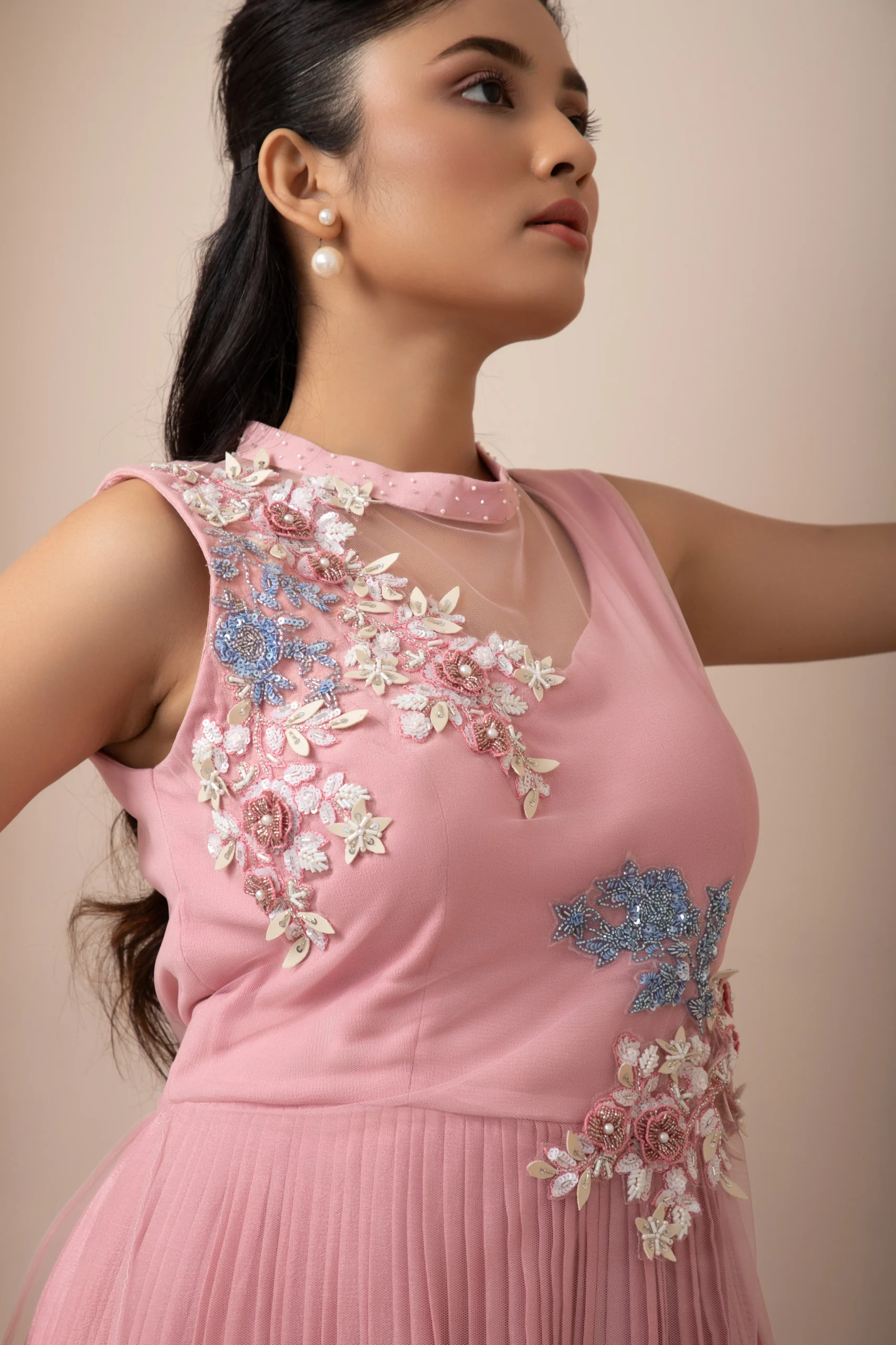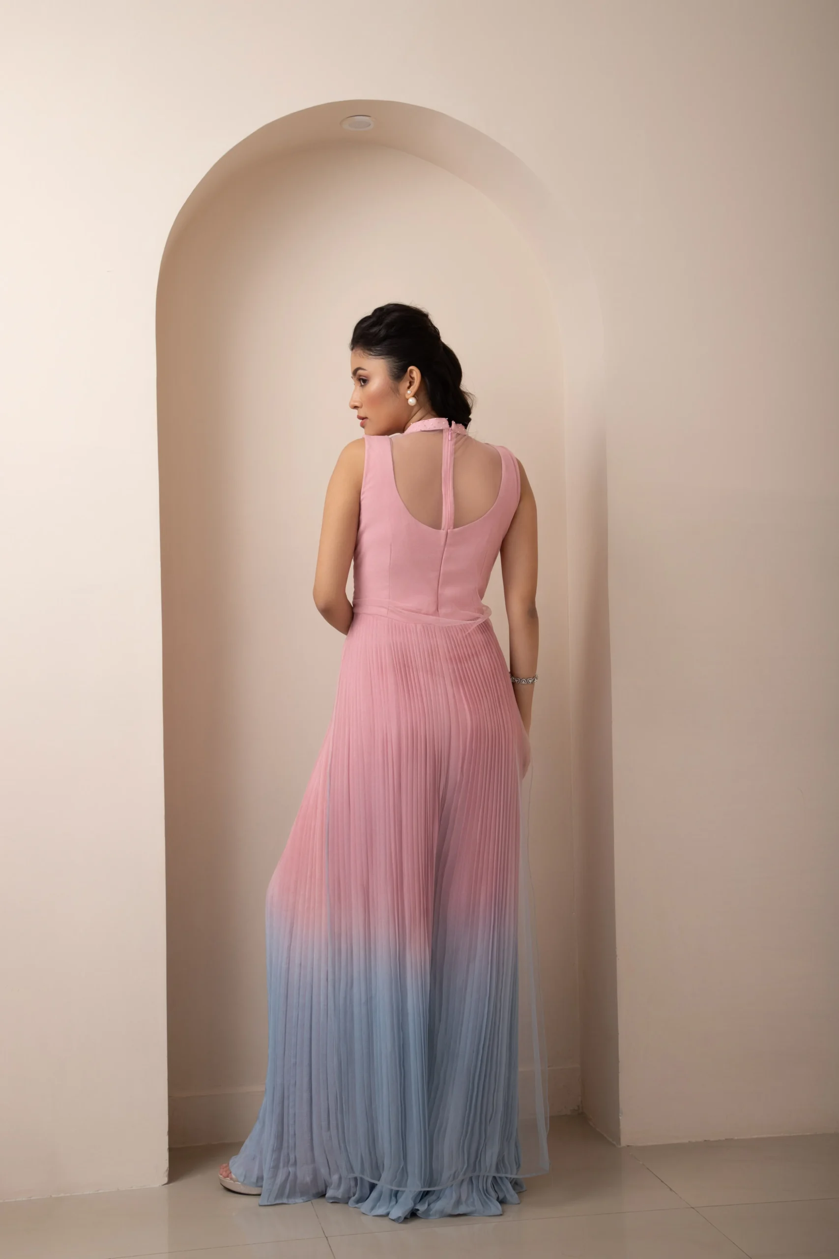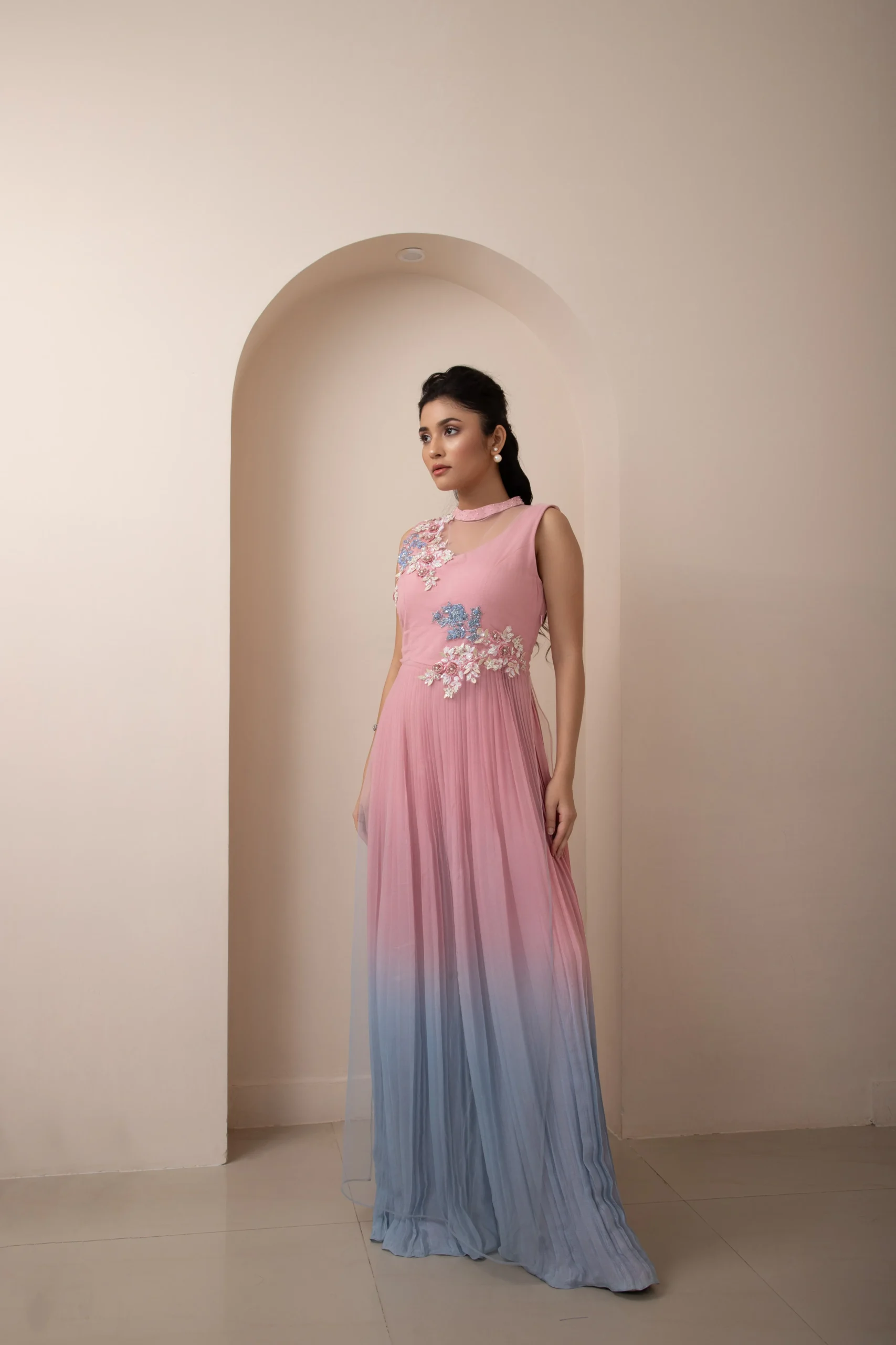 Introducing an ethereal ombre wide-leg, floor-length jumpsuit designed to make a graceful statement. Featuring a seamless transition from blush pink to serene blue, this ensemble creates a mesmerizing visual flow. Hand-placed floral embroidery and delicate 3D appliques in soft white and blue cascade asymmetrically from the shoulder across the bodice, adding depth and artistry. Crafted with layered pleats and fine net detailing, this jumpsuit is perfect for soirees, celebrations, and standout occasions.