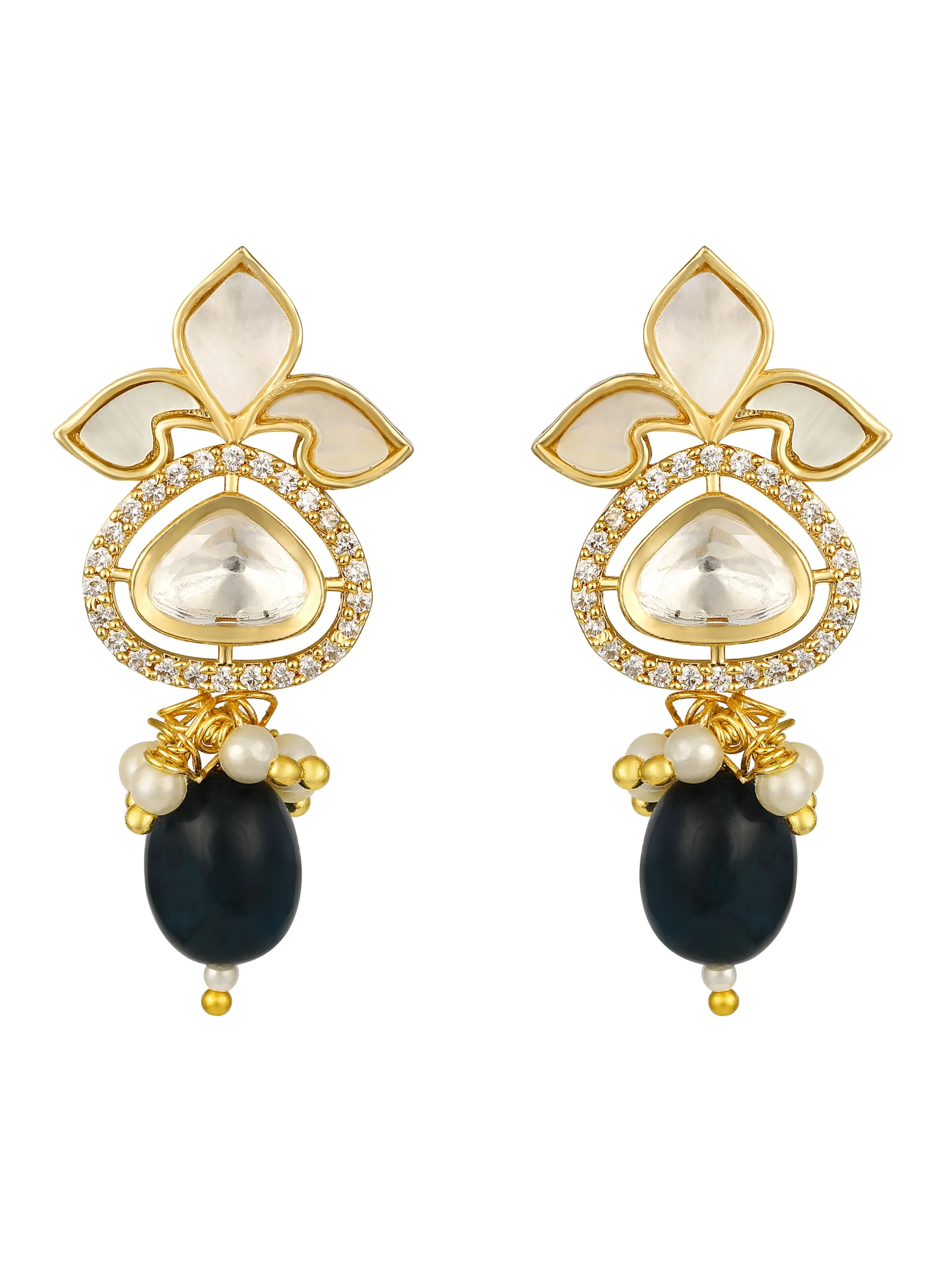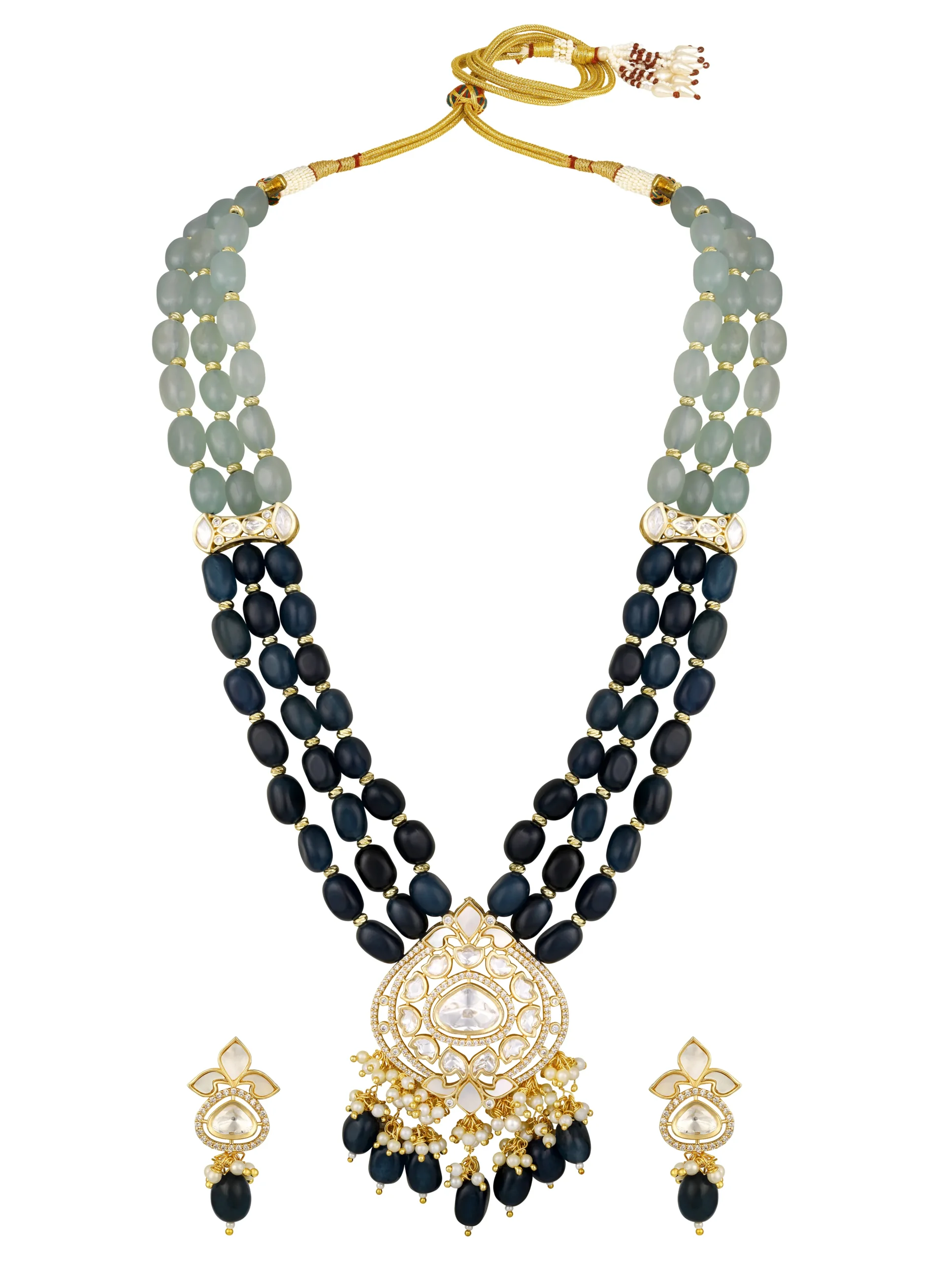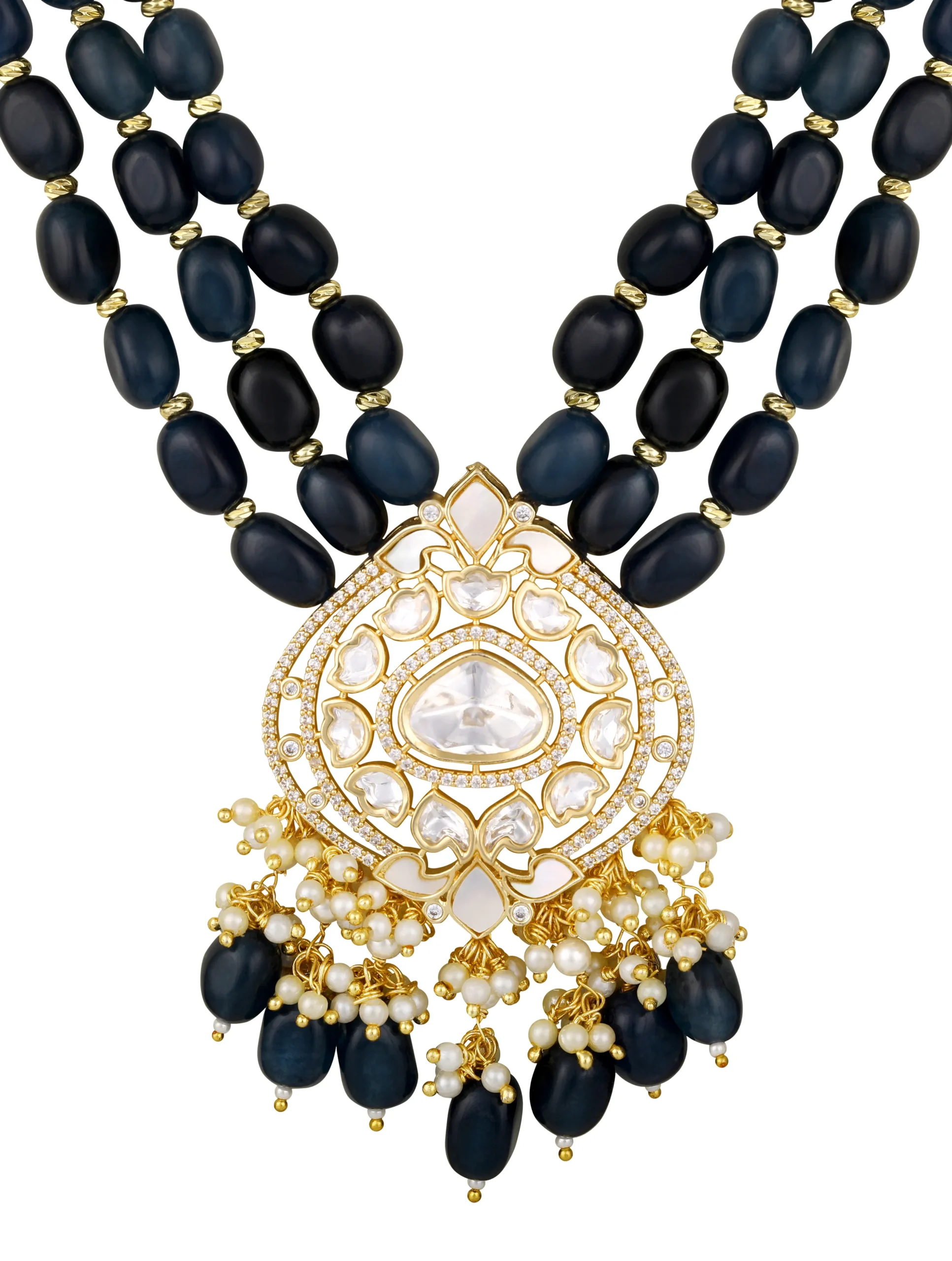 Introducing Onyx Tumble Kundan Polki Necklace Set with Mother of Pearl Gold Finish, a graceful handcrafted design set in micron gold polished brass. Featuring shimmering moissanite kundan polki, elegant onyx tumbles, luminous mother of pearl beads, and sparkling zirconia accents, this necklace set brings timeless sophistication to festive celebrations and weddings.