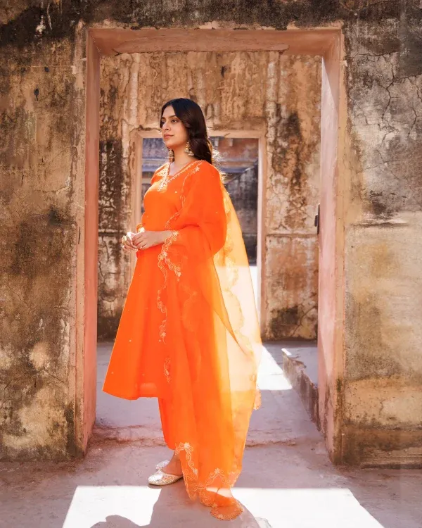 Introducing an orange cotton silk kurta set that radiates festive warmth and artisanal elegance. Adorned with delicate aari embroidery, the kurta is subtly detailed at the neckline and across the surface, enhancing its refined craftsmanship. Crafted in cotton silk for a soft sheen and comfortable drape, this ensemble offers timeless sophistication—perfect for festive occasions, daytime celebrations, and elegant cultural gatherings.