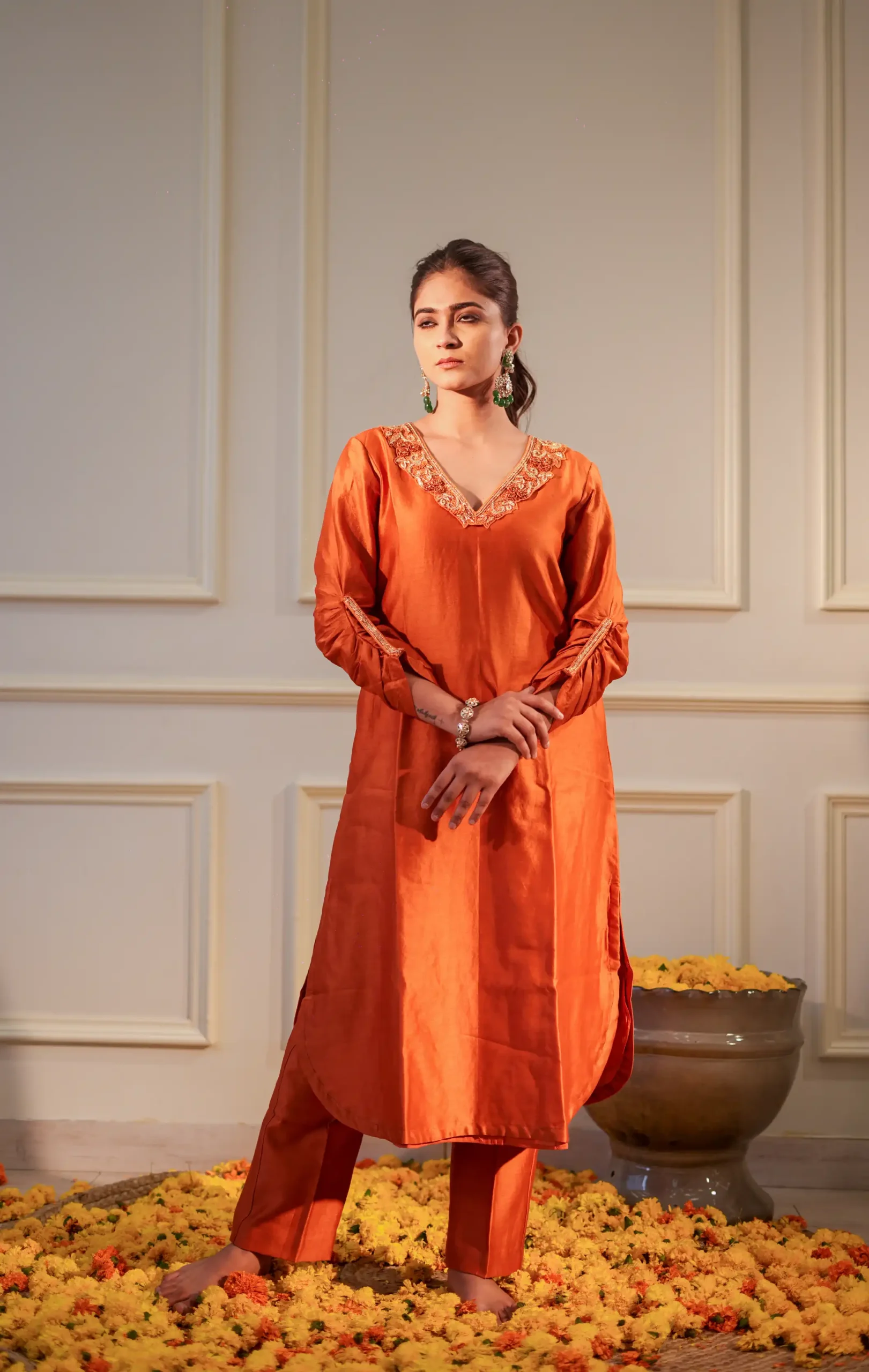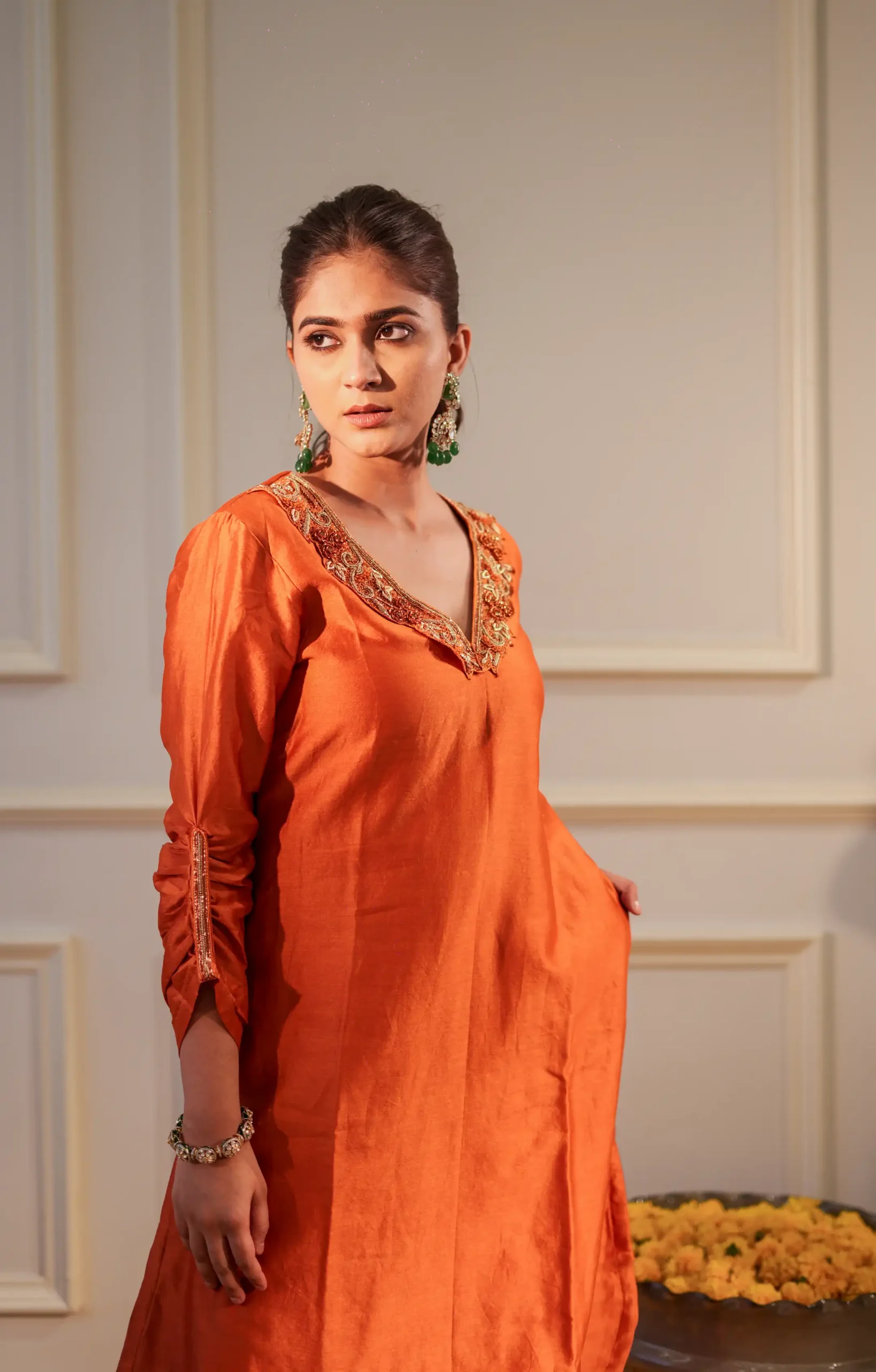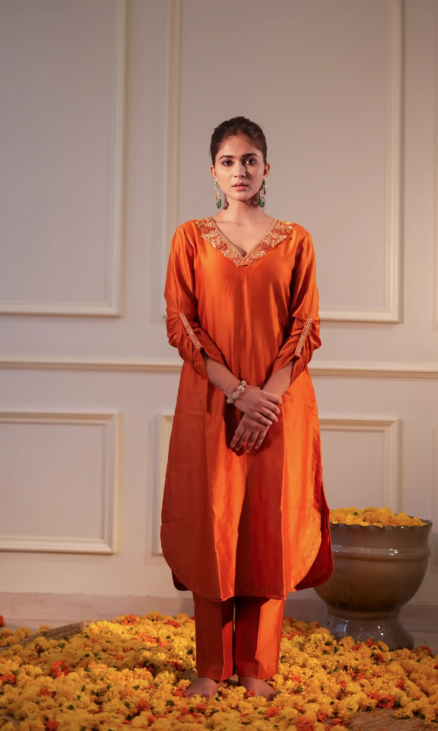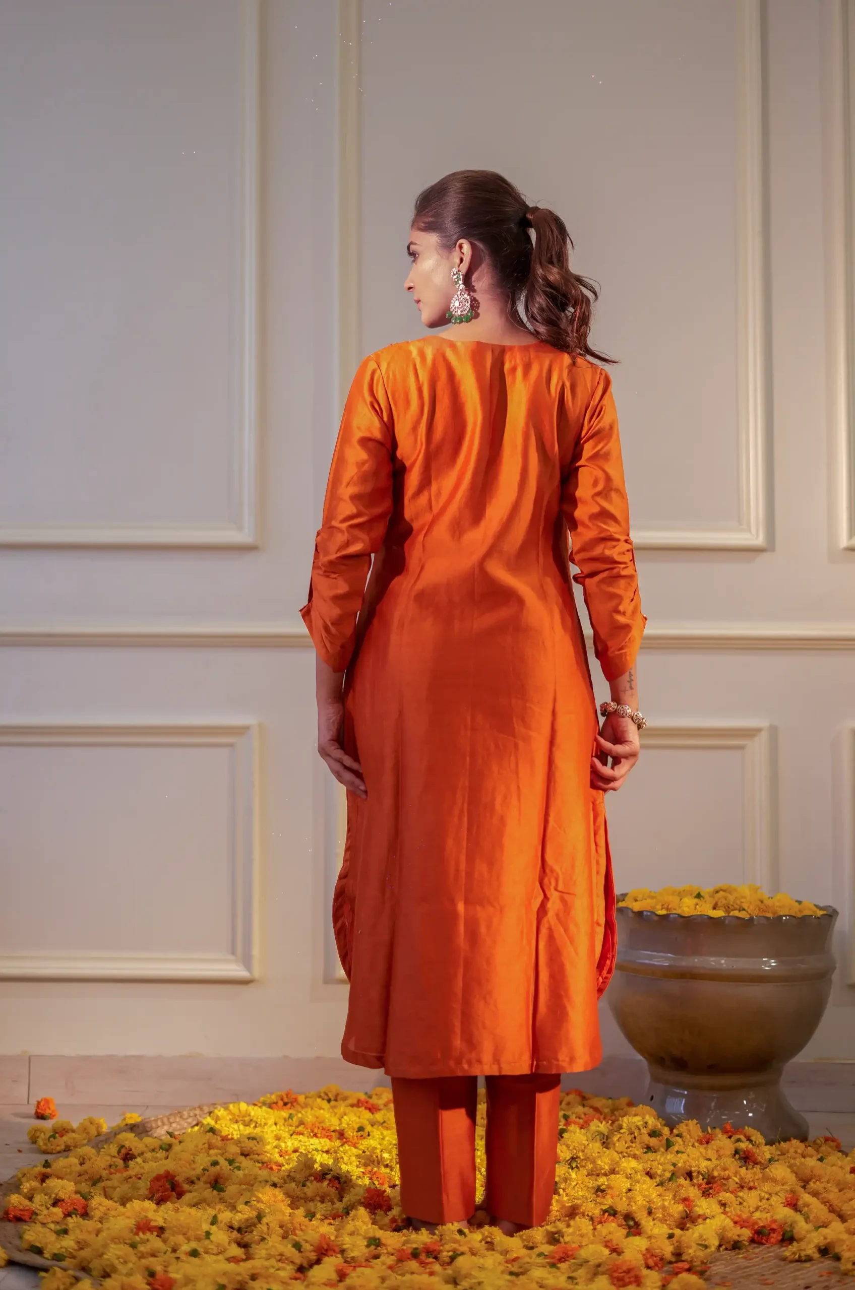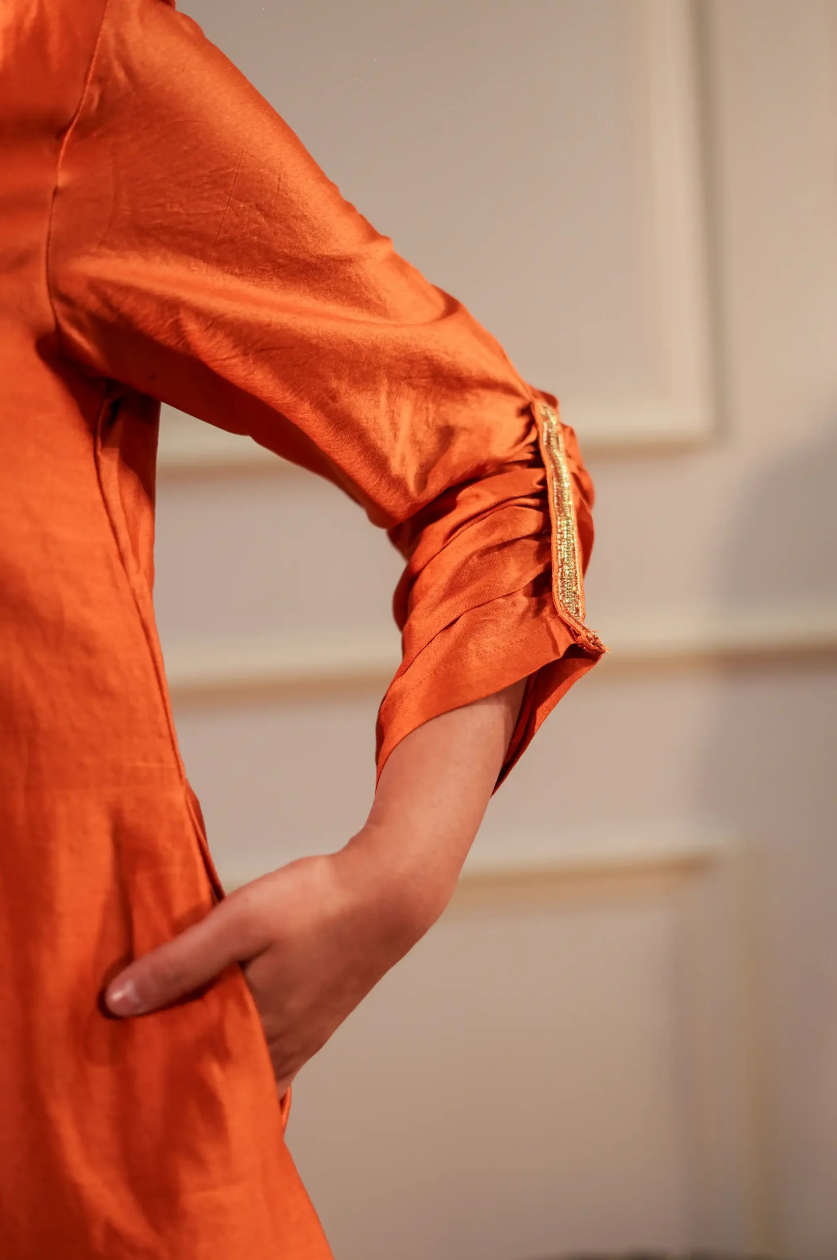 Introducing the Orange Embroidered Chanderi Silk Kurta Set with Gathered Sleeves and Pants, a vibrant ensemble that beautifully reflects traditional craftsmanship and modern elegance. Crafted from luxurious Chanderi silk, the kurta features delicate embroidery along the neckline and stylish gathered sleeves that add a refined festive charm. Paired with straight Chanderi silk pants designed with a front belt and back elastic for a comfortable fit, this outfit is perfect for festive celebrations, family gatherings, and elegant day-to-evening occasions.