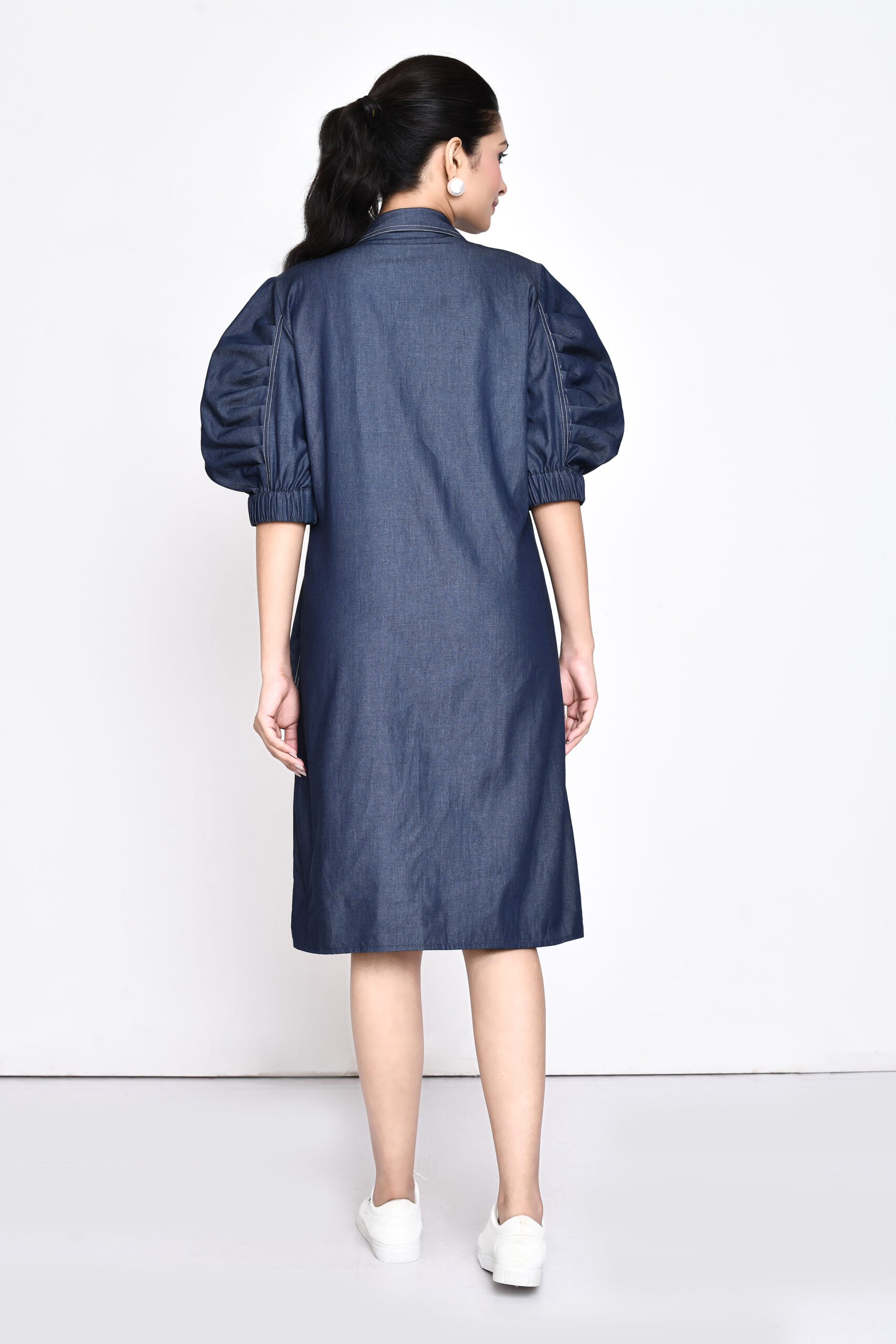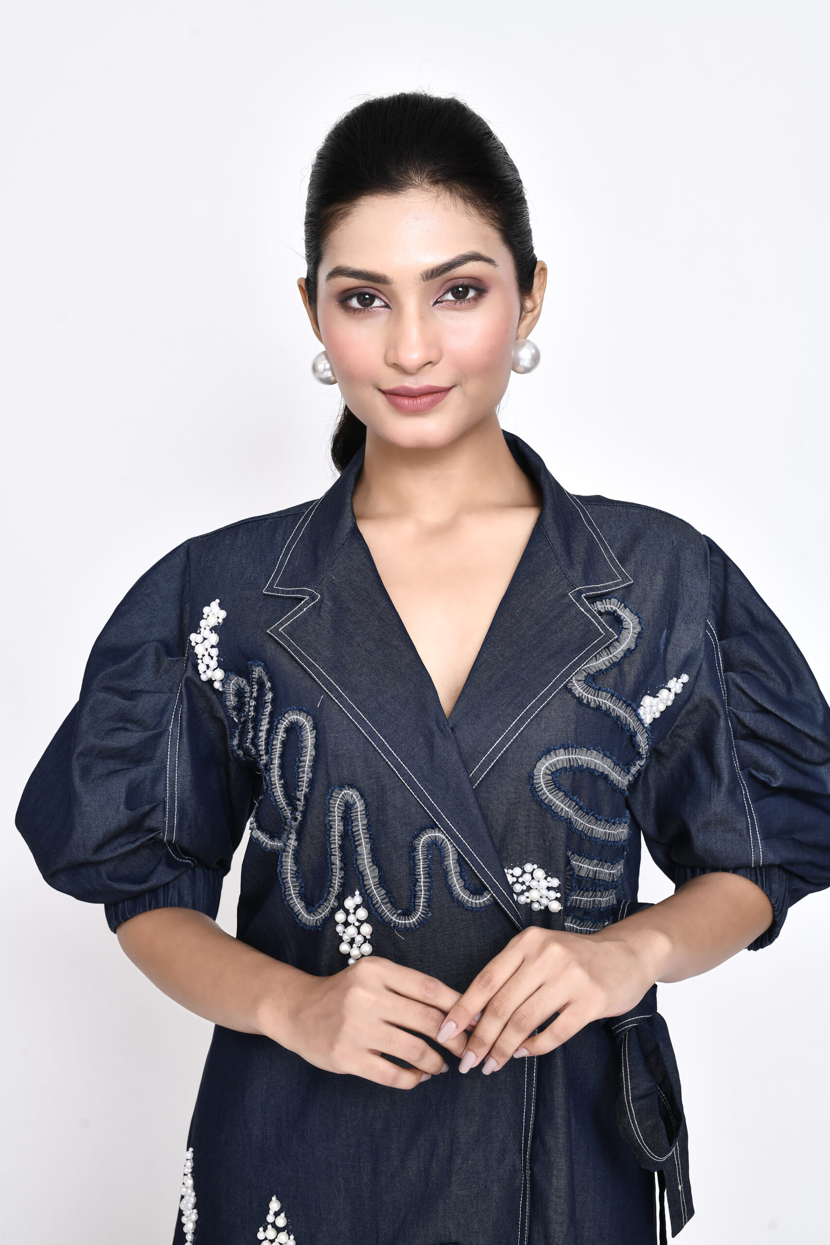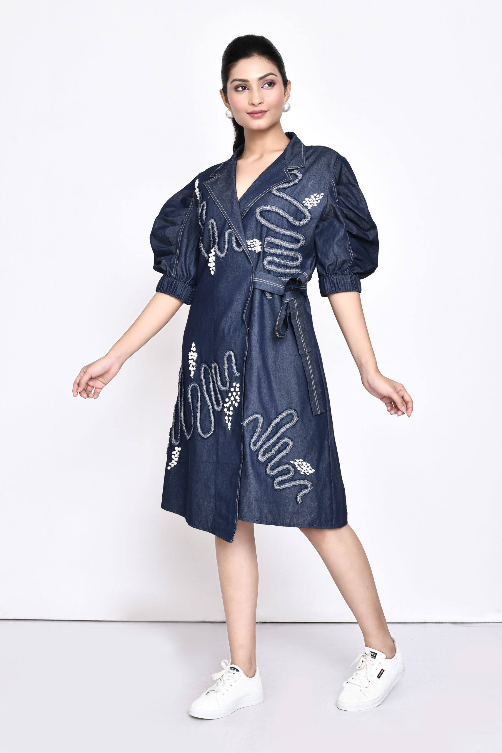 Showcasing a comfortable overlap denim dress, designed with a stylish tie-up belt detailing that cinches the waist for a flattering silhouette. Featuring unique stylized sleeves, lapel collar, this dress is adorned with pearl and denim embellishments that elevate its look. The contrast stitching adds a modern twist, making it a standout piece in your wardrobe.