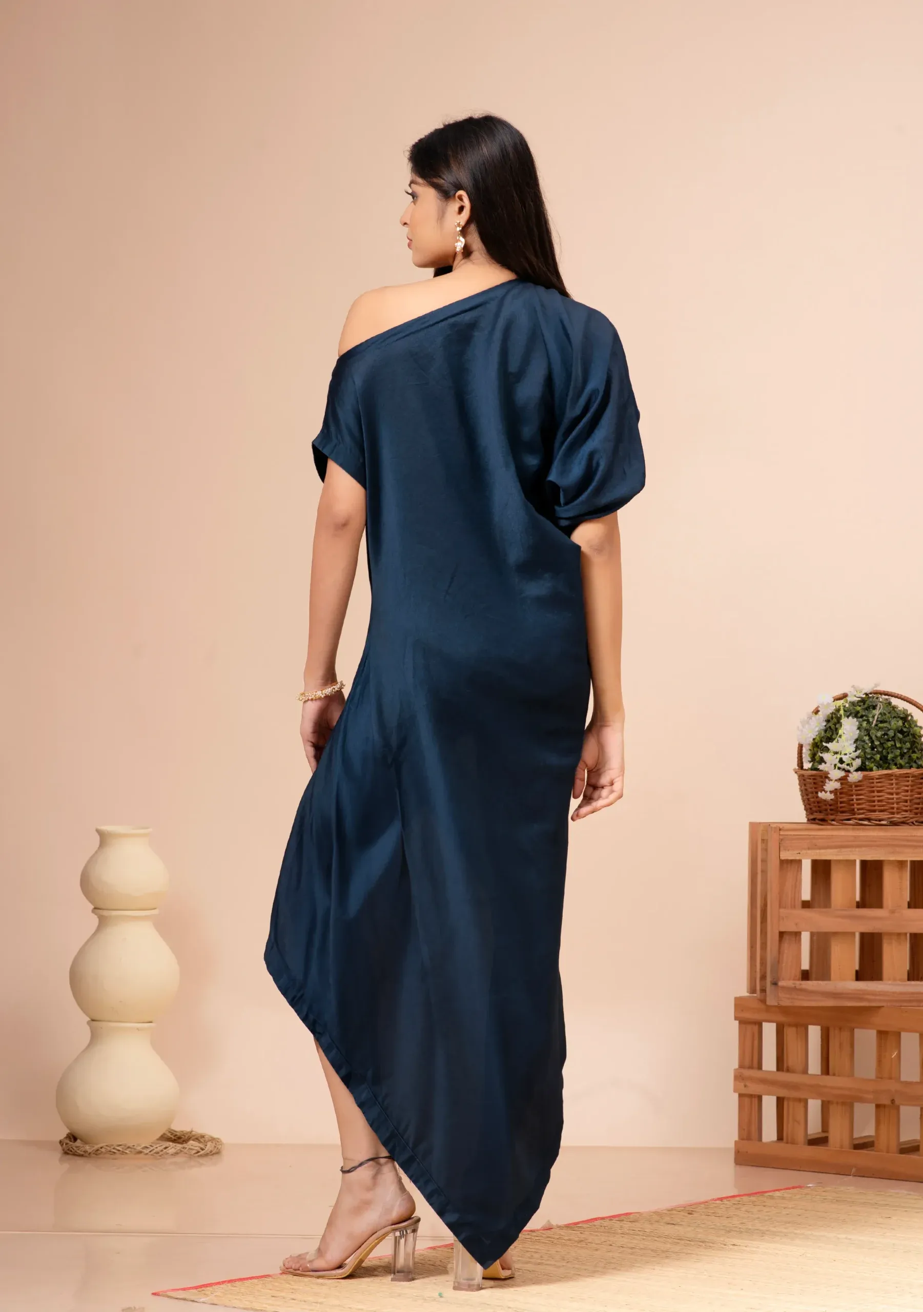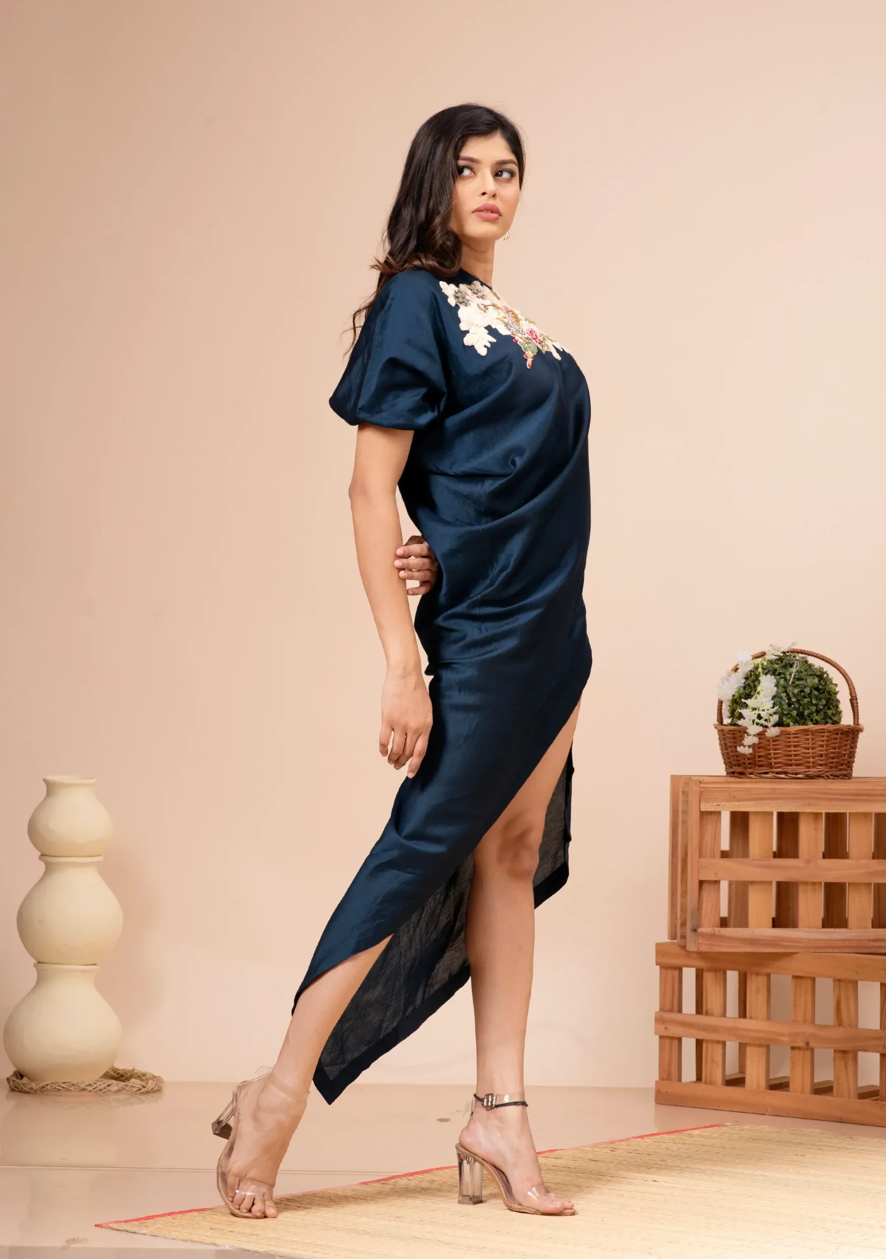 Presenting an exquisite oxford blue chanderi off-shoulder tunic, beautifully hand-embroidered with a delicate floral pattern. This stunning piece combines elegance and artistry.